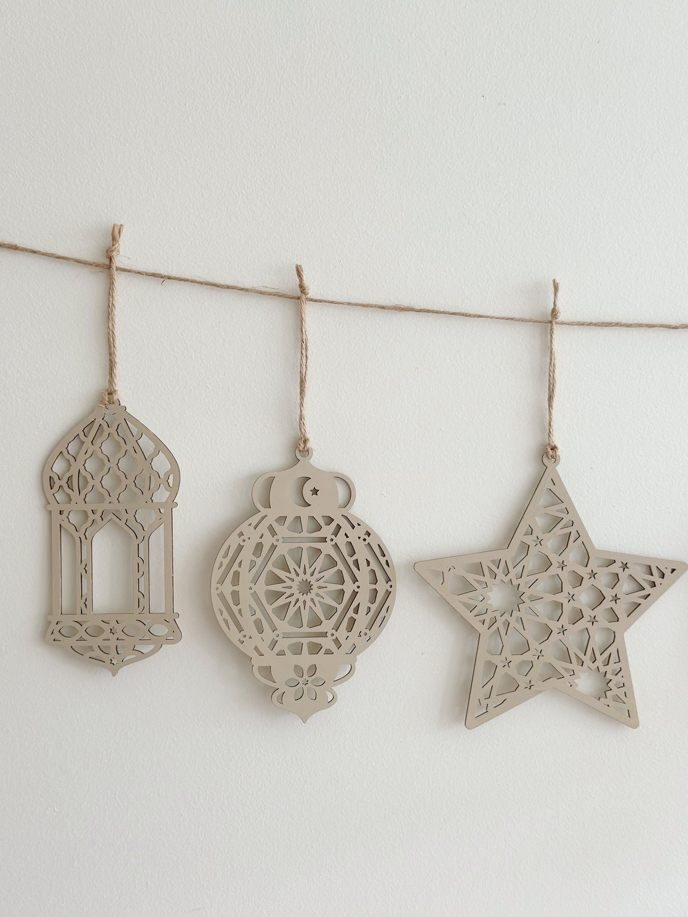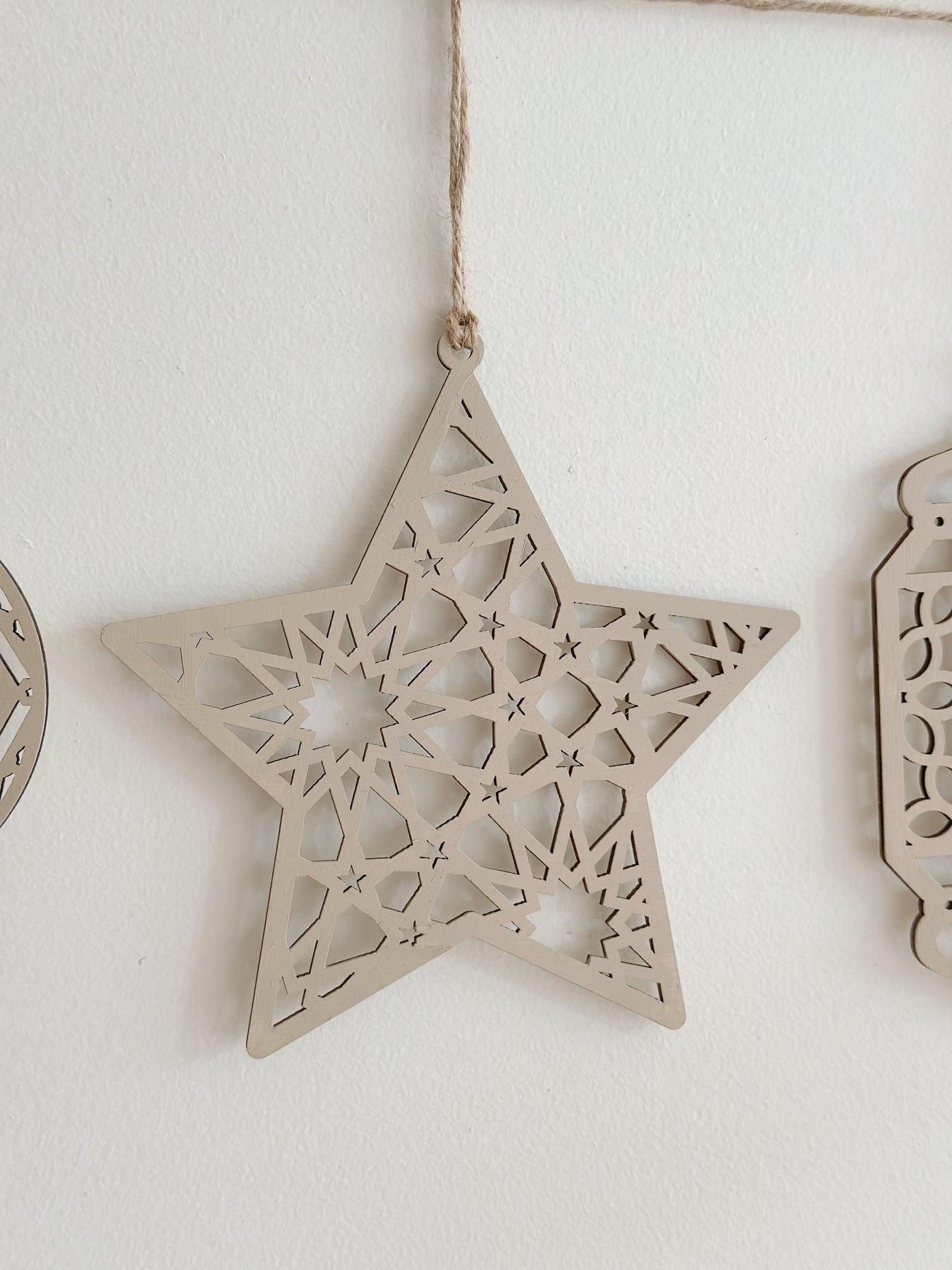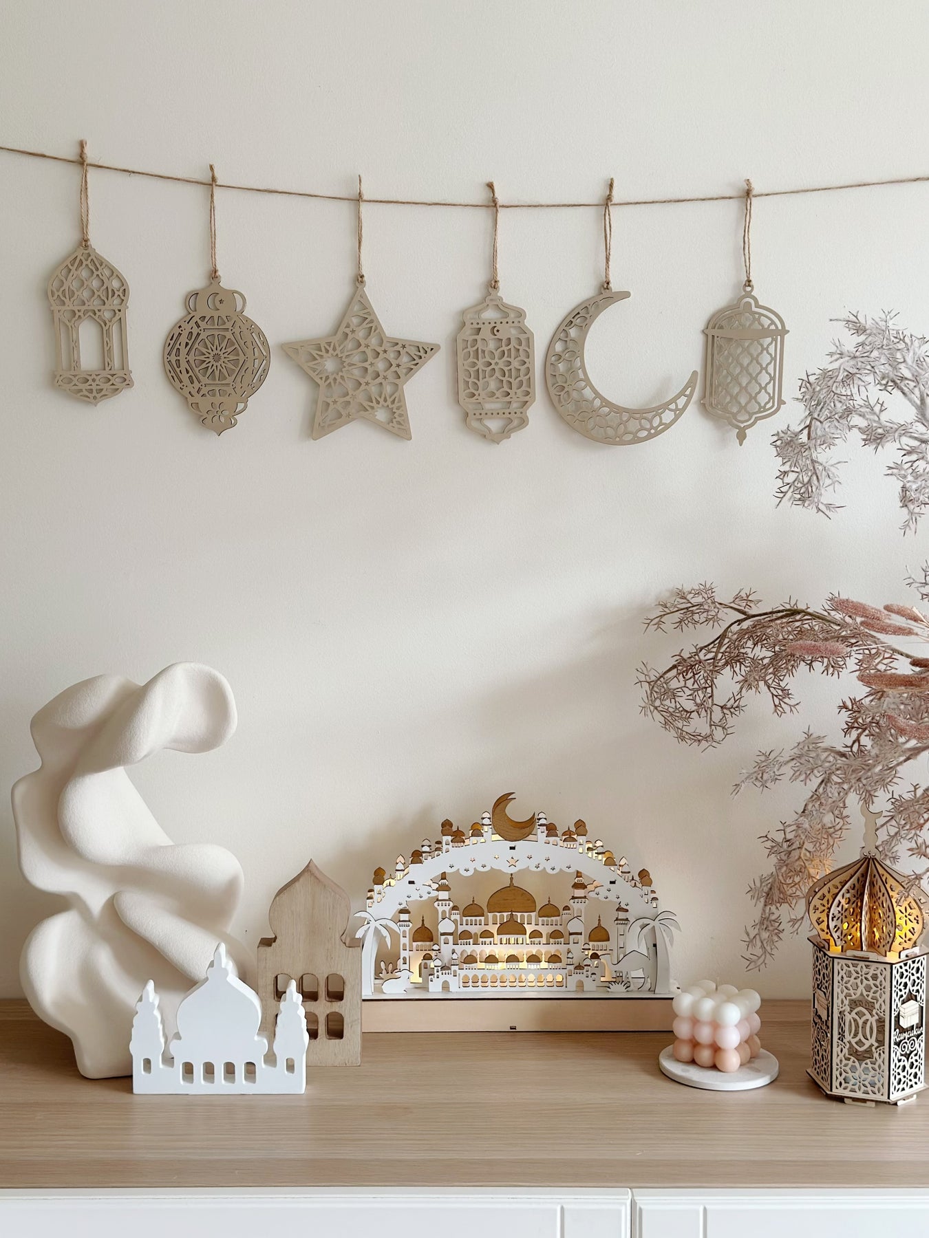 Add a touch of elegance and tradition to your home with the Ethereal Eid Garland, a beautifully crafted wooden decor piece designed to bring warmth and charm to your festive celebrations. Featuring six unique laser-cut designs, including lanterns, crescents, and stars, this garland embodies the spirit of Ramadan and Eid with a timeless, sophisticated look.