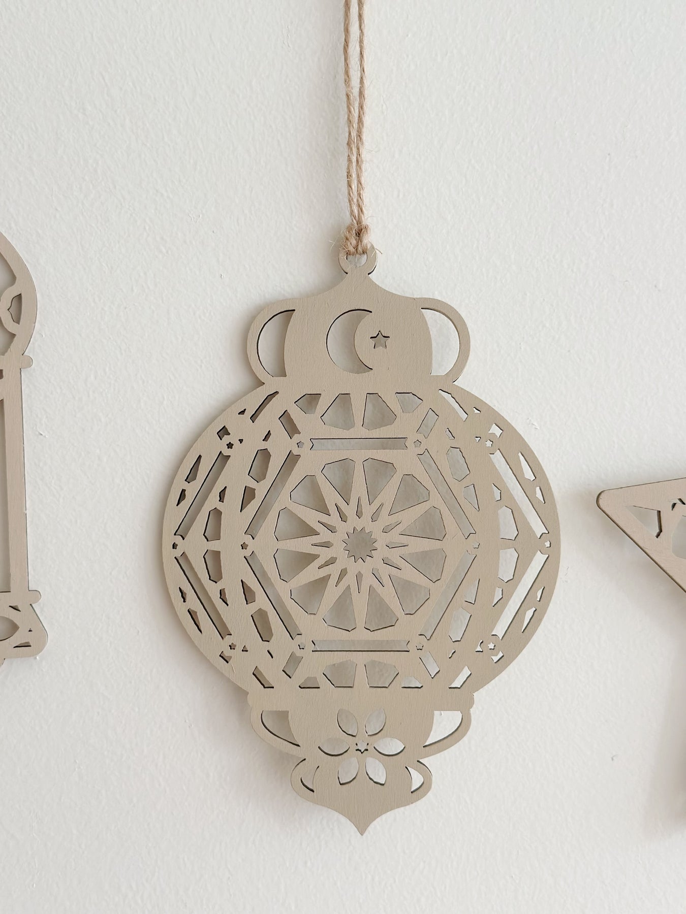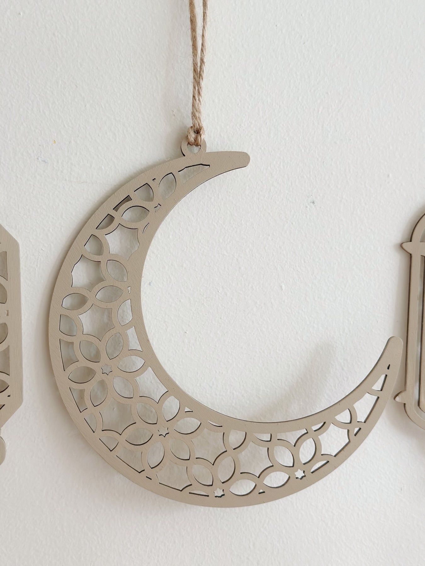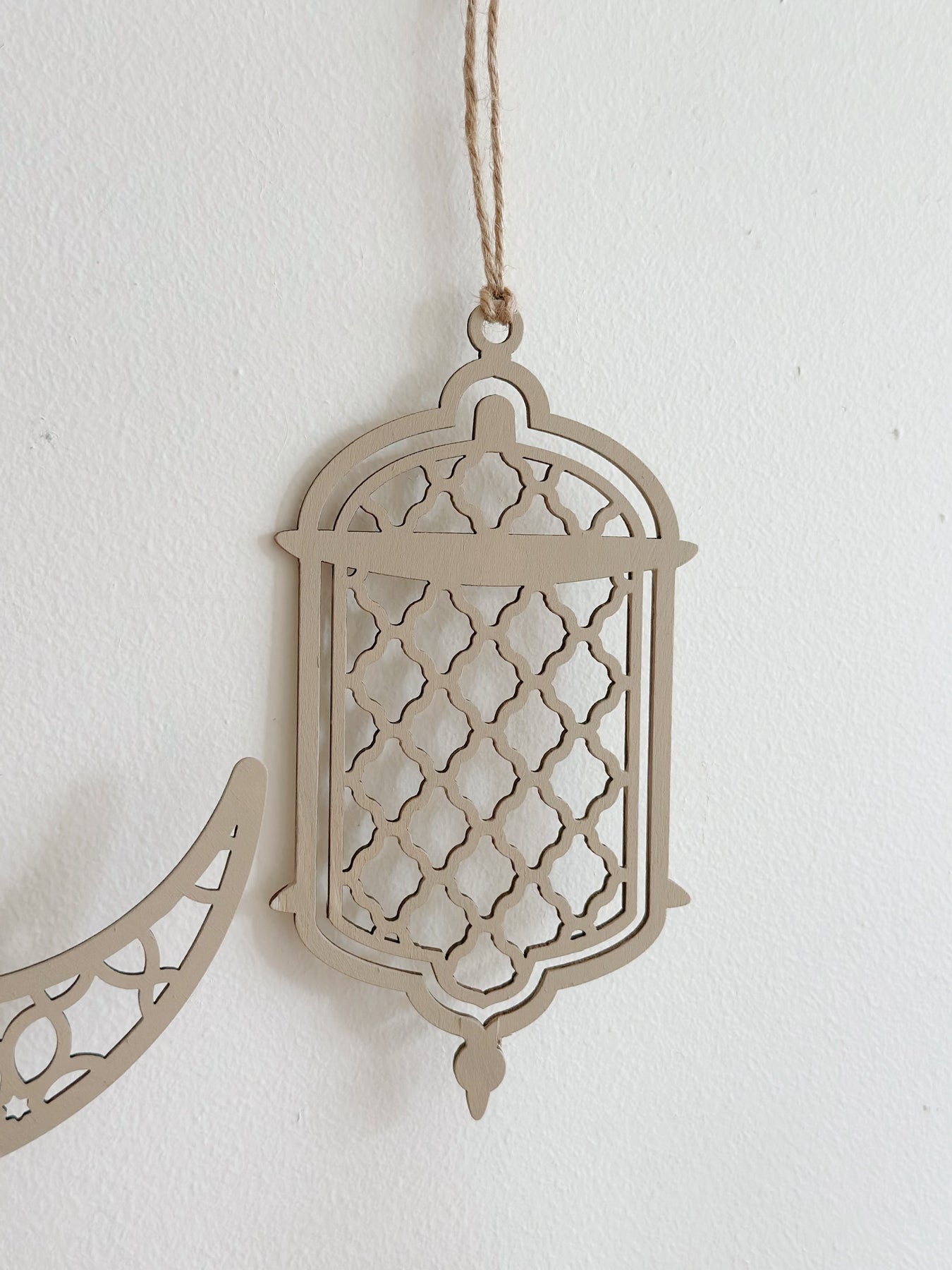 Add a touch of elegance and tradition to your home with the Ethereal Eid Garland, a beautifully crafted wooden decor piece designed to bring warmth and charm to your festive celebrations. Featuring six unique laser-cut designs, including lanterns, crescents, and stars, this garland embodies the spirit of Ramadan and Eid with a timeless, sophisticated look.