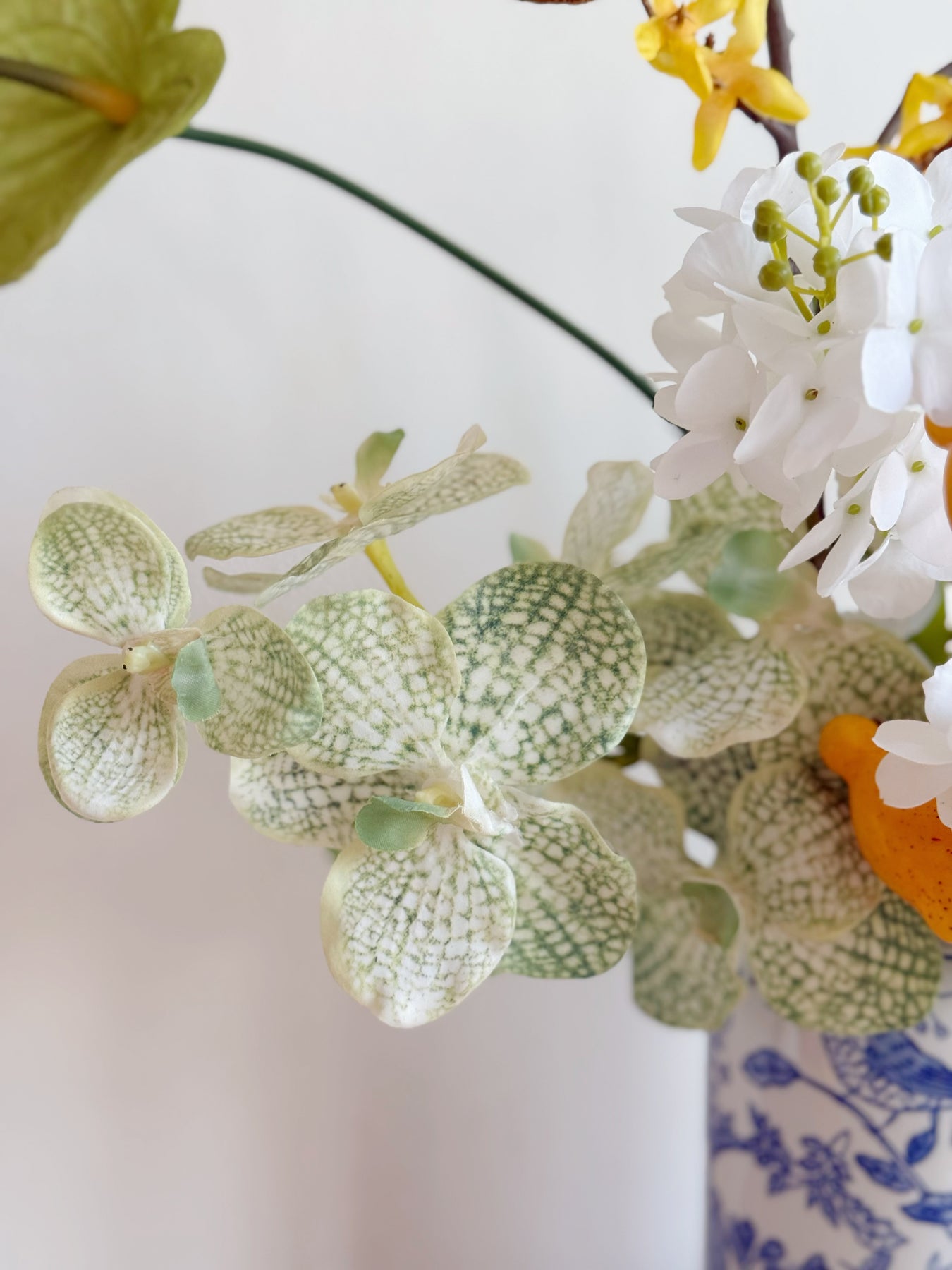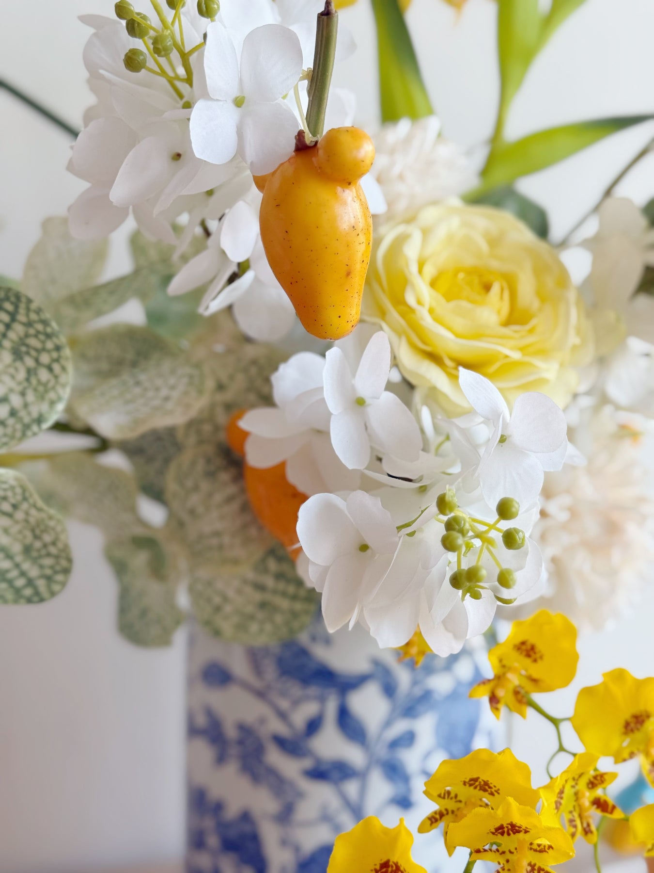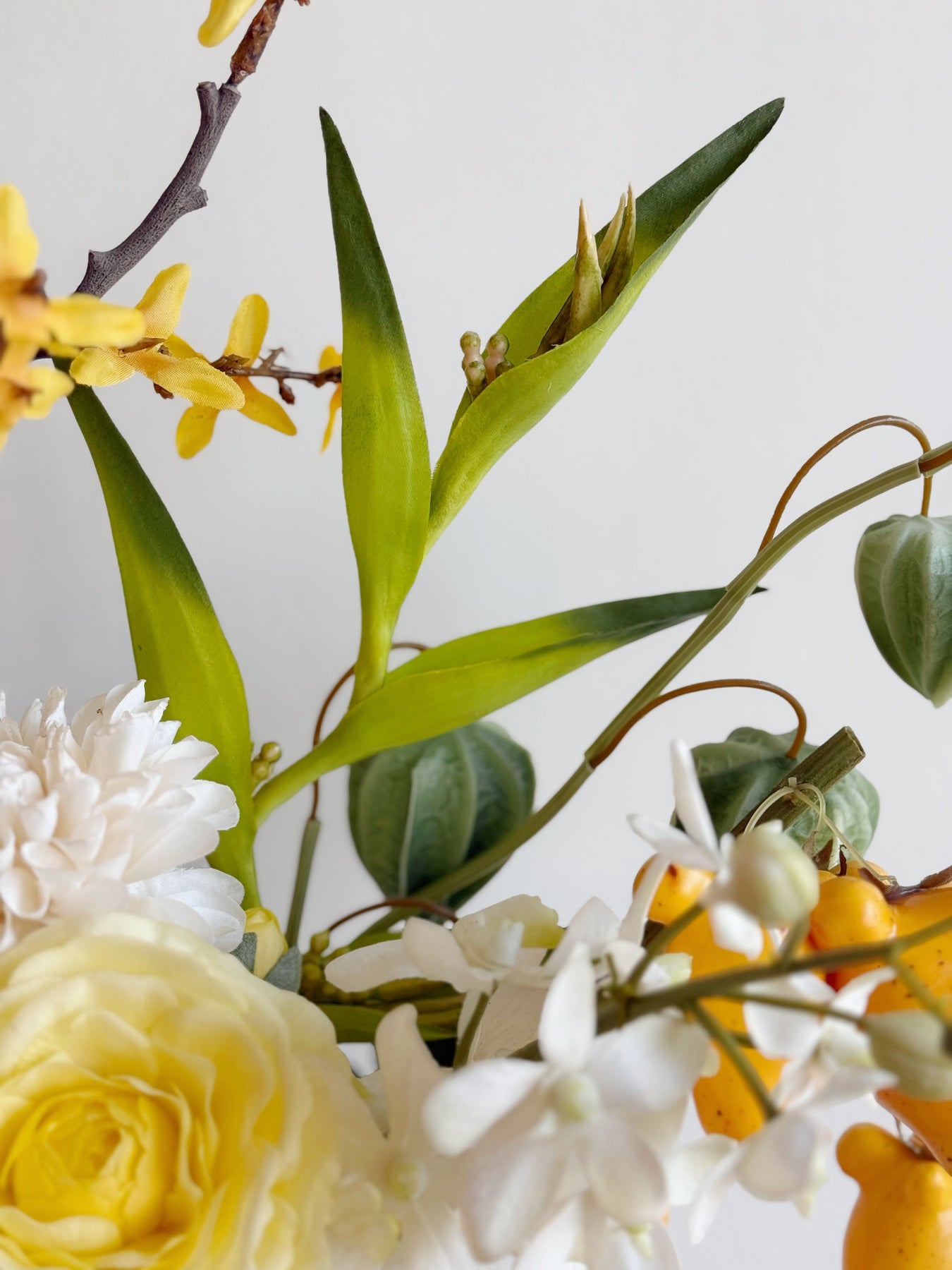 - Includes orchids, hydrangeas, green lantern flower, dancing orchids, yellow 迎春花, yellow ranunculus & green heliconia