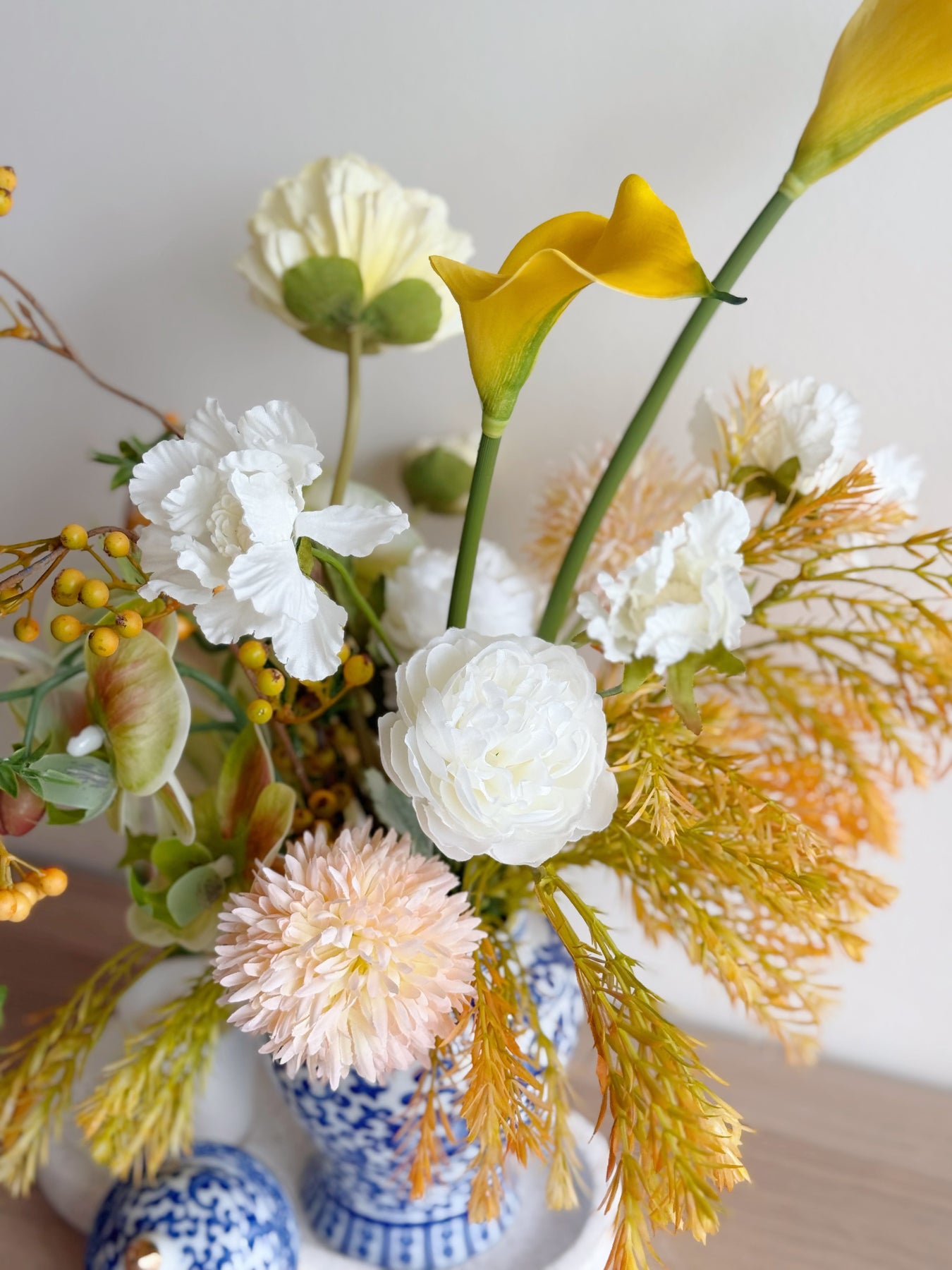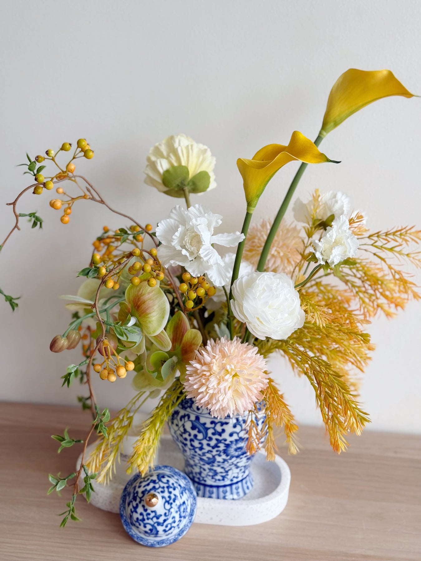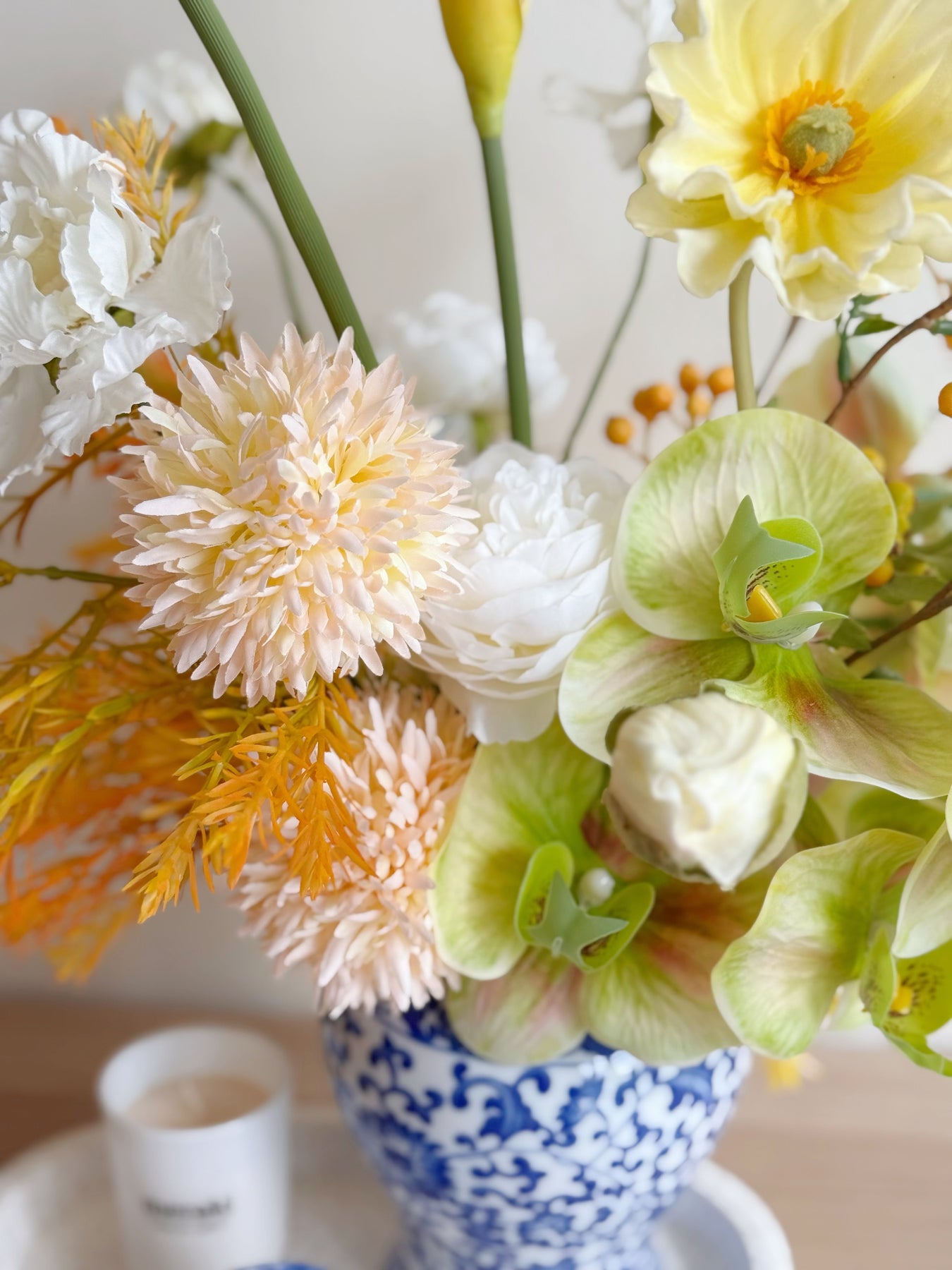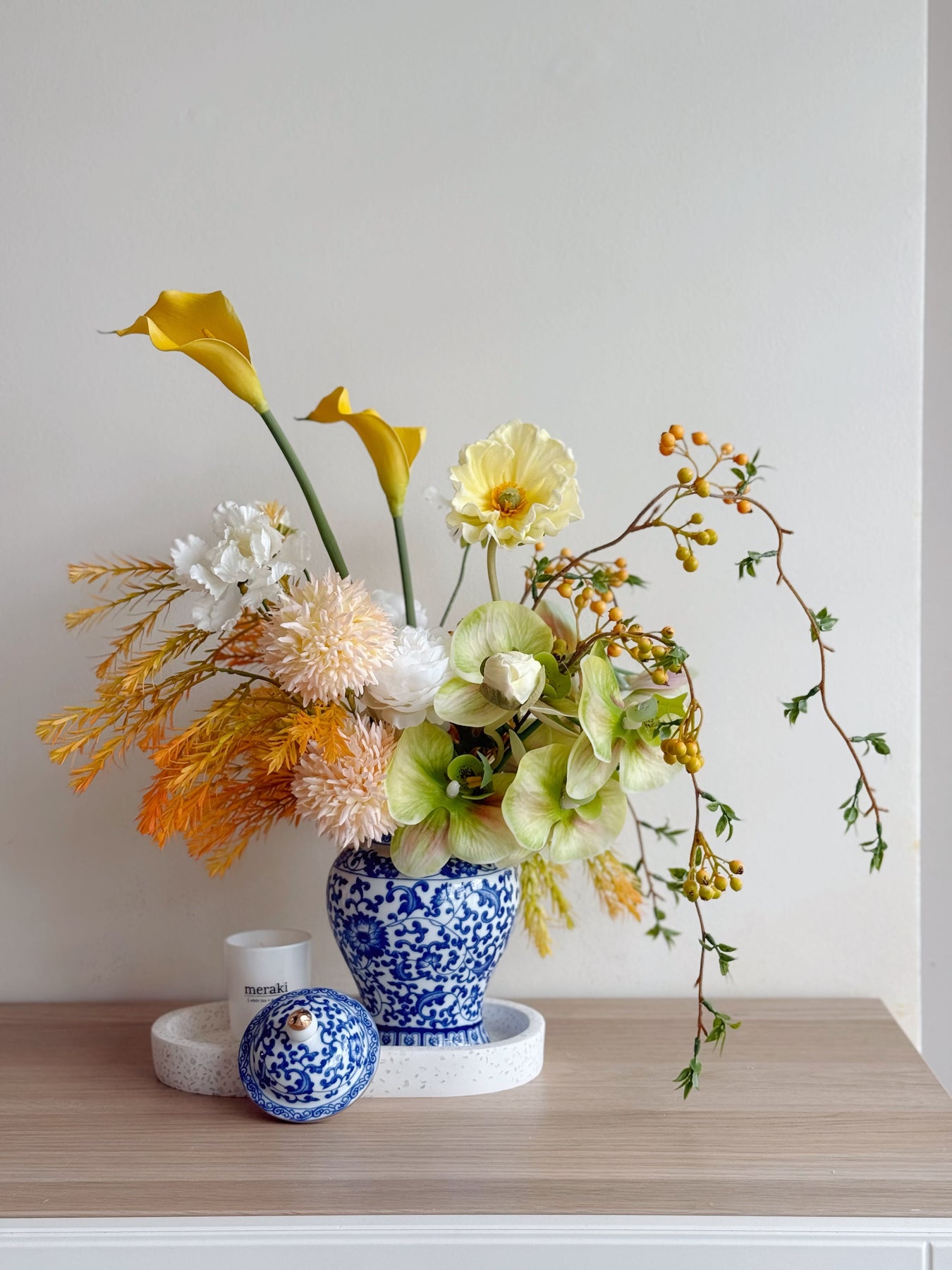 The arrangement is nestled in a classic blue-and-white porcelain jar, lending it a subtle oriental character that feels both timeless and familiar. The intricate patterns of the vessel provide a beautiful contrast to the soft, sunlit palette — grounding the piece while elevating its overall presence.
