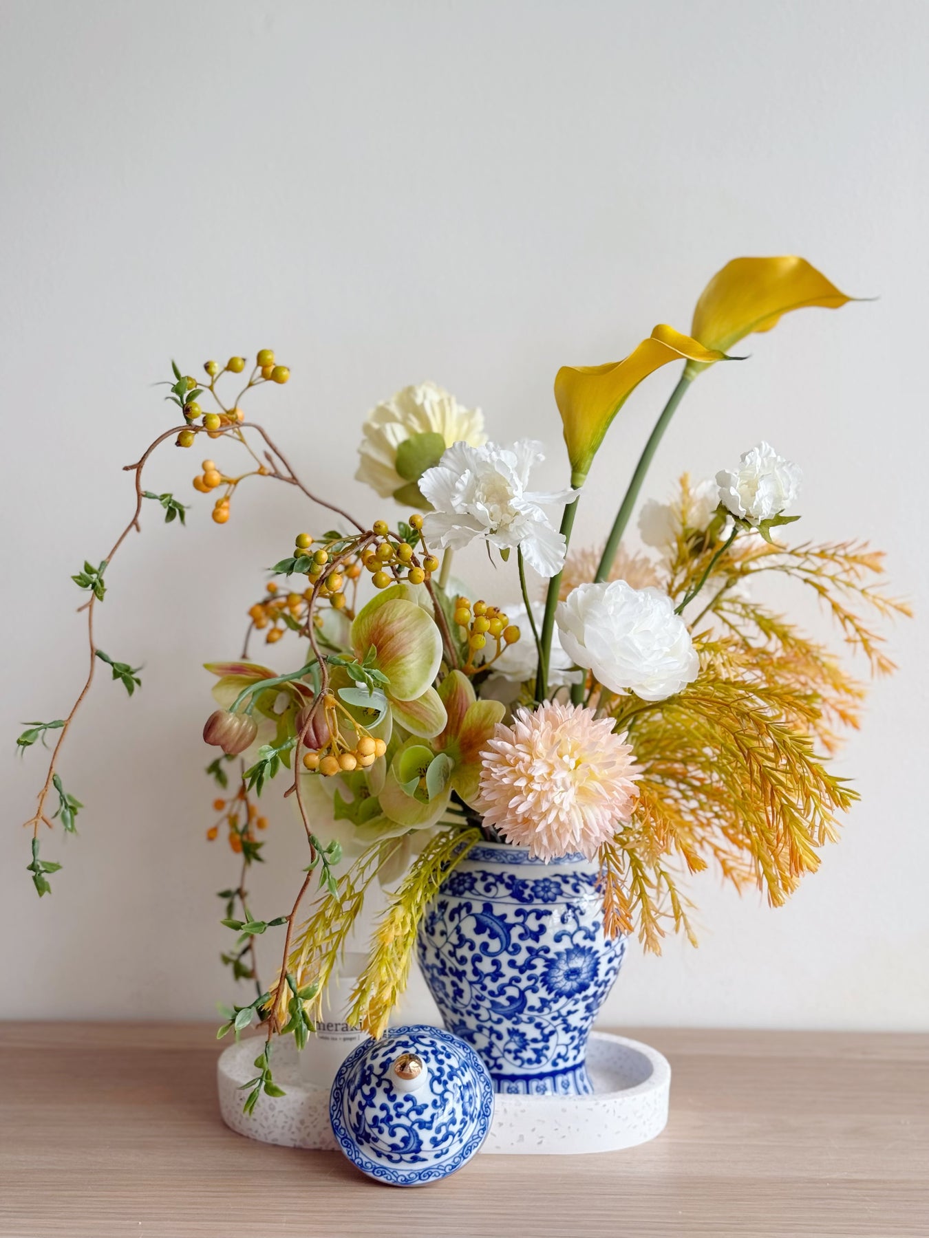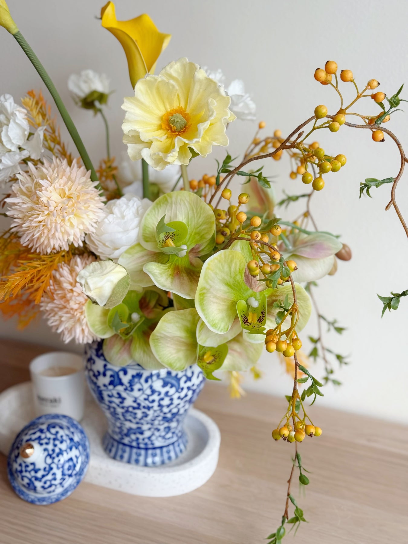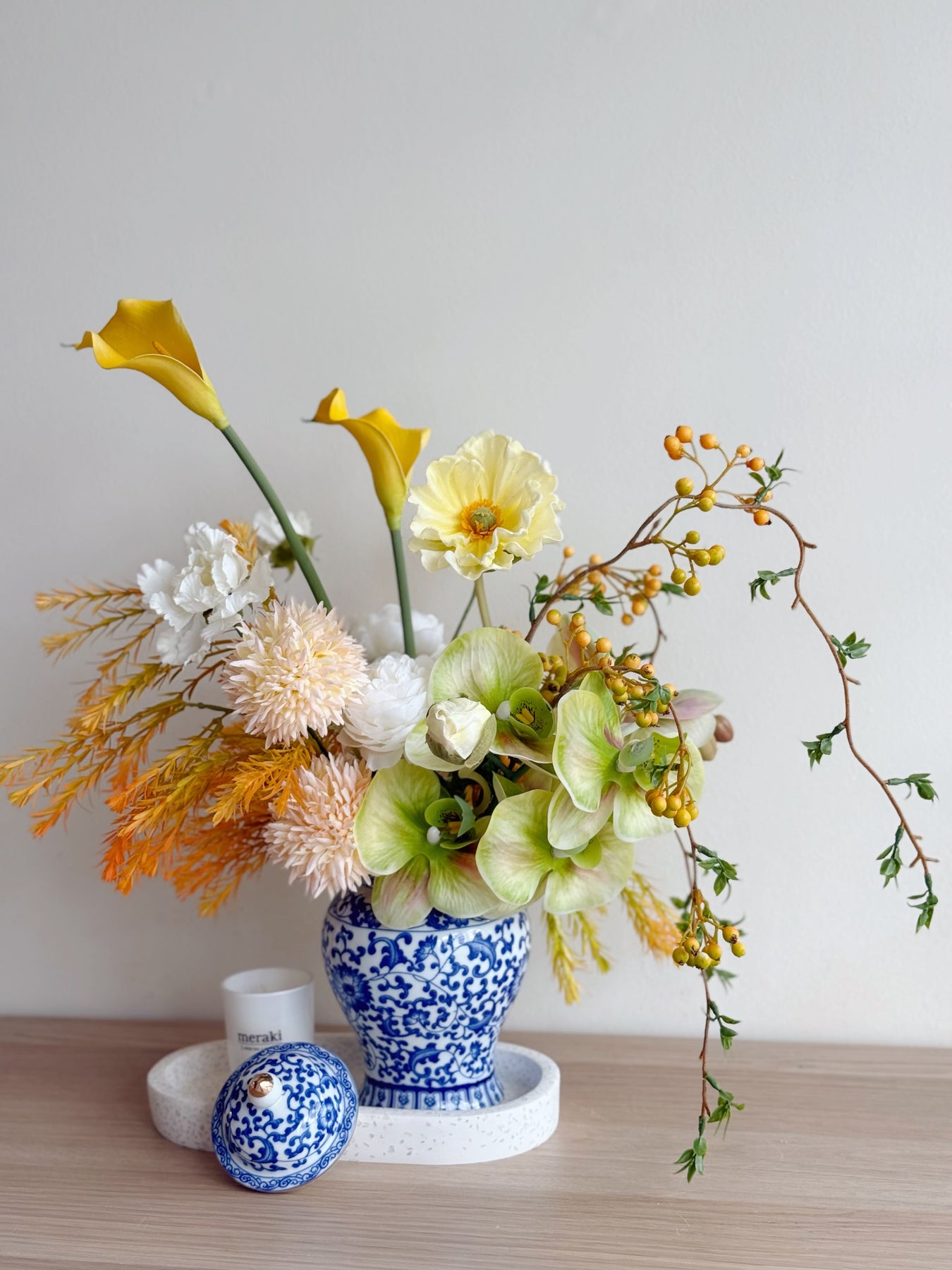 The arrangement is nestled in a classic blue-and-white porcelain jar, lending it a subtle oriental character that feels both timeless and familiar. The intricate patterns of the vessel provide a beautiful contrast to the soft, sunlit palette — grounding the piece while elevating its overall presence.