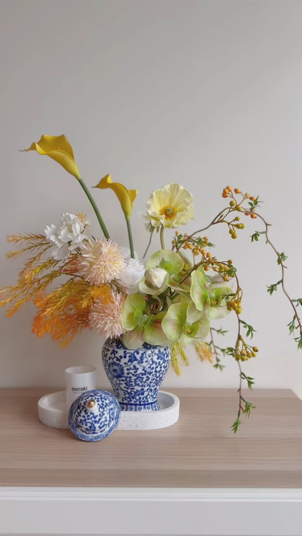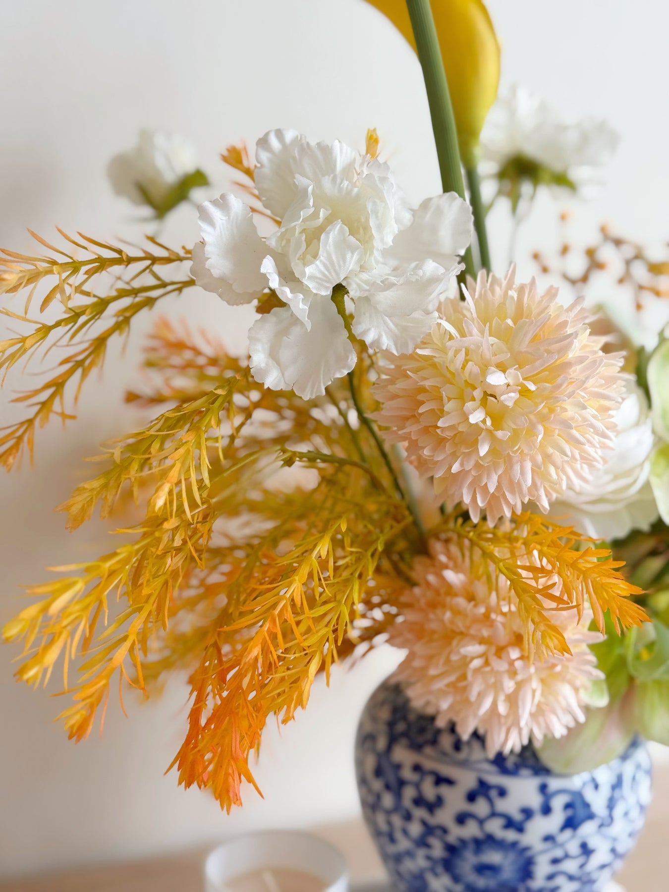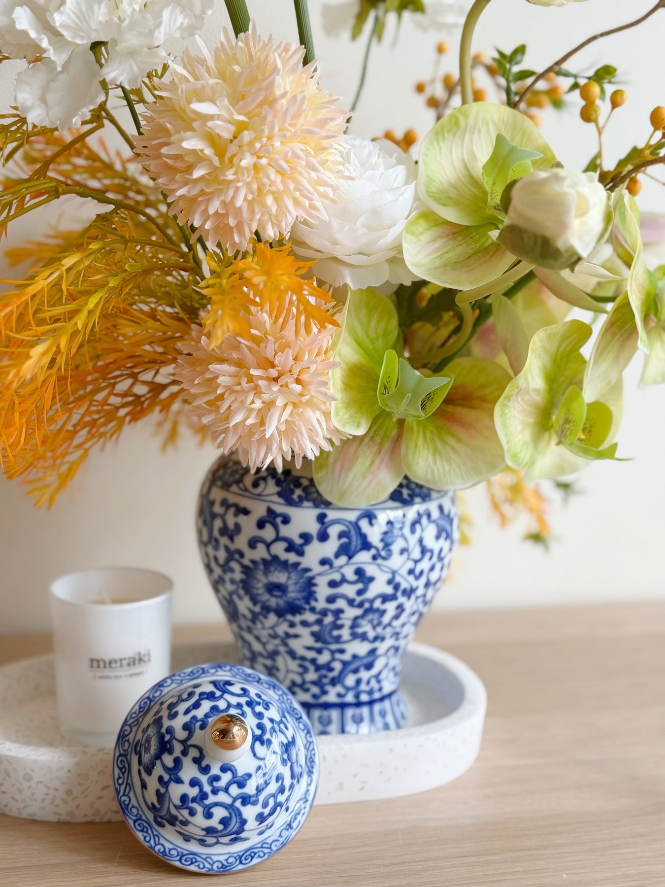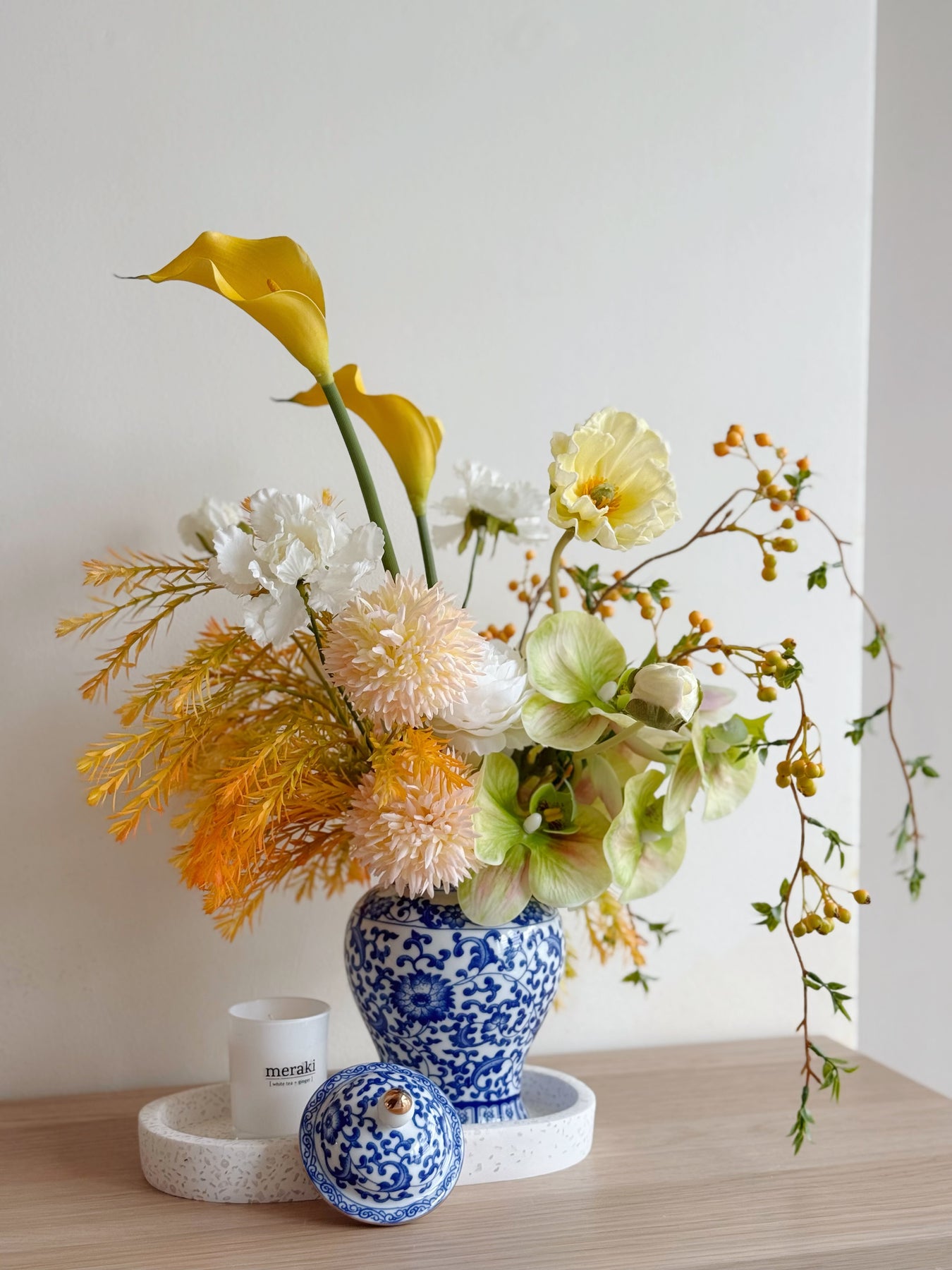 The arrangement is nestled in a classic blue-and-white porcelain jar, lending it a subtle oriental character that feels both timeless and familiar. The intricate patterns of the vessel provide a beautiful contrast to the soft, sunlit palette — grounding the piece while elevating its overall presence.