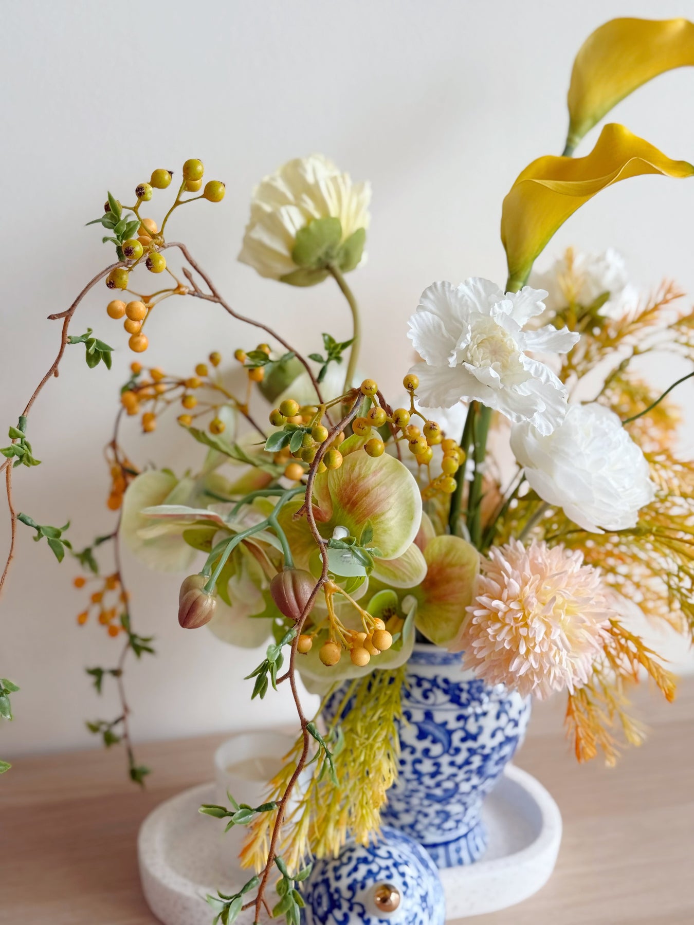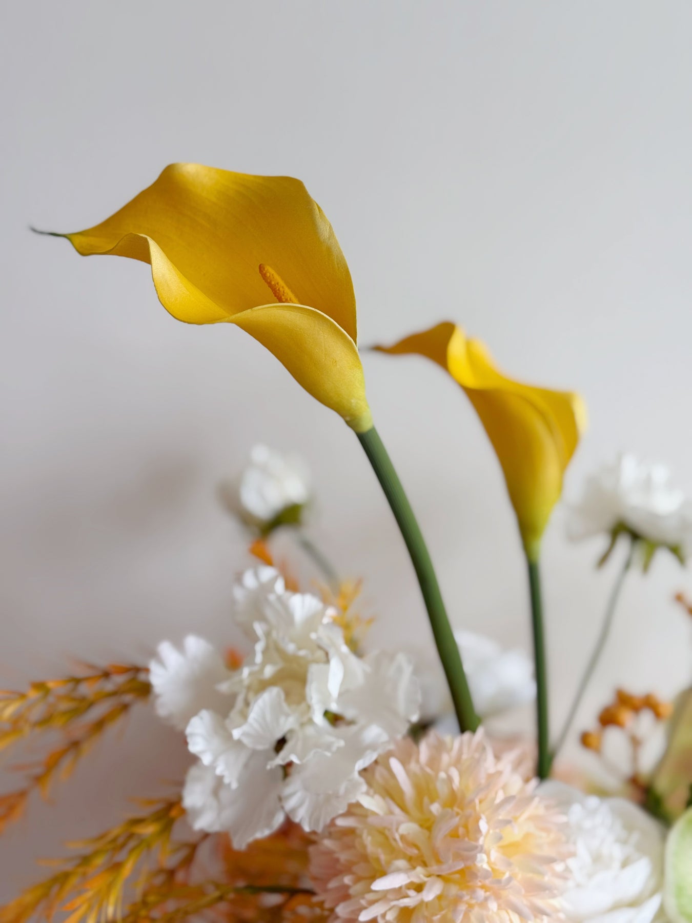 Key elements such as sculptural yellow calla lilies bring height and elegance, while rounded blooms and soft textures add fullness and a sense of quiet richness. Trailing berry branches introduce a touch of playfulness and organic charm, enhancing the overall sense of life and abundance.
