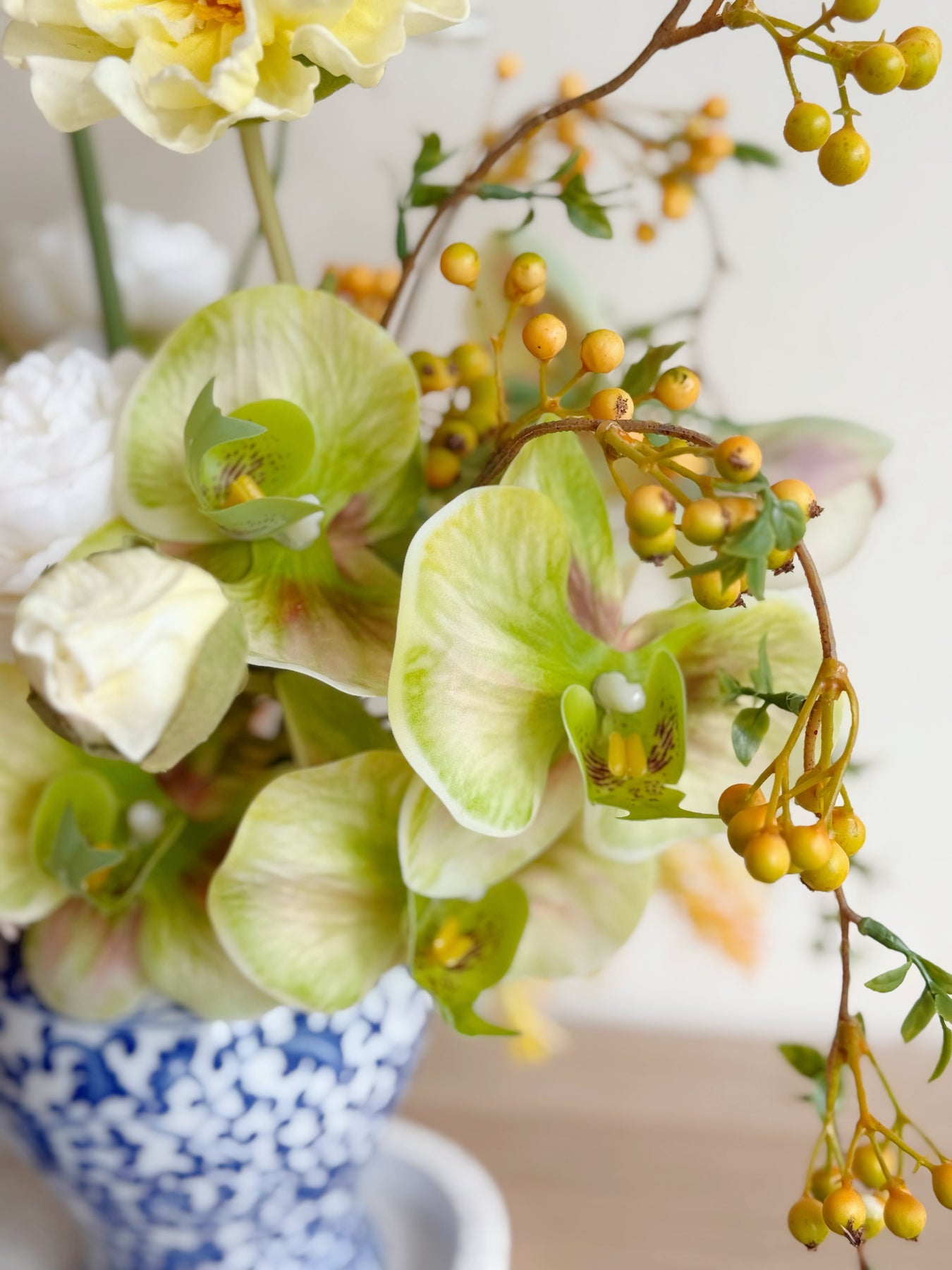 Designed as a fully 2-sided arrangement, every angle is thoughtfully styled, allowing it to be placed at the centre of a table or in open spaces where its form can be appreciated all around. Flowing stems, airy florals, and gently arching branches give the piece its signature movement — expressive, light, and effortlessly graceful.