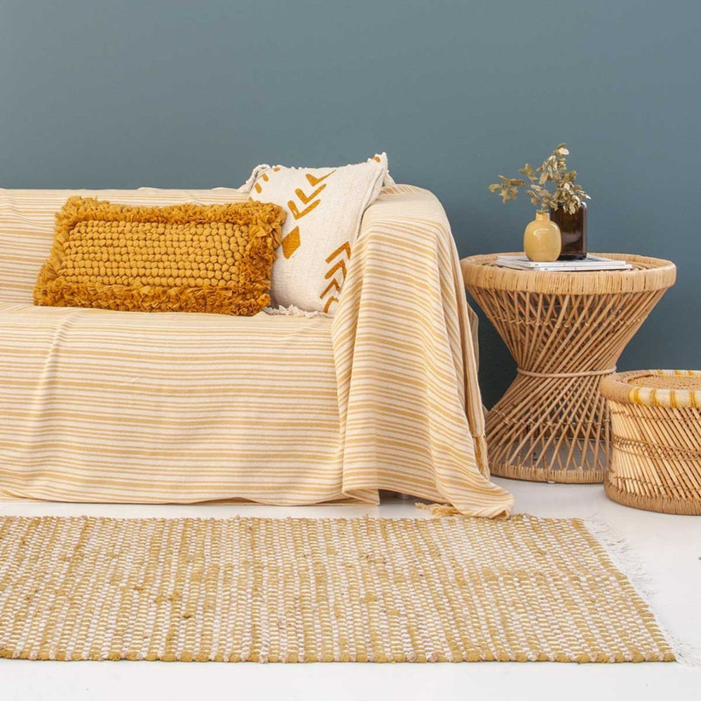 This beautiful textured cream cotton Chindi rug hand woven with jute rug forms a beautiful natural coloured geometric pattern which adds a cozy Bohemian feel to your home. It is ideal to be used in bedroom or living room.