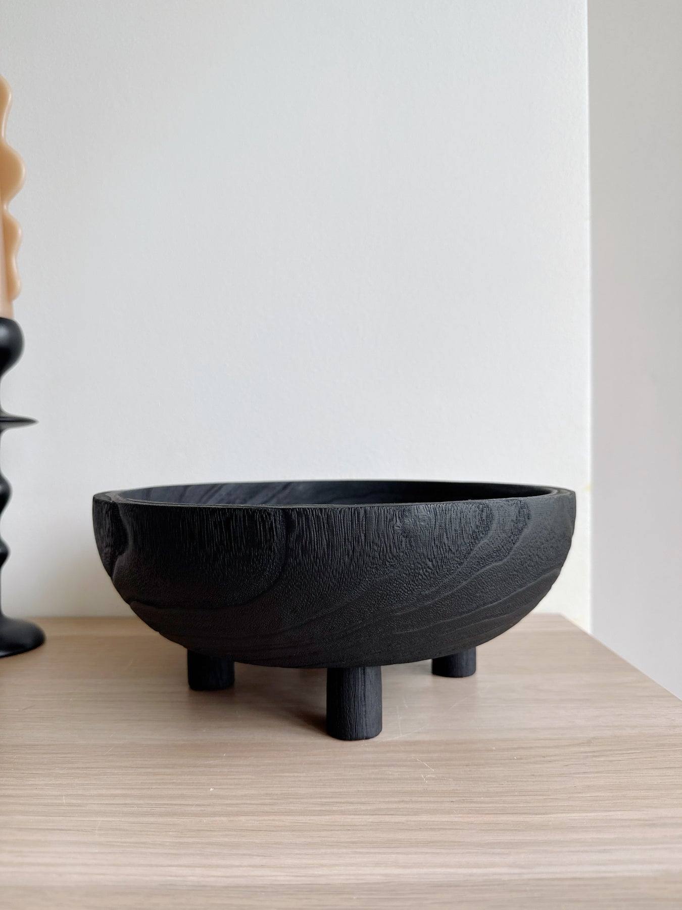 Crafted from carbonised paulownia wood, the Charred Grove Pedestal Bowl features a rich matte black finish that highlights the natural grain of the wood. Subtle carved rings inside the bowl create a beautiful layered texture, giving the piece depth while preserving its organic, handcrafted feel.