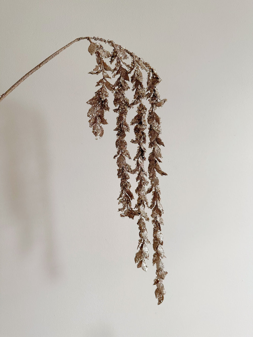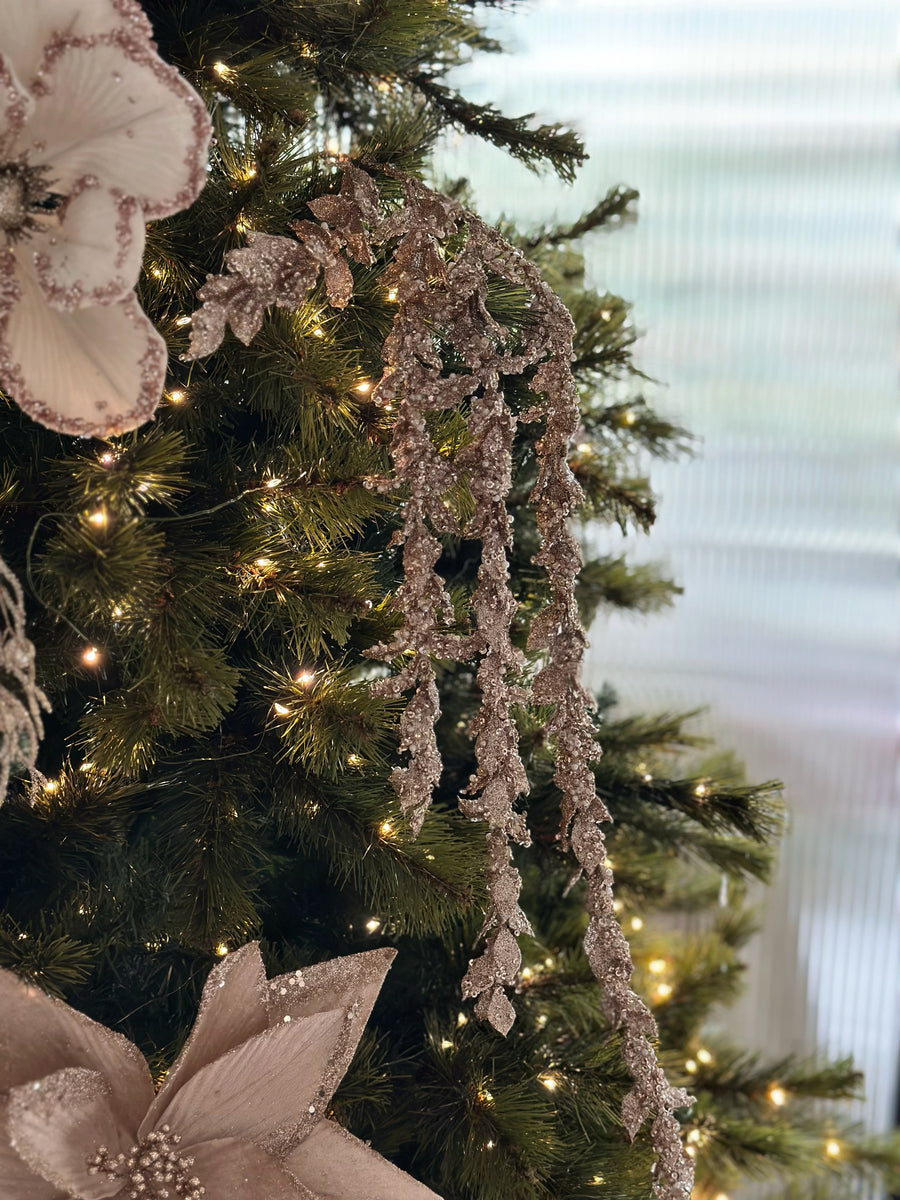 Add a touch of opulence to your festive decor with our Glittered Champagne Cascade Leaf Branch. This exquisite branch features cascading leaves, each coated in luxurious champagne golden glitter and delicately adorned with tiny, sugary beads for an extra sparkle. Perfect for draping over your holiday tree, adorning wreaths, or as a statement piece in any seasonal arrangement, this branch brings elegance and glamour to any setting. Its graceful cascade and radiant shimmer catch the light beautifully, making it a stunning addition to your Christmas decor. Embrace the magic of the season with this dazzling touch of sophistication.