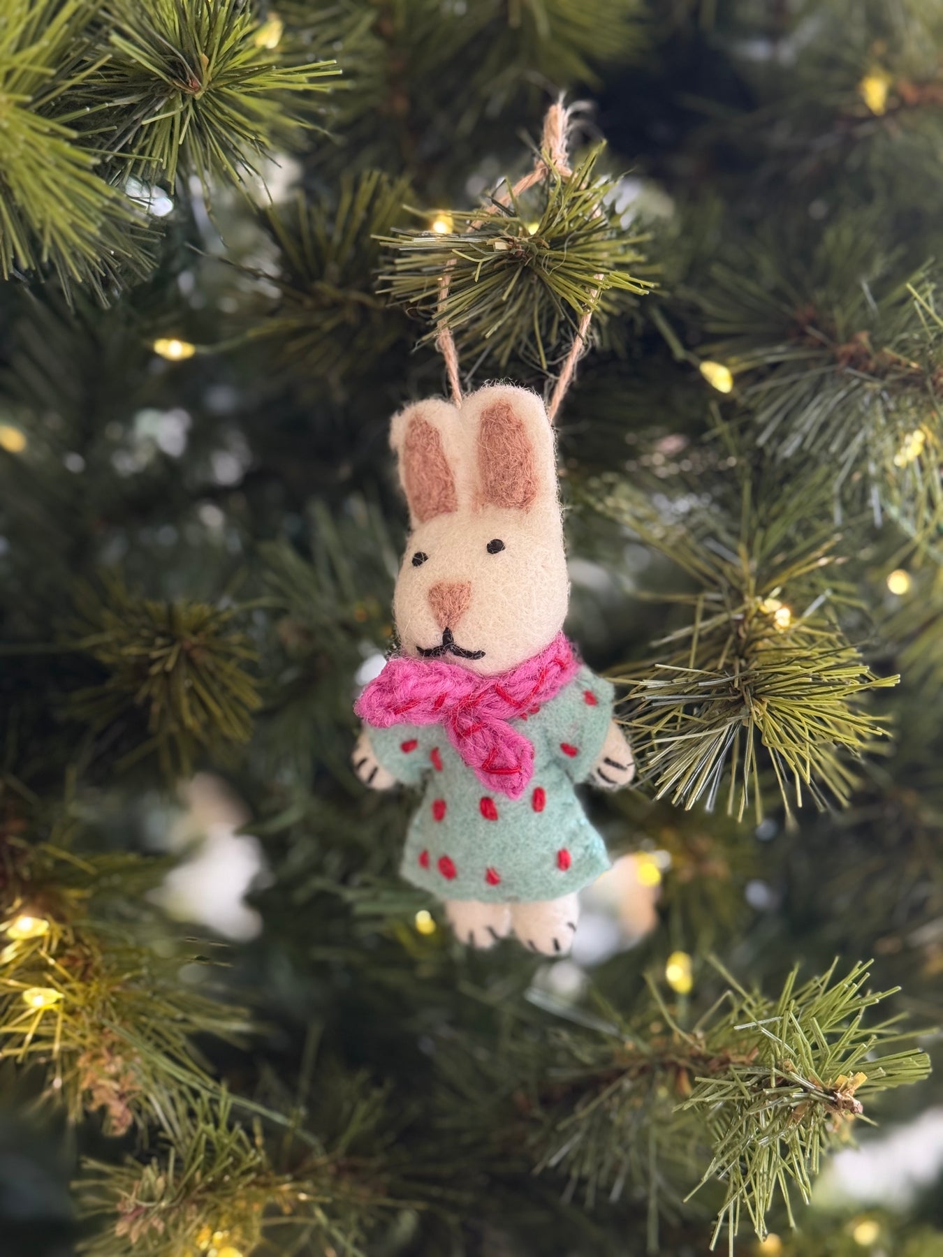 Sweet and full of charm, this handmade felt bunny is dressed in a mint-green dress sprinkled with red berry dots and finished with a cozy pink scarf. Crafted with care from soft wool felt, it brings a delightful pop of colour and warmth to your Christmas tree.