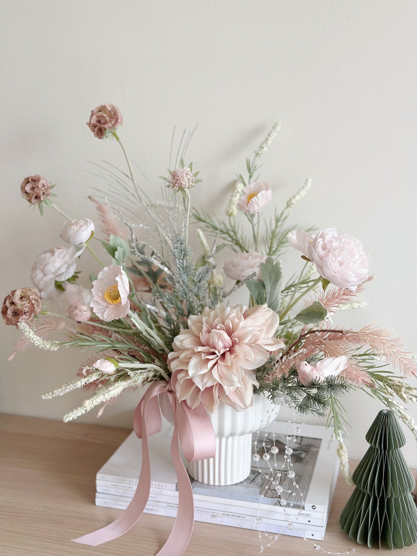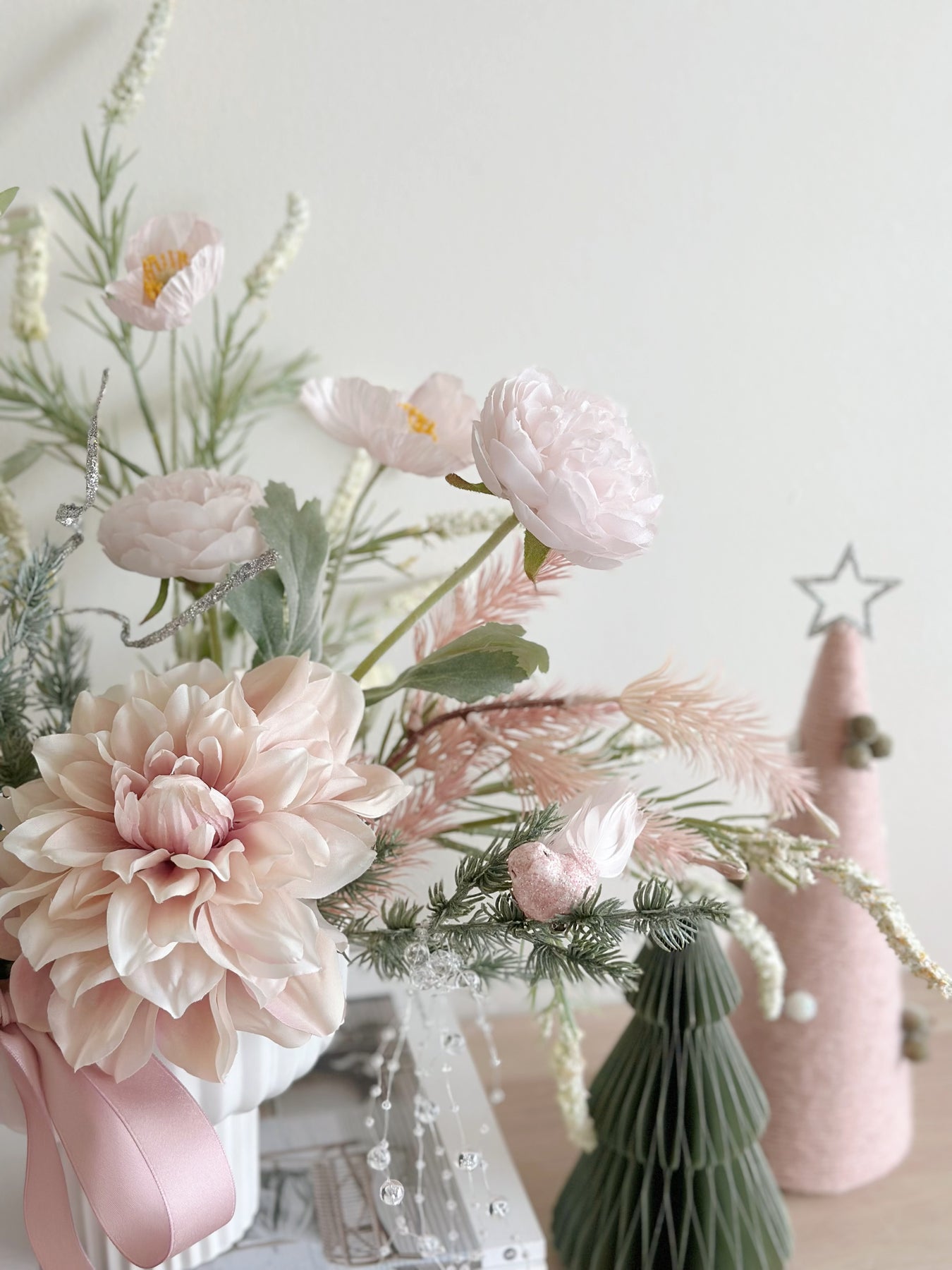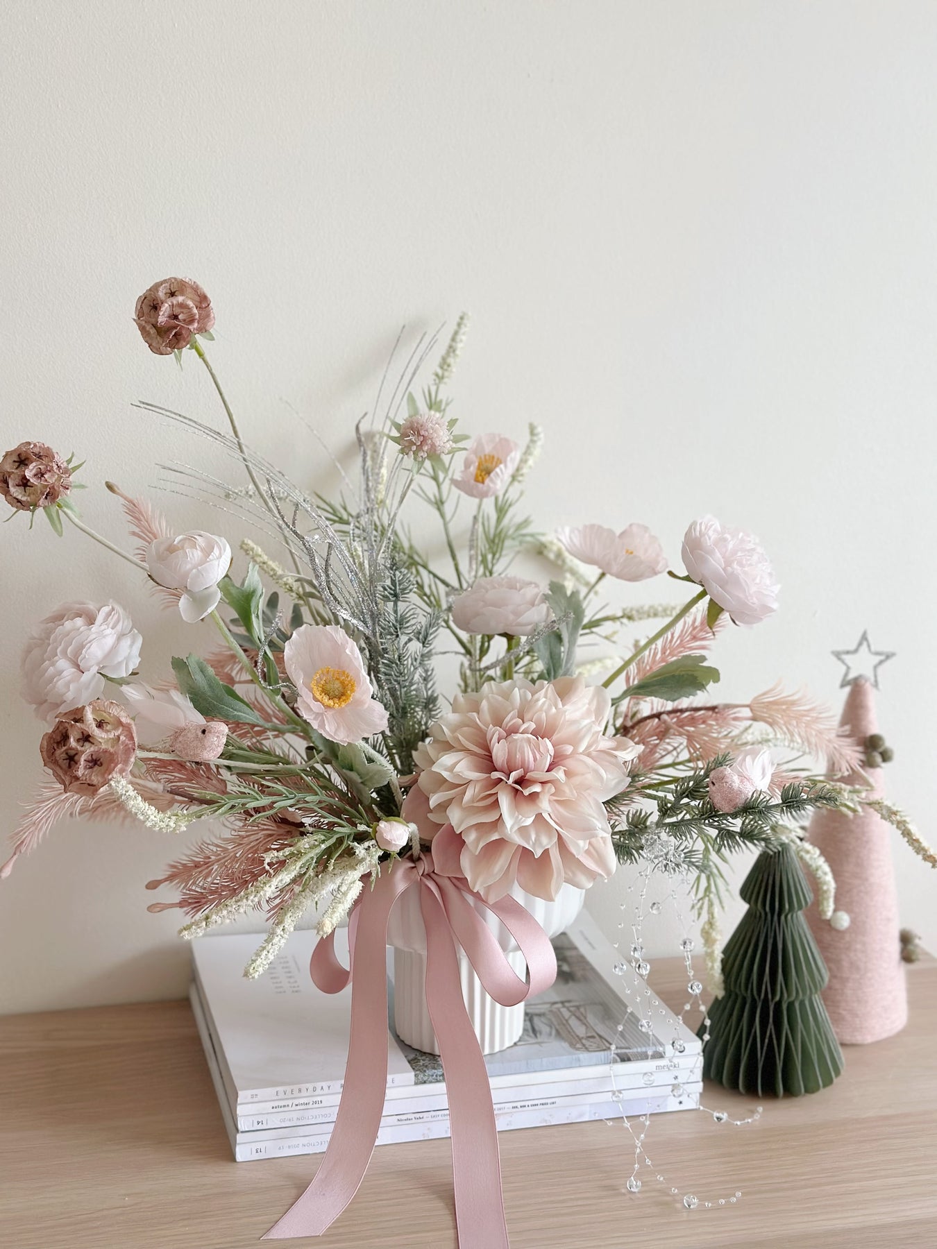 This delicate front-facing faux flower arrangement brings a breath of soft elegance to your holiday décor. Nestled in a white porcelain flowerpot with fluted details, it perfectly combines hues of blush pink, champagne, and winter greenery, creating a serene festive display. The arrangement features blooming dahlias, soft peonies, and dainty anemones, elegantly complemented by silvery accents and frosted pine sprigs for a touch of seasonal sparkle.