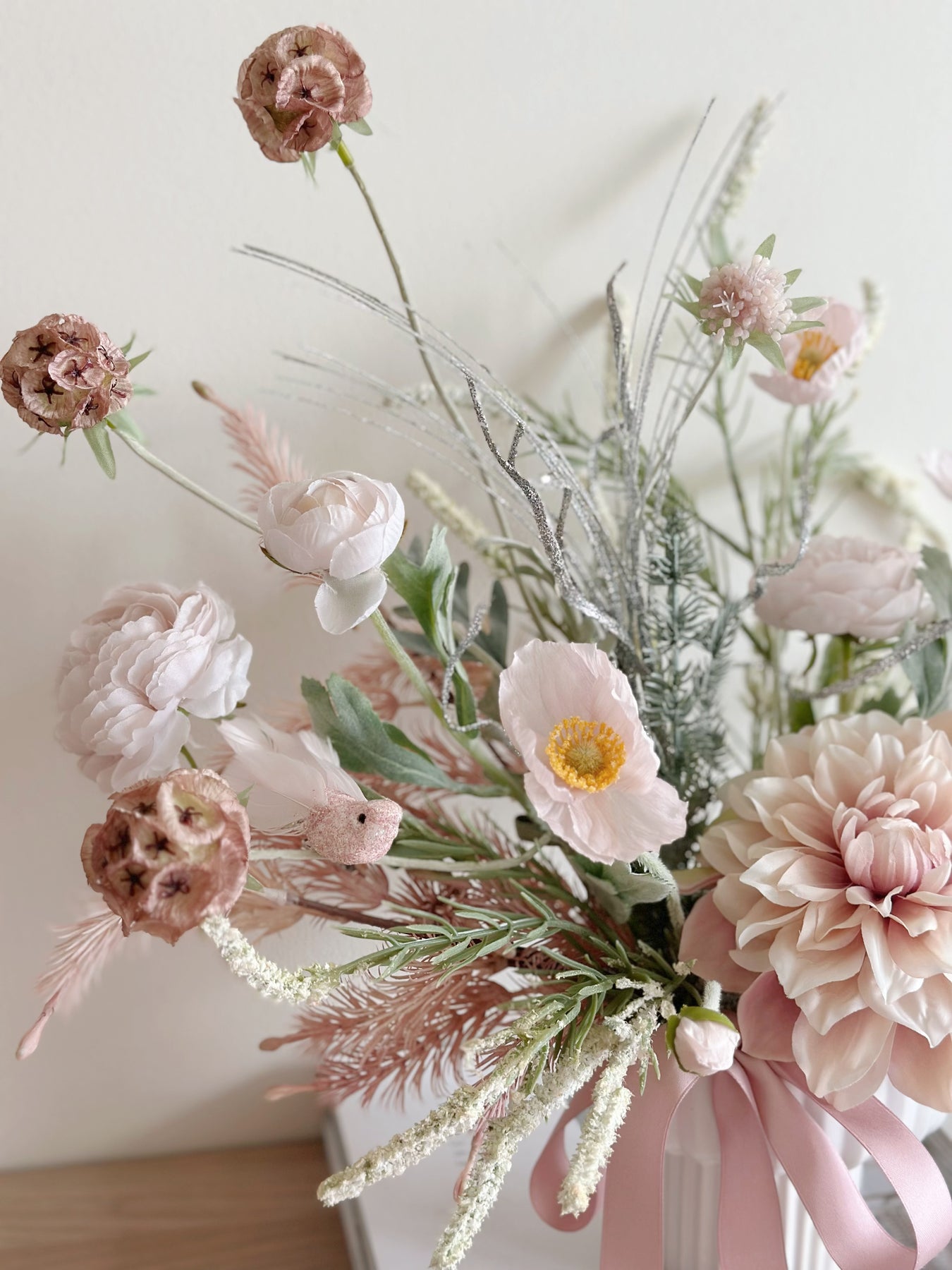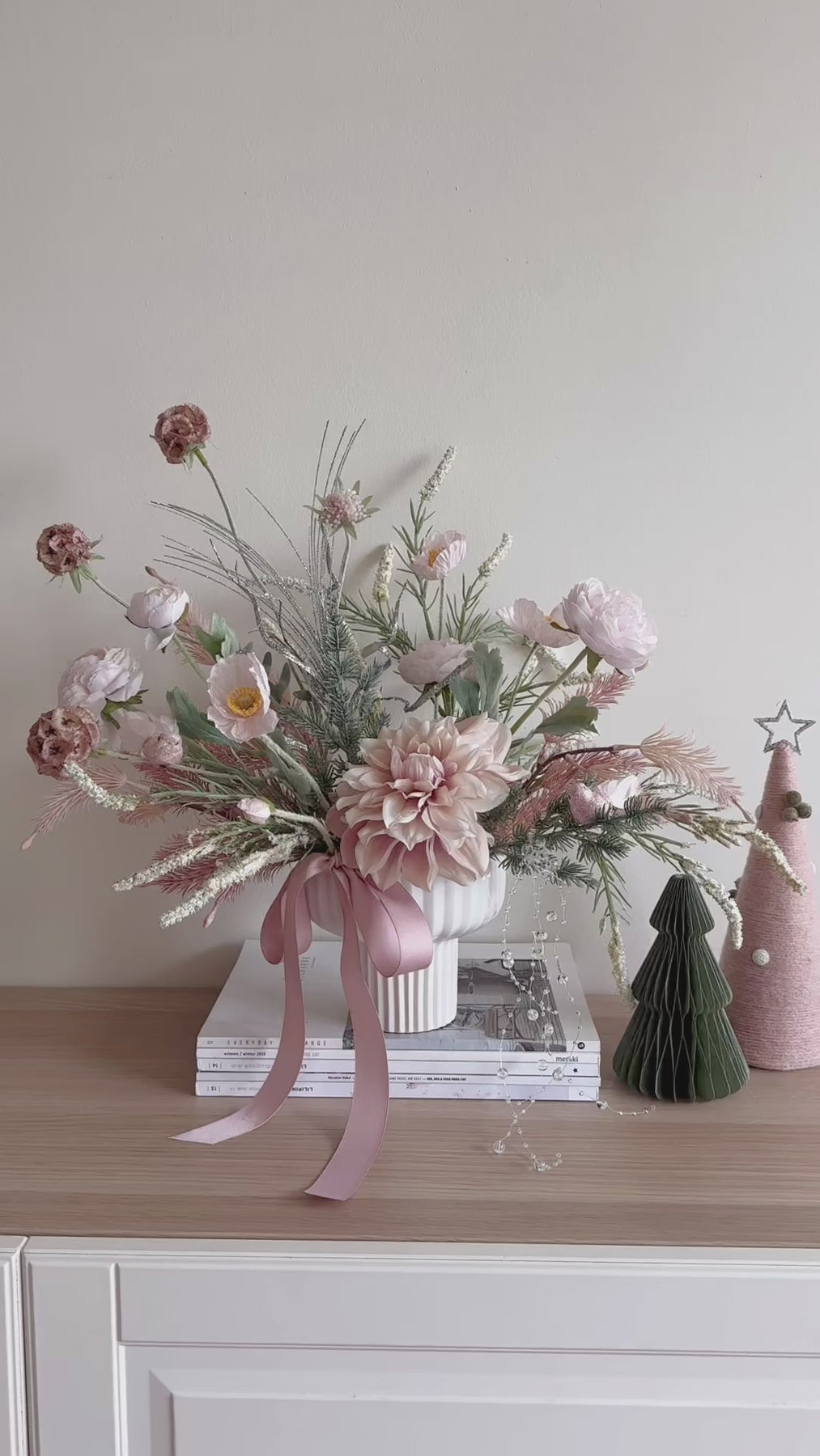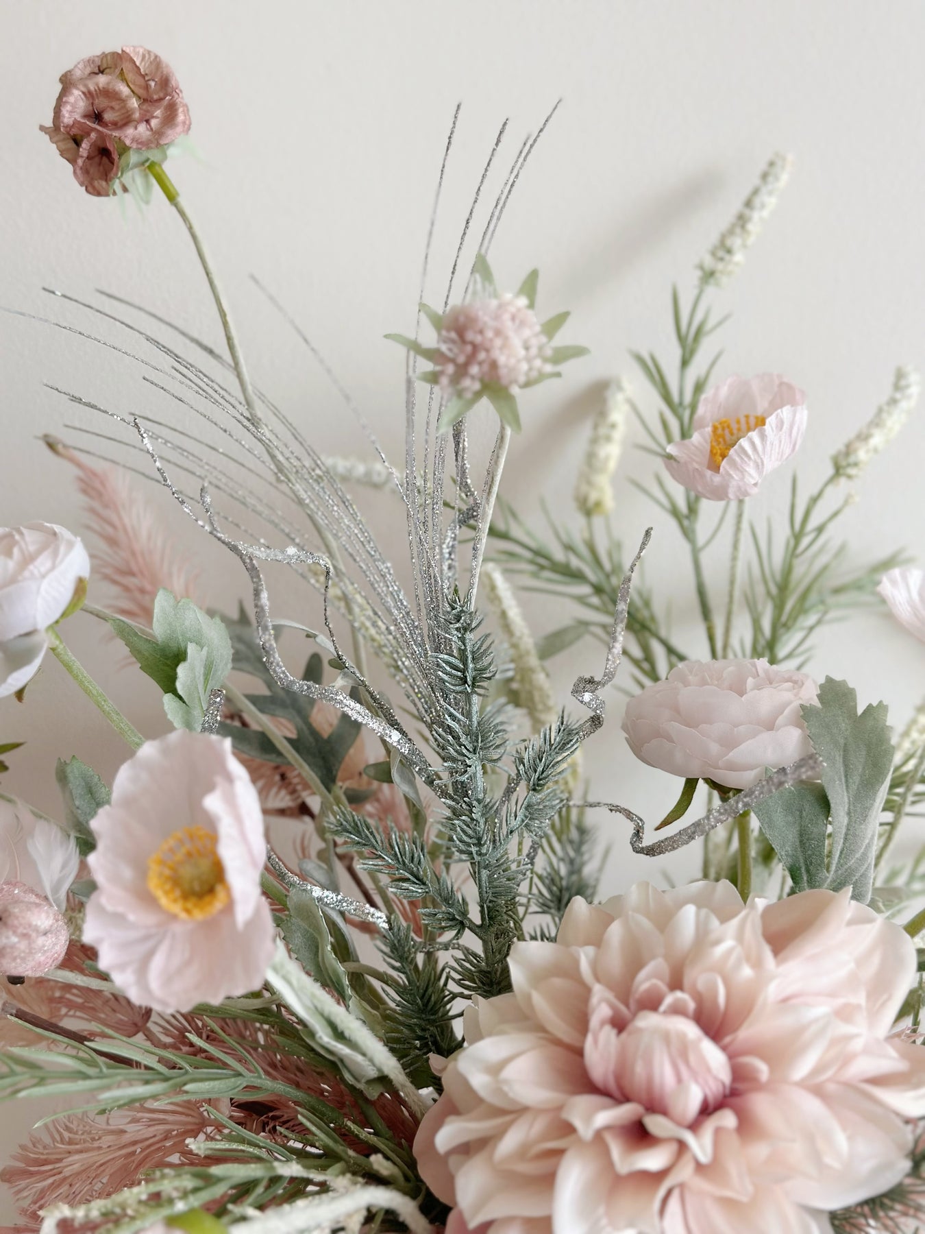 This delicate front-facing faux flower arrangement brings a breath of soft elegance to your holiday décor. Nestled in a white porcelain flowerpot with fluted details, it perfectly combines hues of blush pink, champagne, and winter greenery, creating a serene festive display. The arrangement features blooming dahlias, soft peonies, and dainty anemones, elegantly complemented by silvery accents and frosted pine sprigs for a touch of seasonal sparkle.