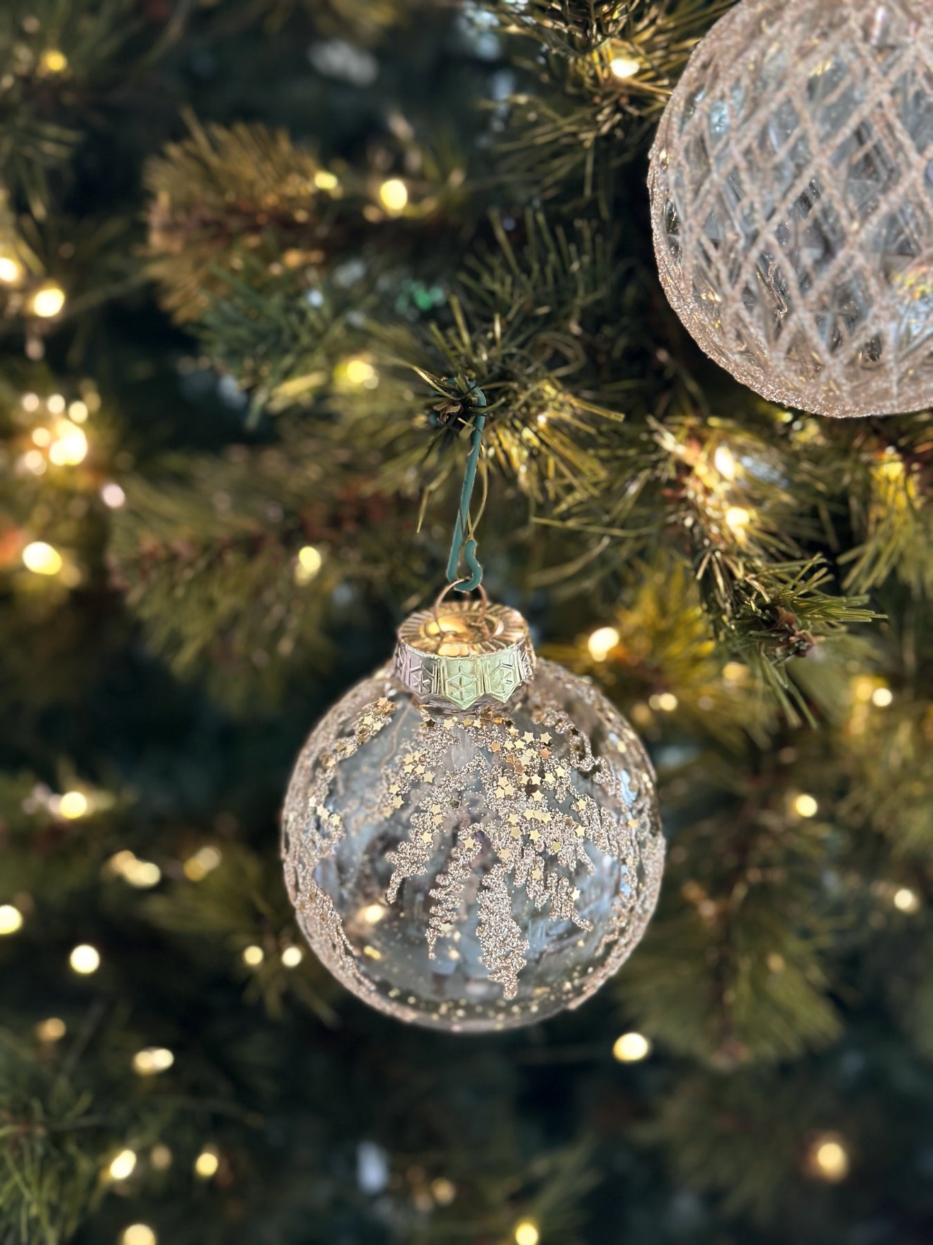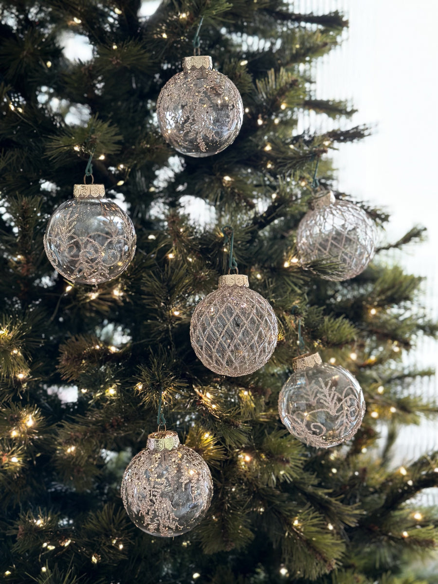 Introducing the Champagne Elegance Bauble Set, a stunning collection of 9 transparent baubles featuring intricate champagne gold glitter patterns. With three distinct designs, this set brings a touch of refined glamour to your holiday decor. Each bauble is crafted from lightweight PET plastic, ensuring durability while maintaining a delicate, sophisticated appearance. Perfect for adding a luxurious sparkle to your tree or festive displays, this set offers timeless beauty that complements any holiday theme. Each box includes 3 baubles of each design, making it an ideal choice for elevating your seasonal decorations.