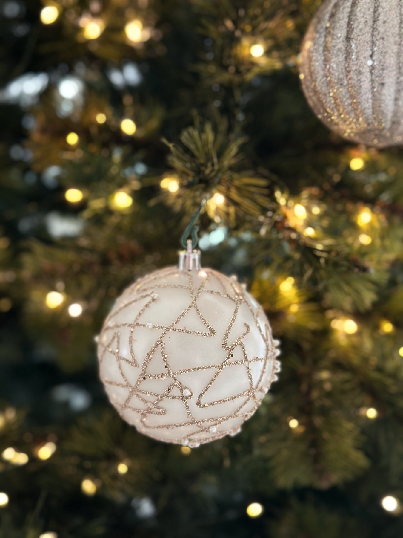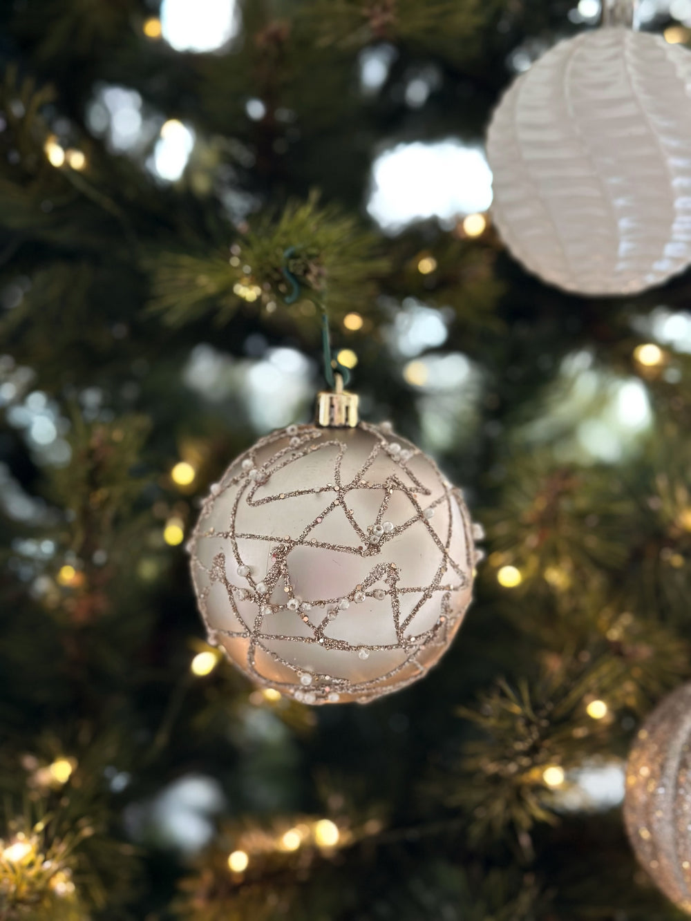 This versatile assortment includes a mix of champagne and white tones with glittered, ribbed, and smooth satin textures. 3 each of 4 designs. The understated yet stylish designs make them perfect for any festive theme, from modern chic to classic elegance. Each bauble is 8cm in diameter, providing the perfect accent to your holiday decor.