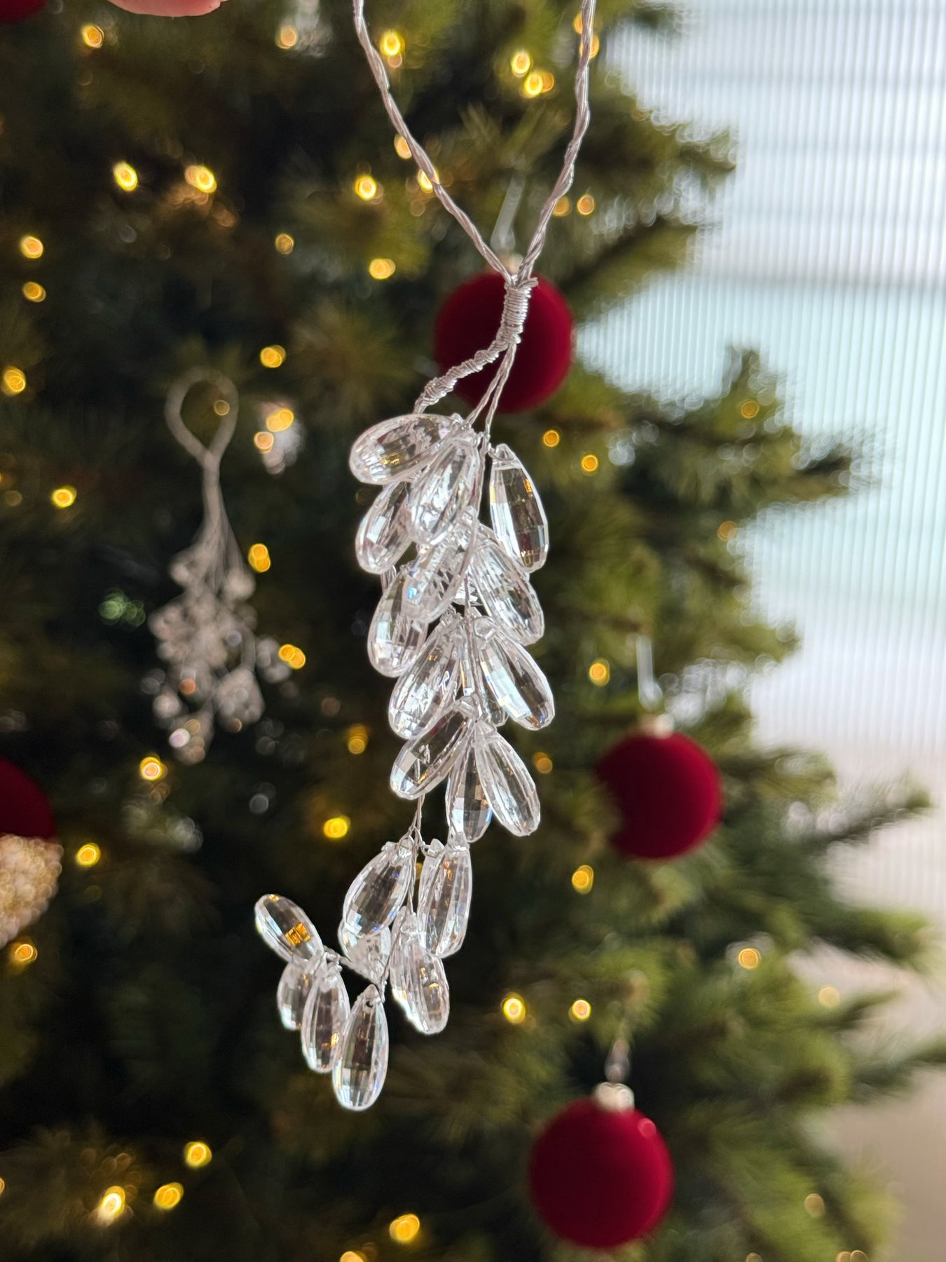 Made from clear plastic beads on silver-toned soft wires, each piece catches light beautifully and can be reshaped easily to suit your styling. Whether cascading from your tree, nestled in a wreath, or layered into a centerpiece, it brings a subtle shimmer that feels like winter magic.