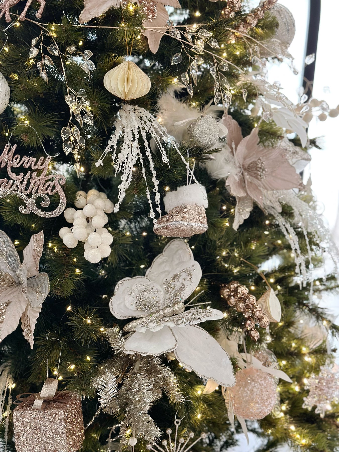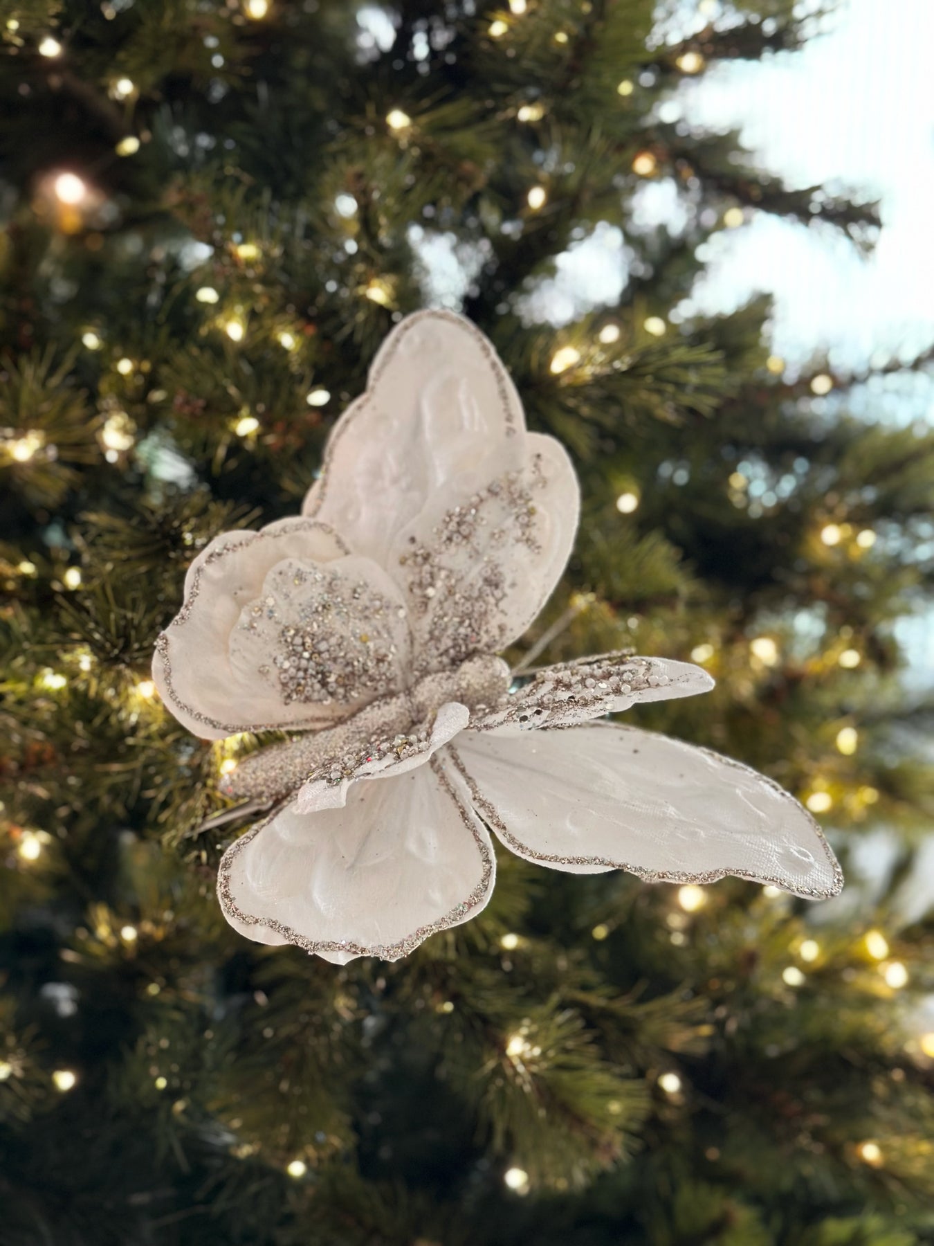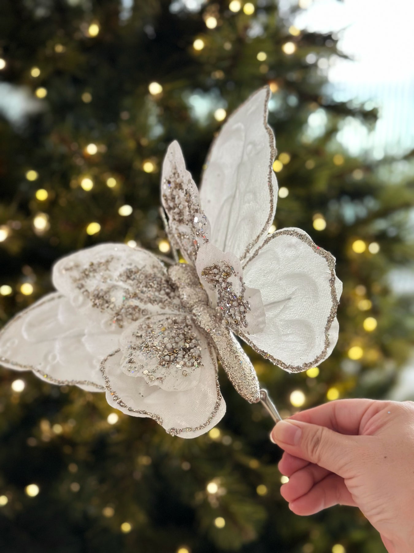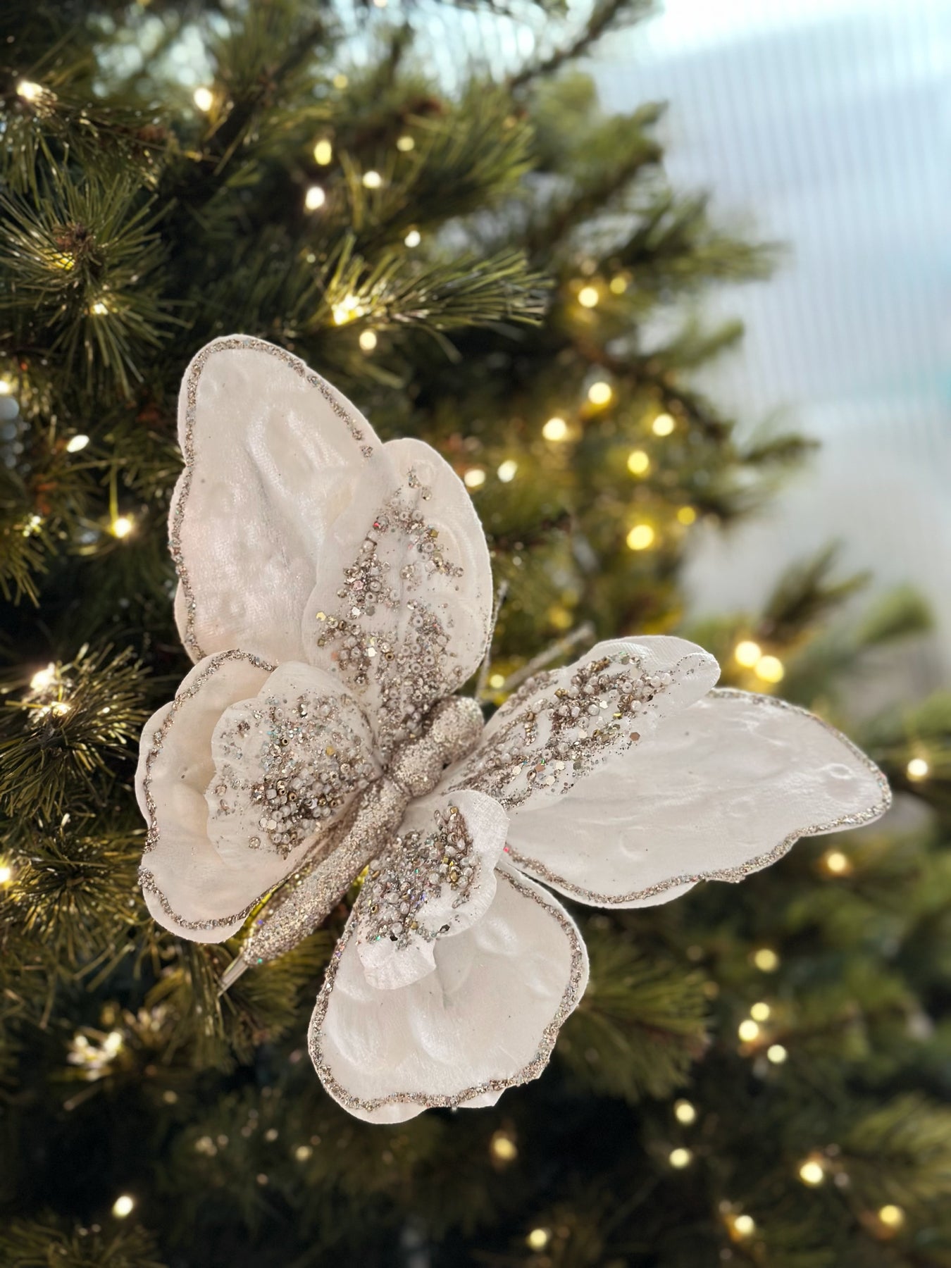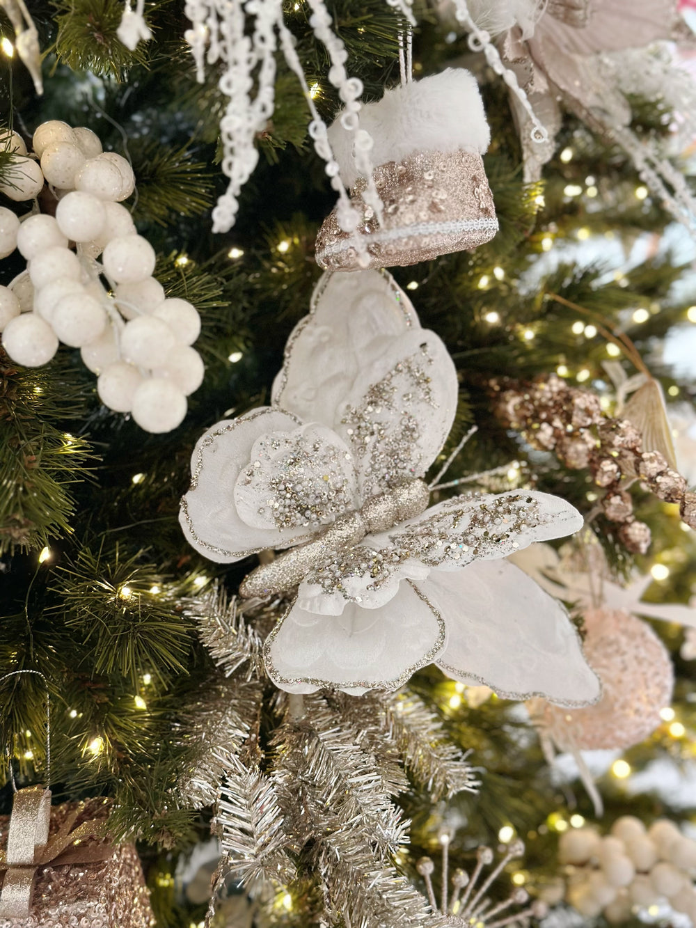 Add a touch of elegance to your holiday decor with the Enchanted Winter Butterfly Clip Ornament. Crafted with double-layered wings for a beautiful 3D effect and added depth, this stunning butterfly is made from soft fabric and adorned with intricate pale gold glitter details. Measuring 23 cm wide, it features a convenient clip, making it easy to attach to your Christmas tree, wreath, garland, or any festive arrangement. The shimmering glitter and layered wings create a magical, ethereal look that brings a graceful and luxurious touch to your holiday decorations. Perfect for adding sparkle and sophistication to your festive display.