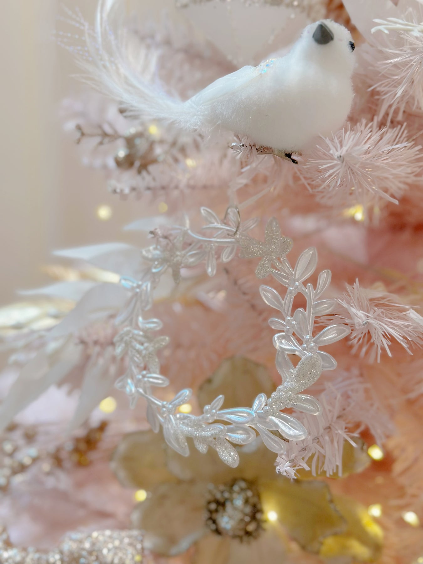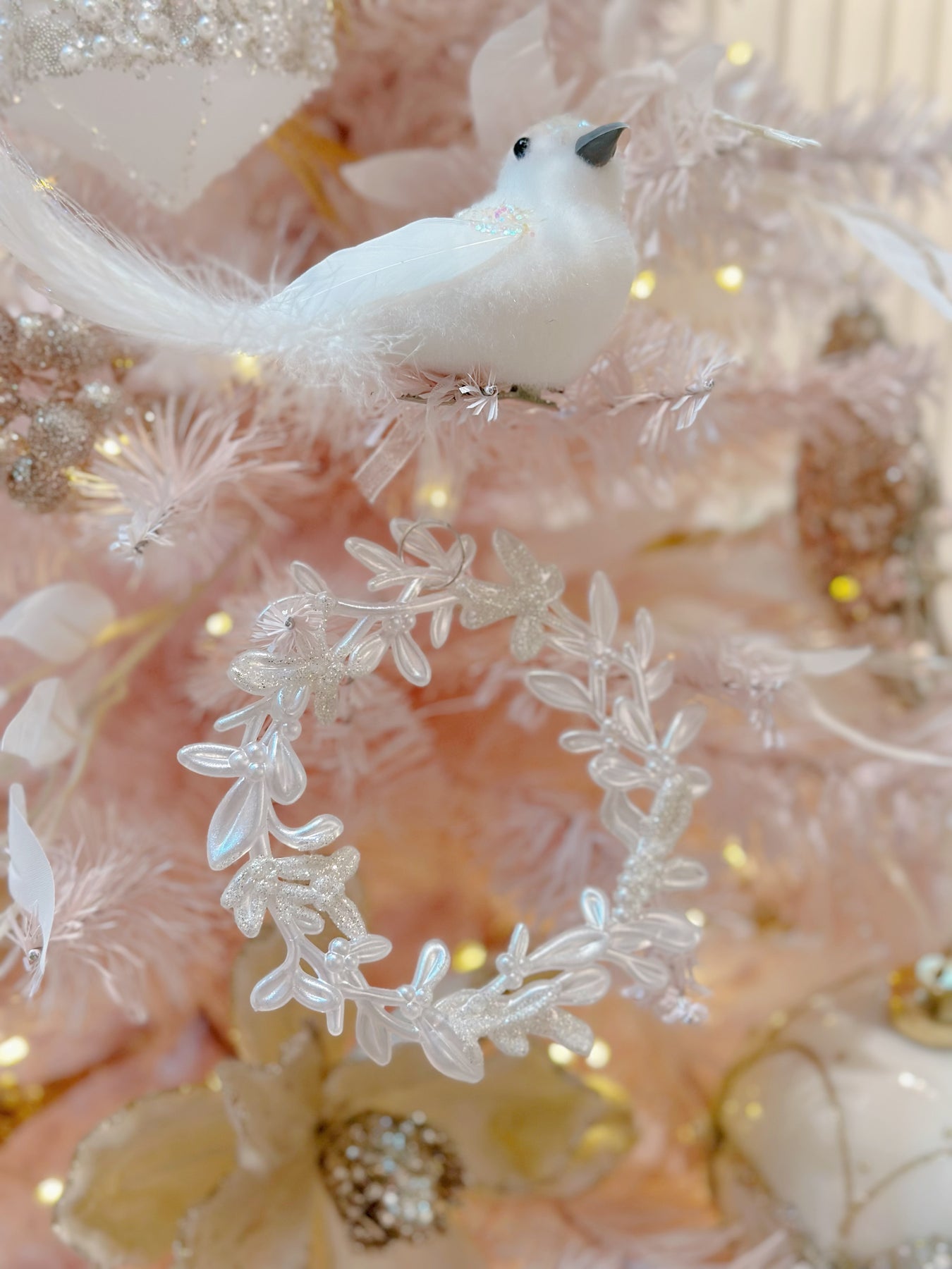 Elevate your festive decor with this elegant wreath ornament, a symbol of timeless elegance and holiday cheer. Crafted from plastic, this ornament is finished with a white pearl light sheen, reflecting a gentle, iridescent glow reminiscent of a winter's moonlight and with a touch of glittery shine on some parts. The subtle shimmer enhances its beauty, making it a standout piece in any festive setting.