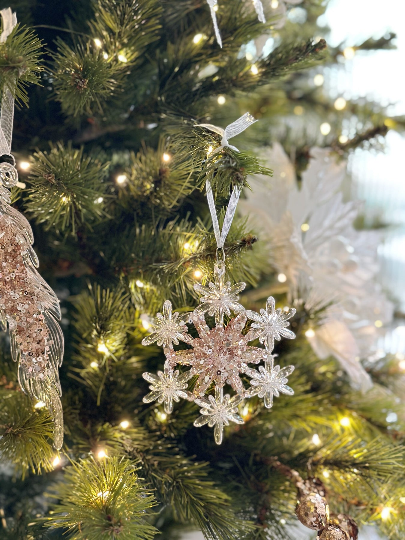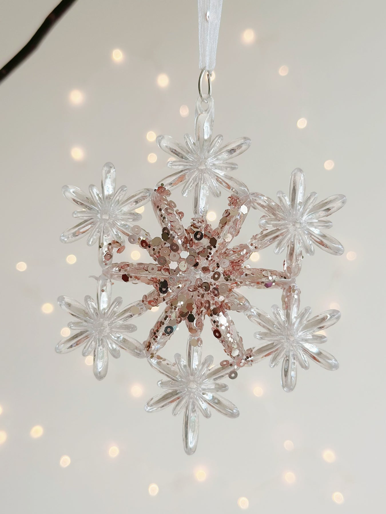 Introducing the Glistening Snowflake Ornament, a delicate and intricate piece that brings a touch of magic to your holiday decor. Made from transparent plastic, this ornament features a detailed snowflake design, beautifully accented with dark champagne gold glitter in the center on both sides, catching the light from every angle. Measuring 11 cm, it’s perfect for hanging on your tree, wreaths, or garlands, adding a sophisticated sparkle to your festive surroundings. Lightweight yet durable, this ornament effortlessly combines elegance and charm for a timeless holiday look.