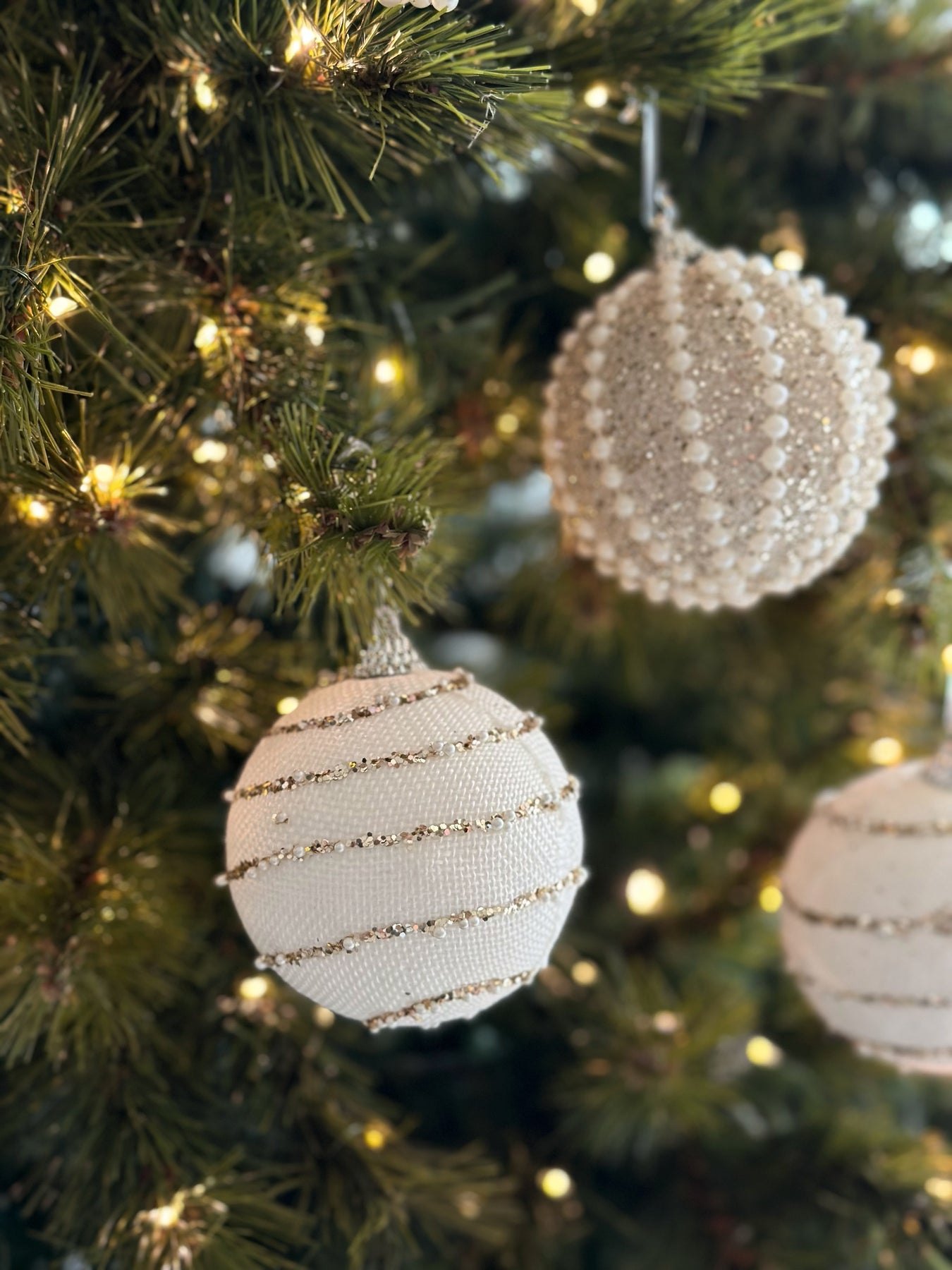 • Two Sophisticated Designs: The set includes 8 white baubles, wrapped in soft fabric and adorned with delicate champagne gold glitter detailing, and 4 champagne gold baubles, fully coated in glitter and embellished with intricate white bead accents.