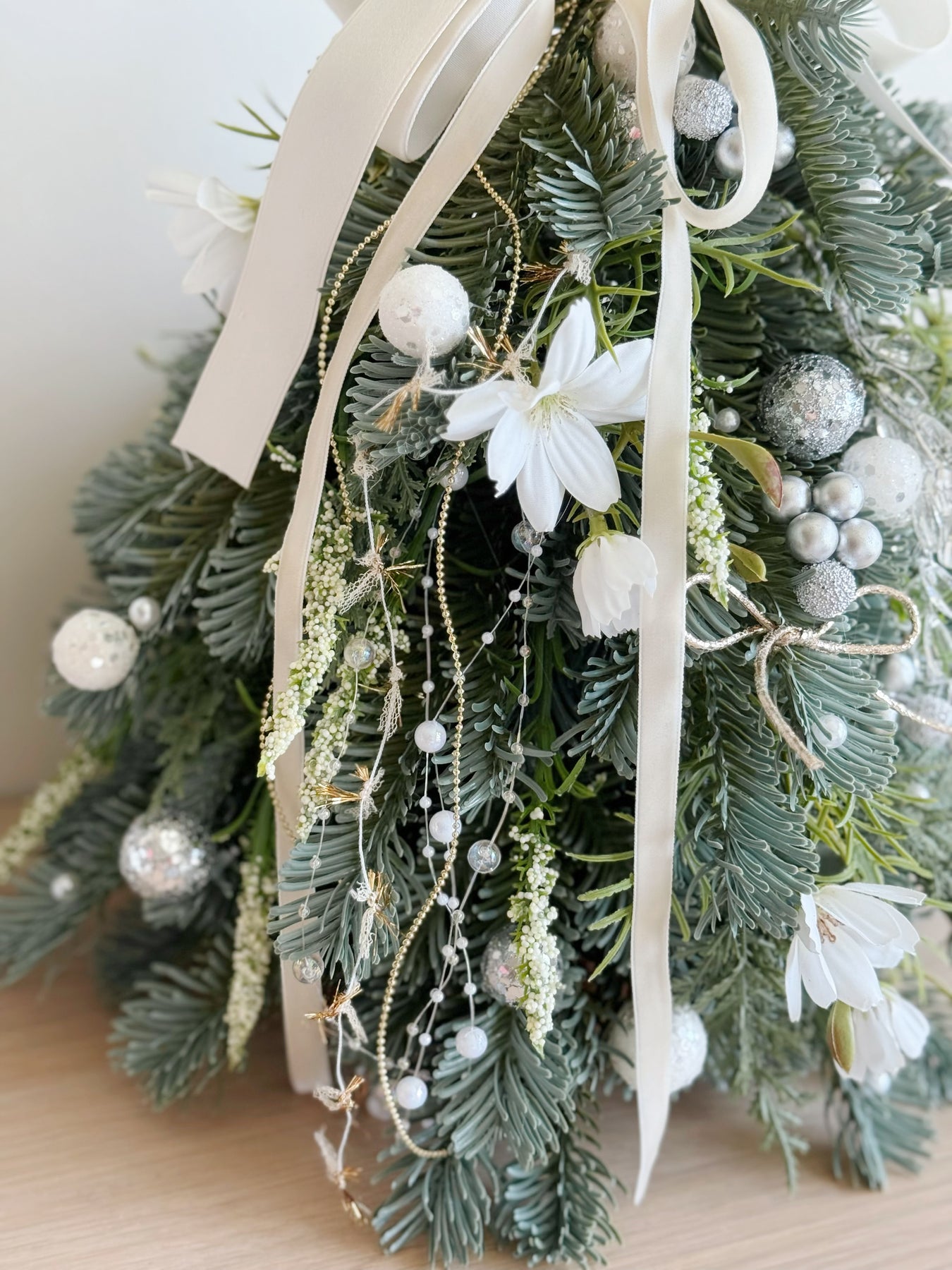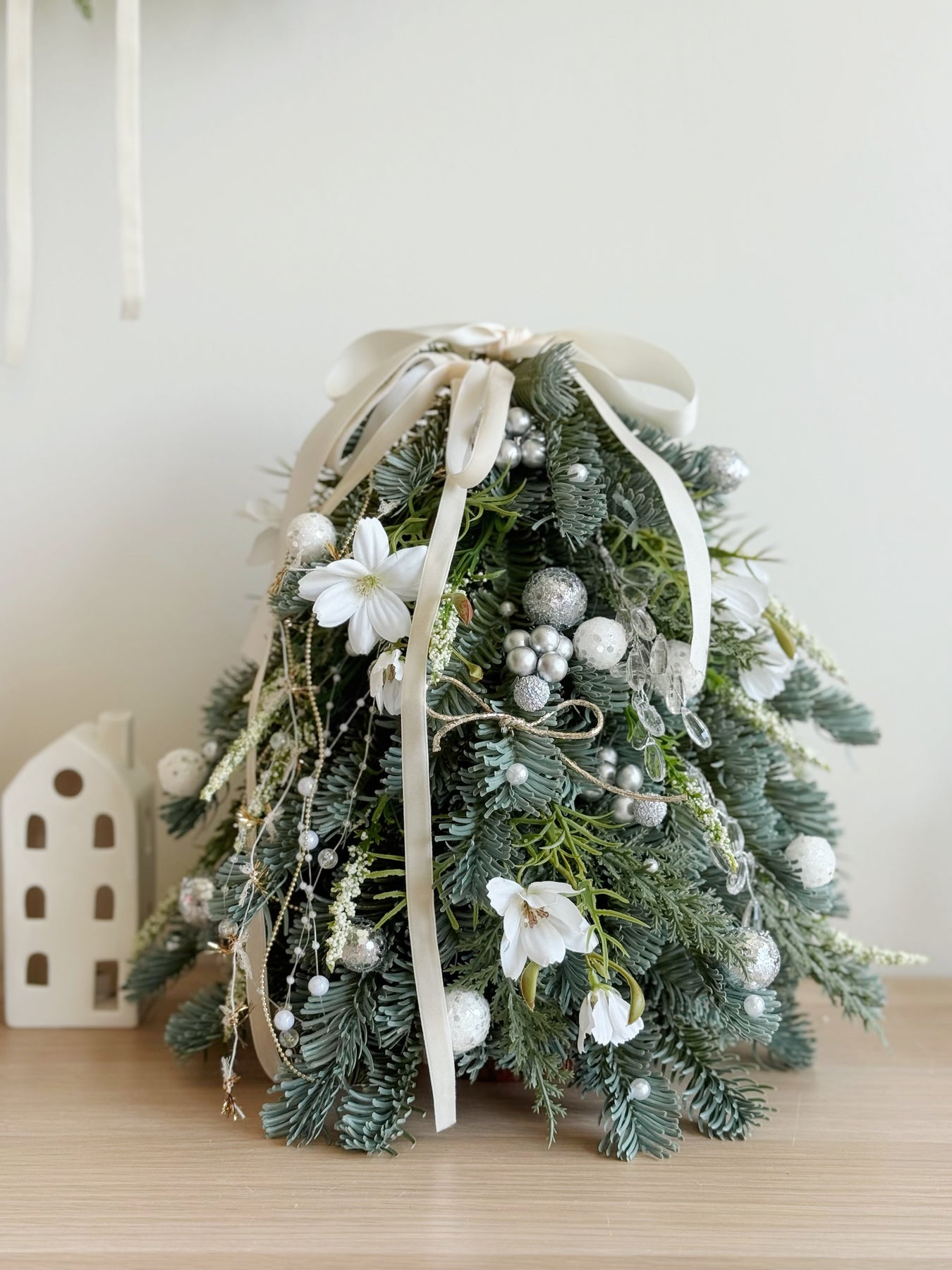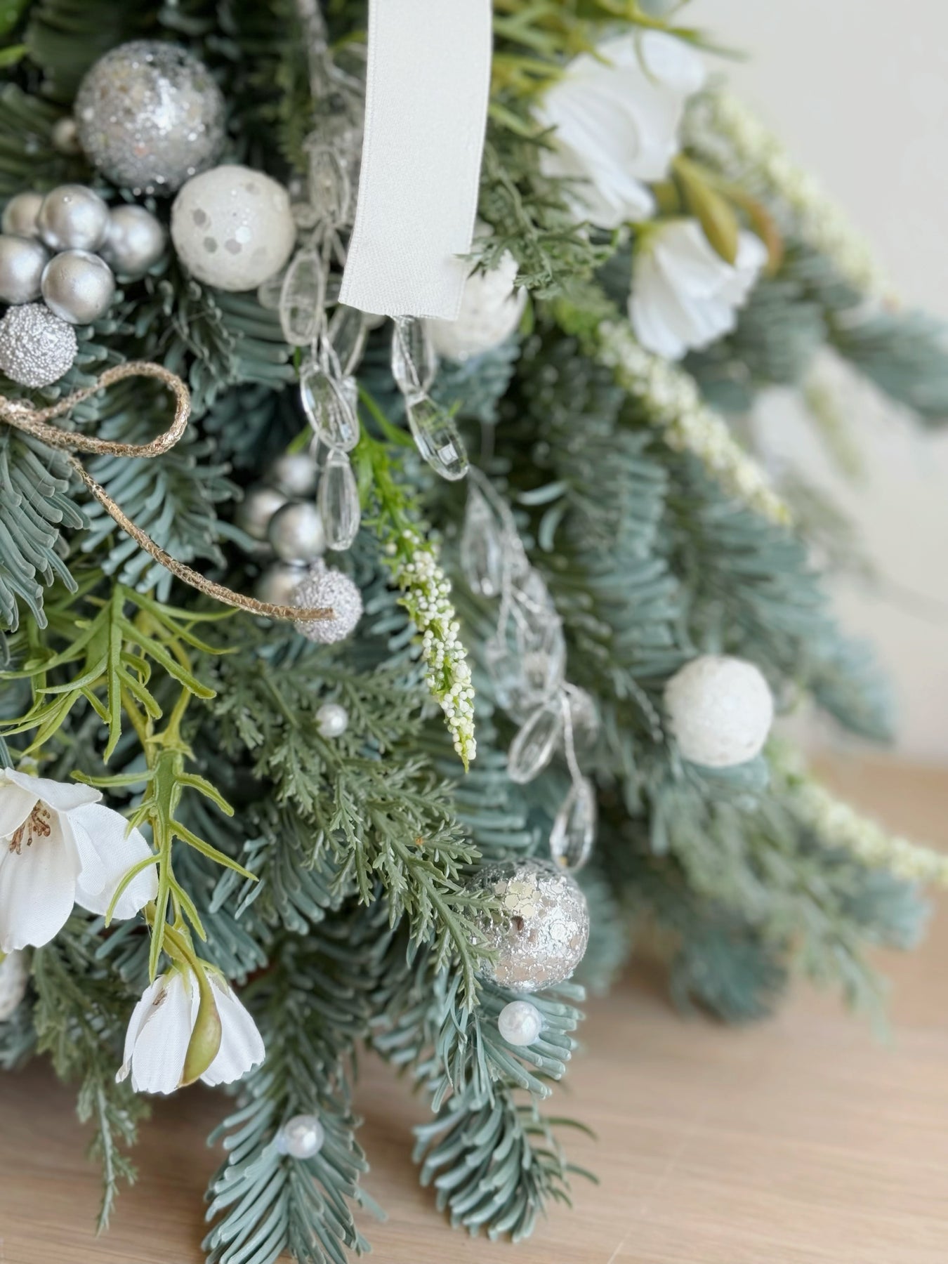 Handcrafted with layers of lush faux pine greens and delicate white blossoms, this petite tree is adorned with shimmering mini baubles made of plastic and foam, velvety ribbons tied into graceful bows, and strings of dainty beaded charms for that subtle festive sparkle.