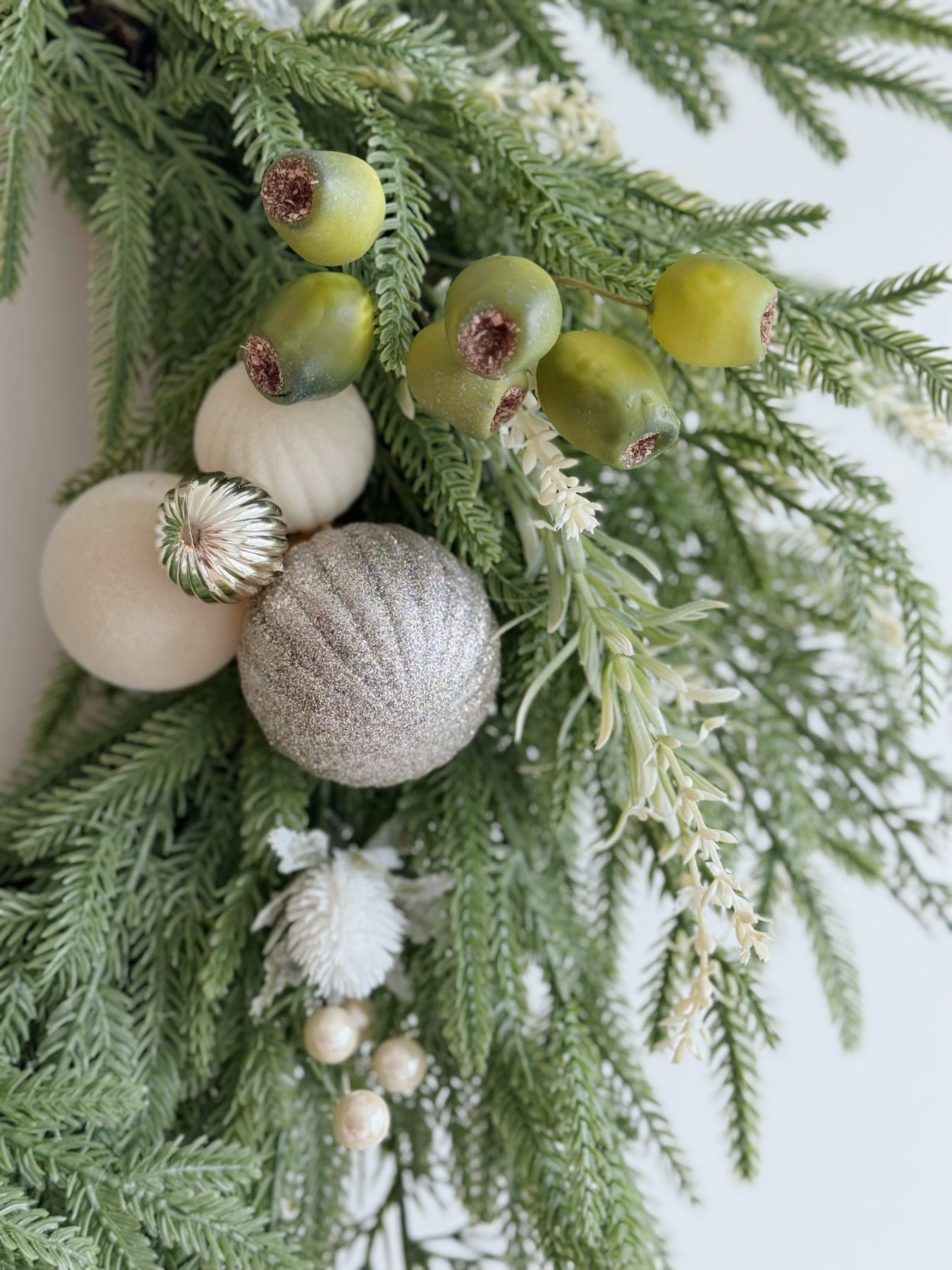 Crafted with layers of lush faux greenery in refreshing natural tones, this piece is beautifully detailed with off-white accents, velvety cream ribbons, and clusters of light champagne baubles. Green berries add a soft pop of life, while long cascading ribbons lend gentle movement and texture.