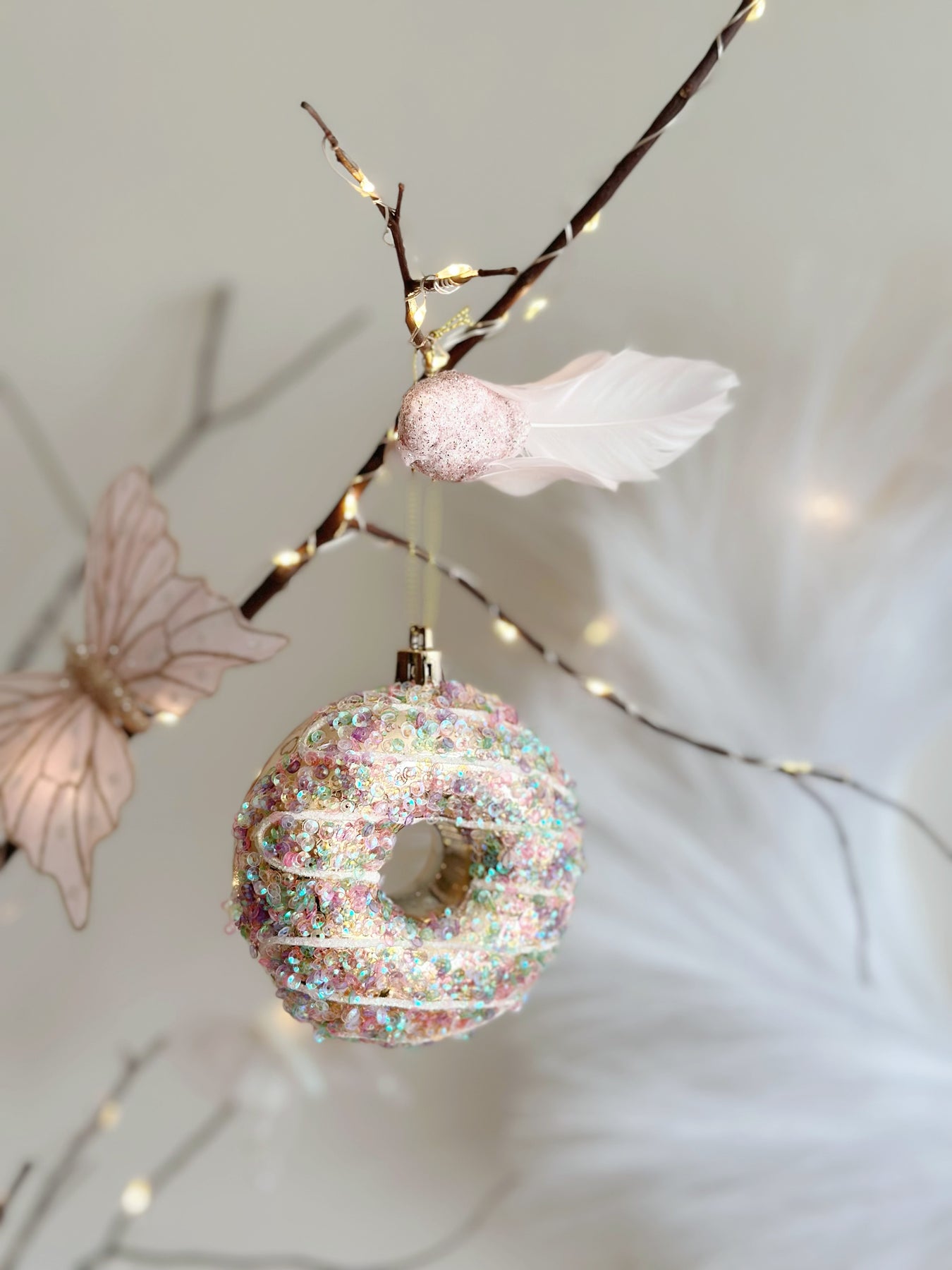 Add a touch of sweetness to your holiday decor with our Sparkling Sugar Donut Ornament! Crafted from lightweight plastic, this festive treat is designed with shimmering, sugary details on one side, giving your tree a pop of playful sparkle. Perfect for adding a hint of whimsy and charm, this donut ornament brings a lighthearted twist to traditional holiday decorating. Hang it on your tree, garlands, or wreaths for an eye-catching addition that’s sure to delight!