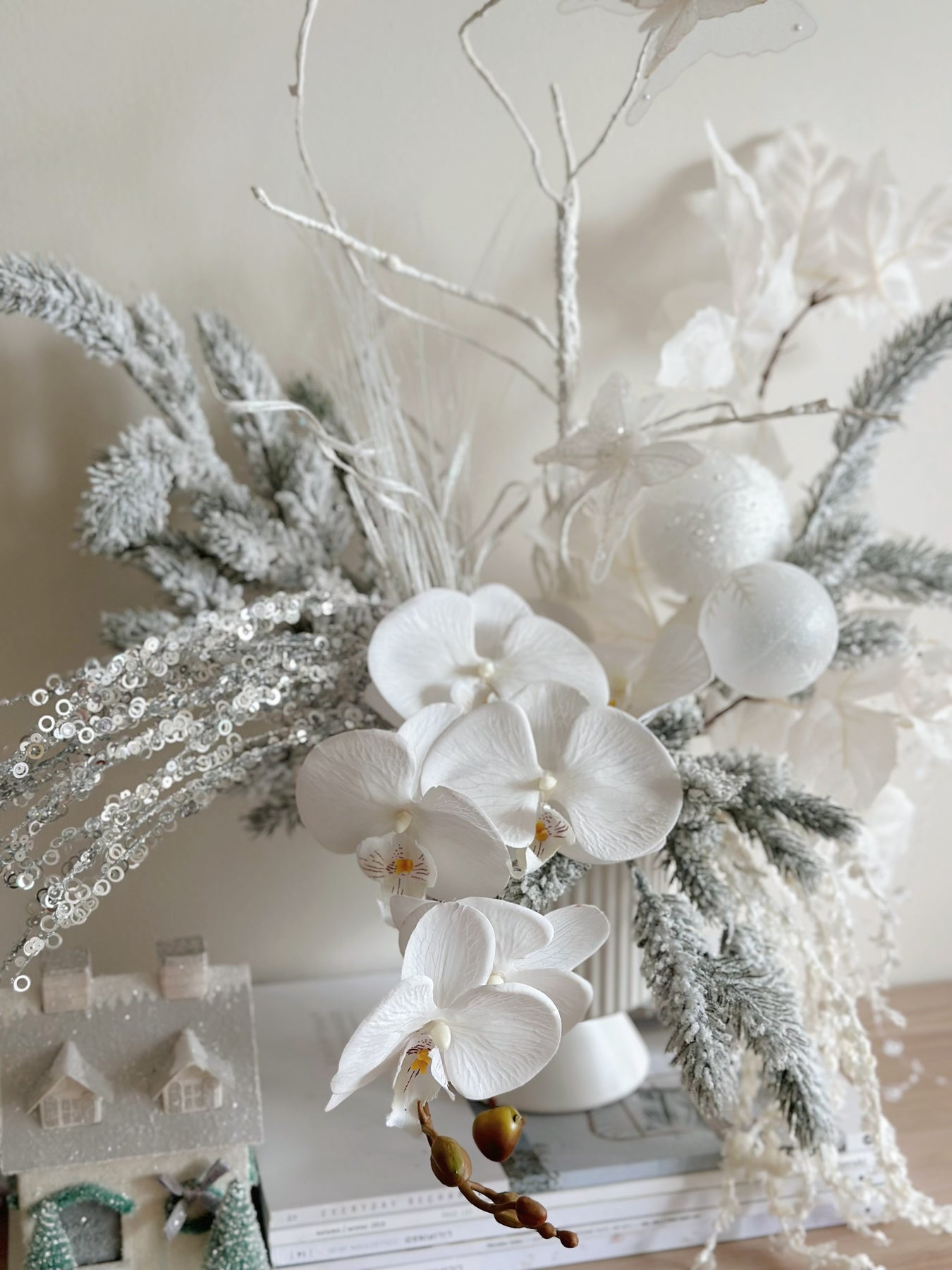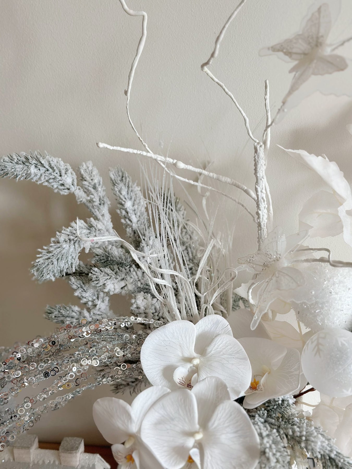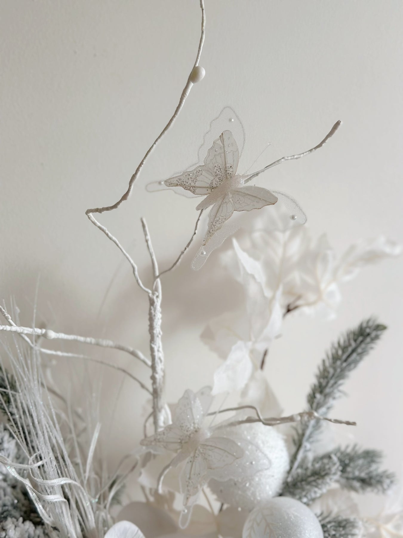 The delicate accents of sequined stems shimmer subtly, reflecting the magic of the season, while whimsical butterflies perched on snowy branches infuse the arrangement with playful charm. With its serene palette of whites and silvers, this piece seamlessly transforms any space into a winter wonderland.