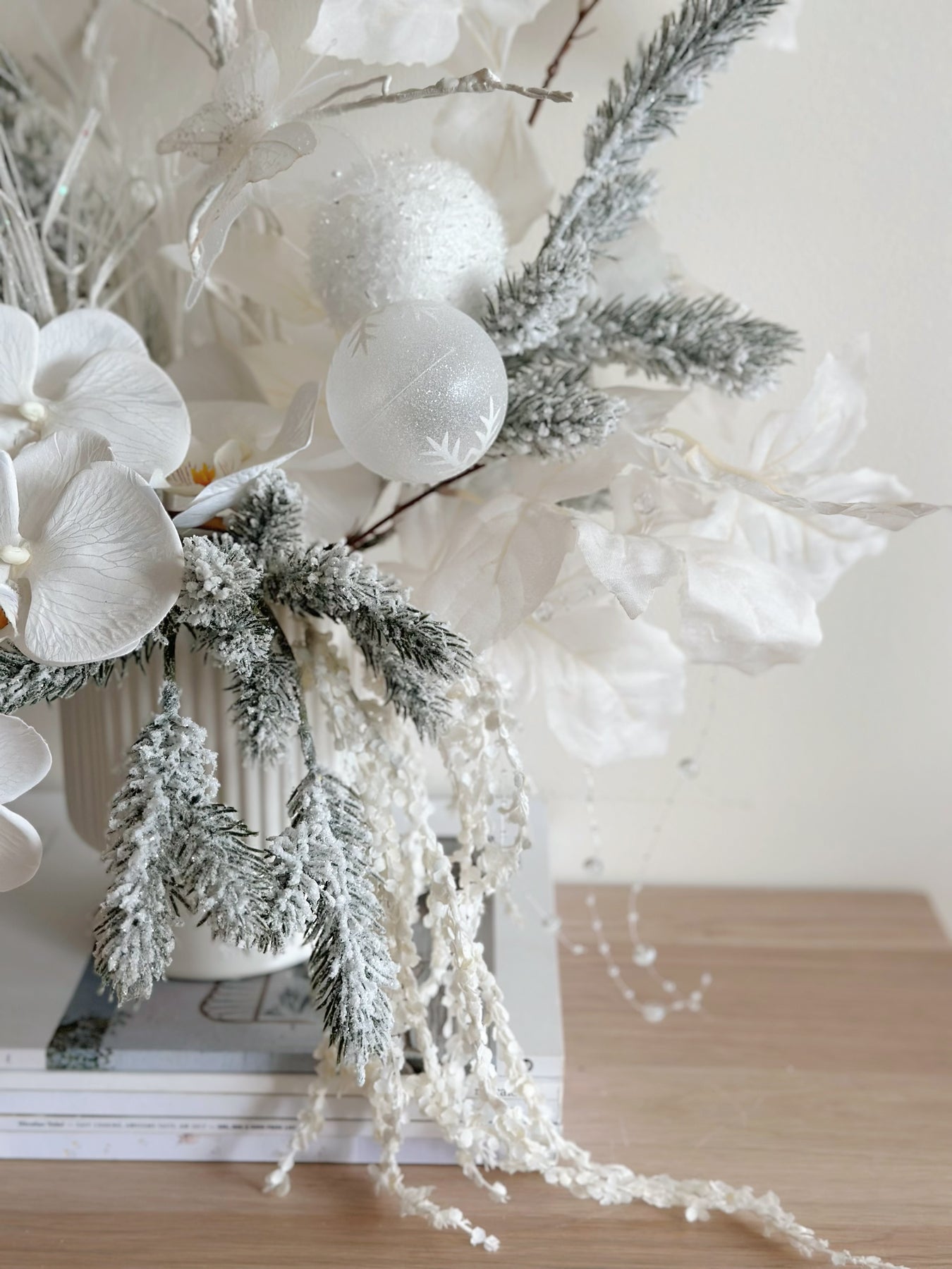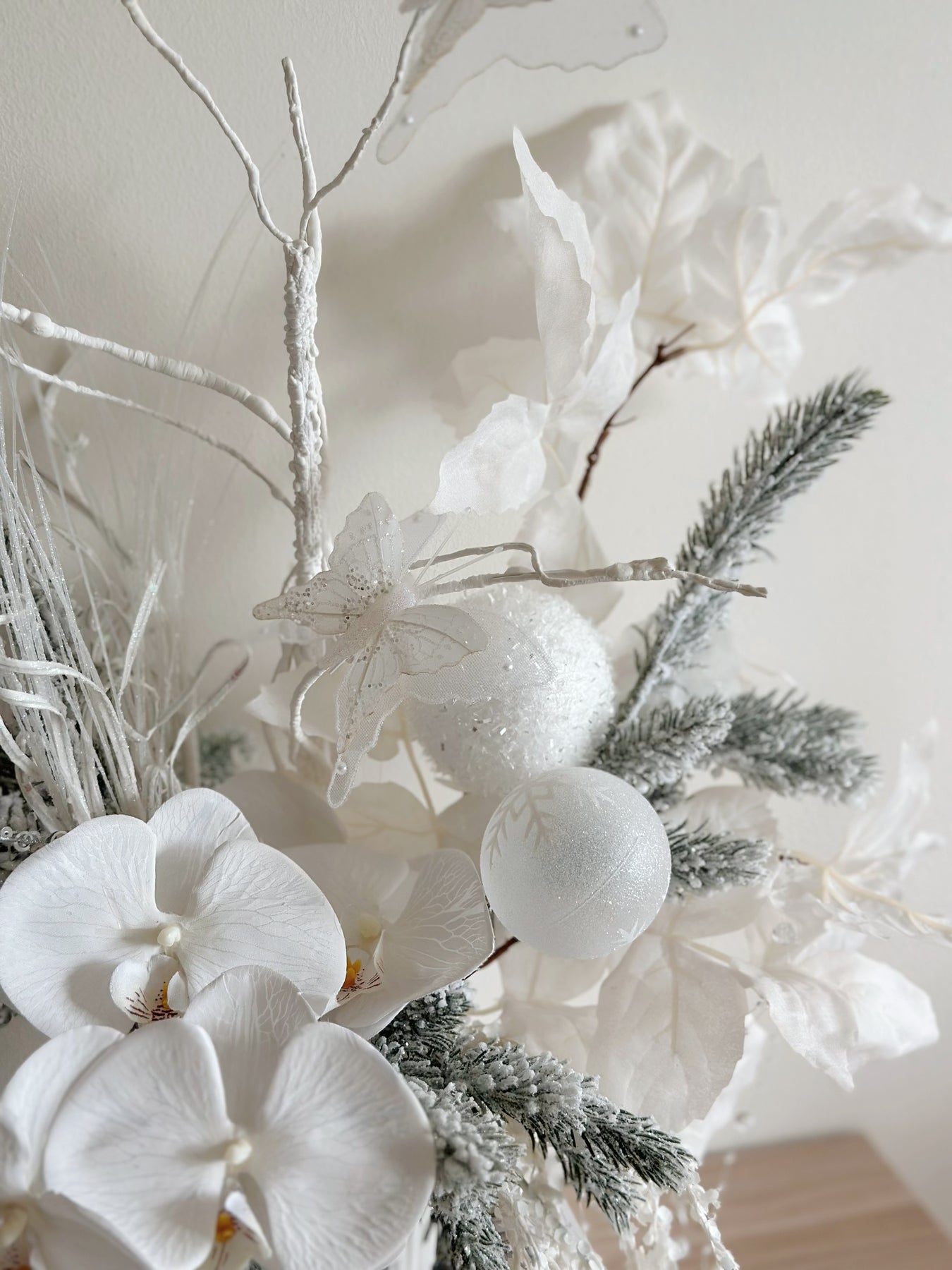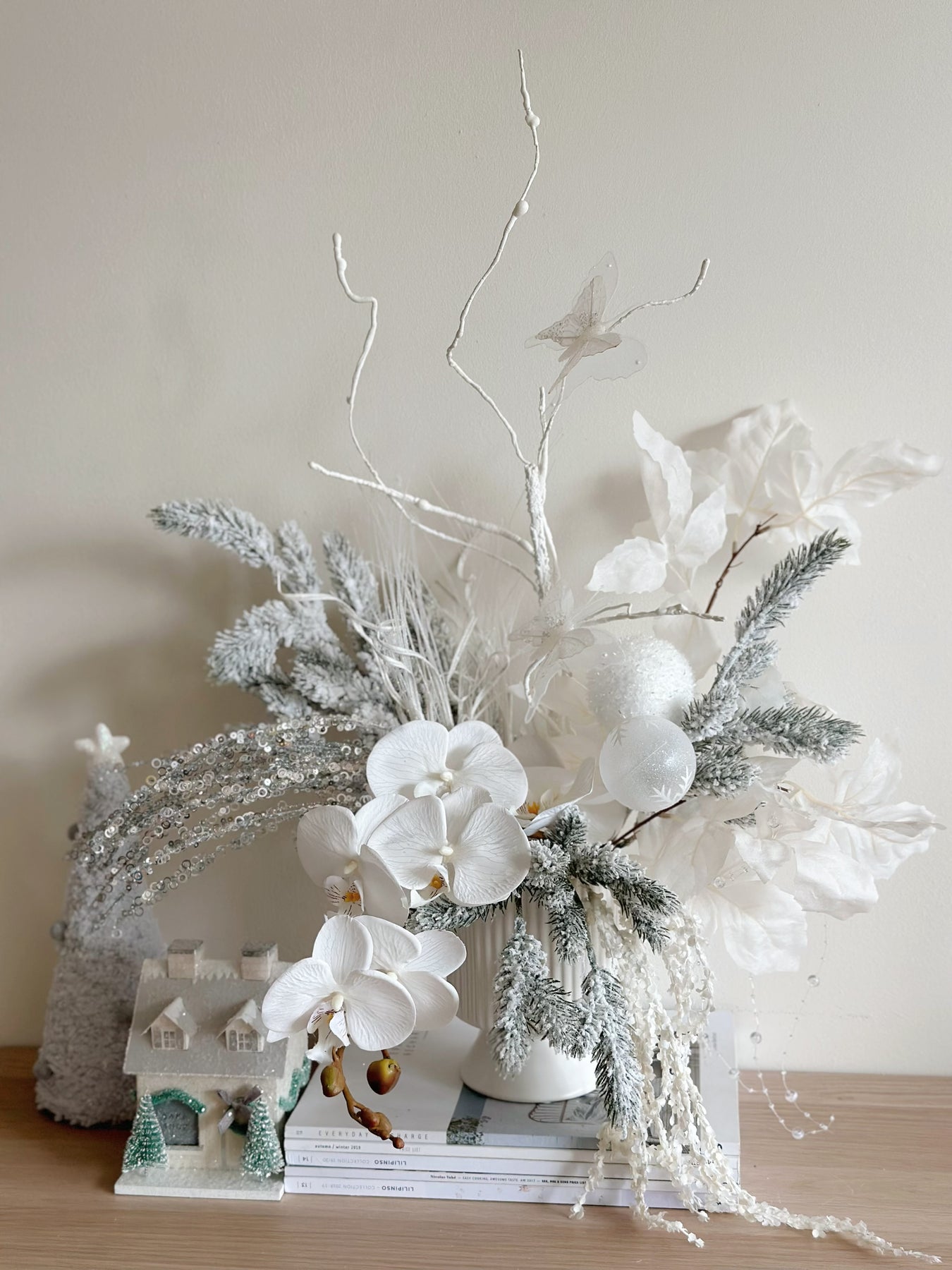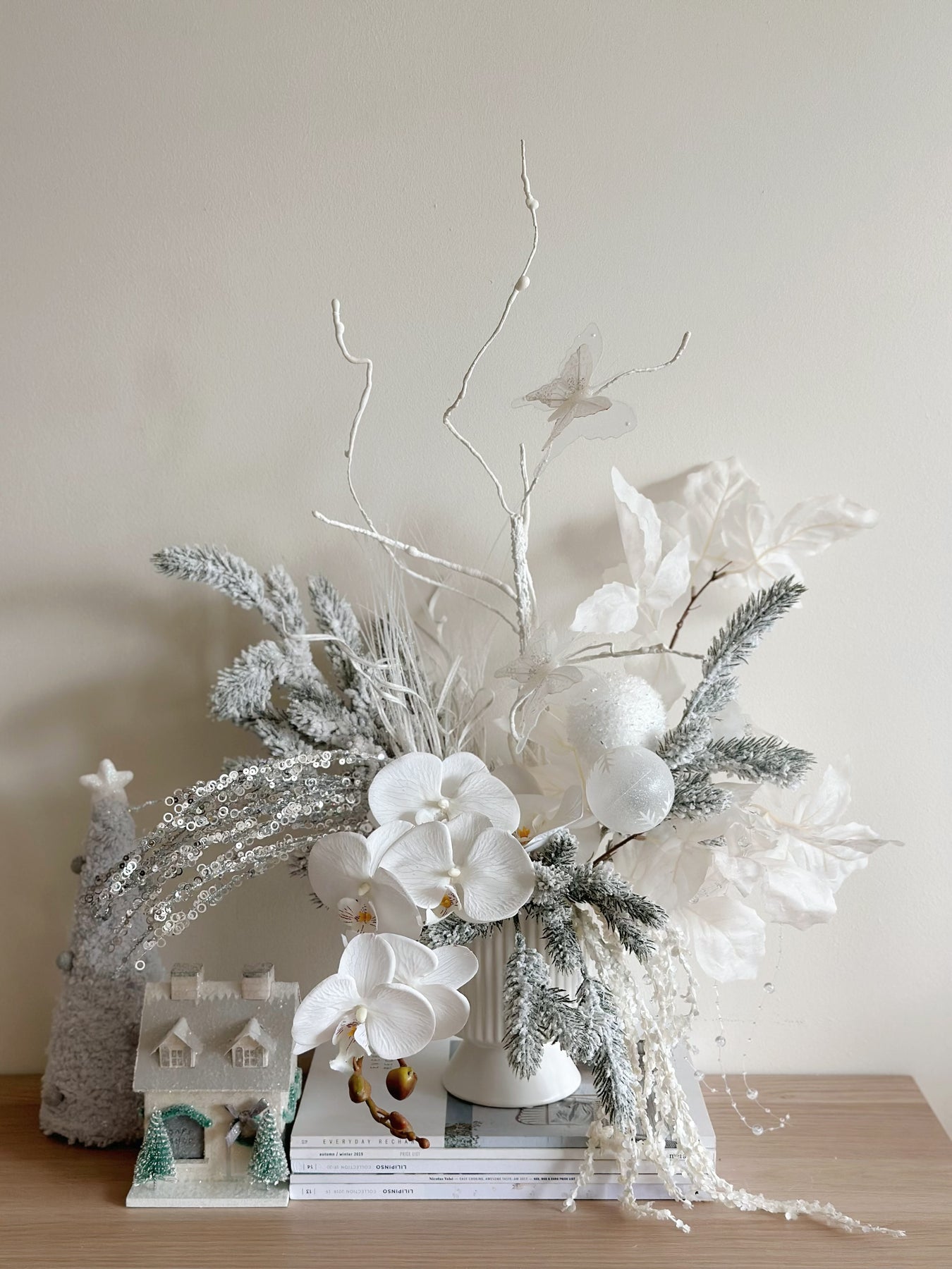 The delicate accents of sequined stems shimmer subtly, reflecting the magic of the season, while whimsical butterflies perched on snowy branches infuse the arrangement with playful charm. With its serene palette of whites and silvers, this piece seamlessly transforms any space into a winter wonderland.