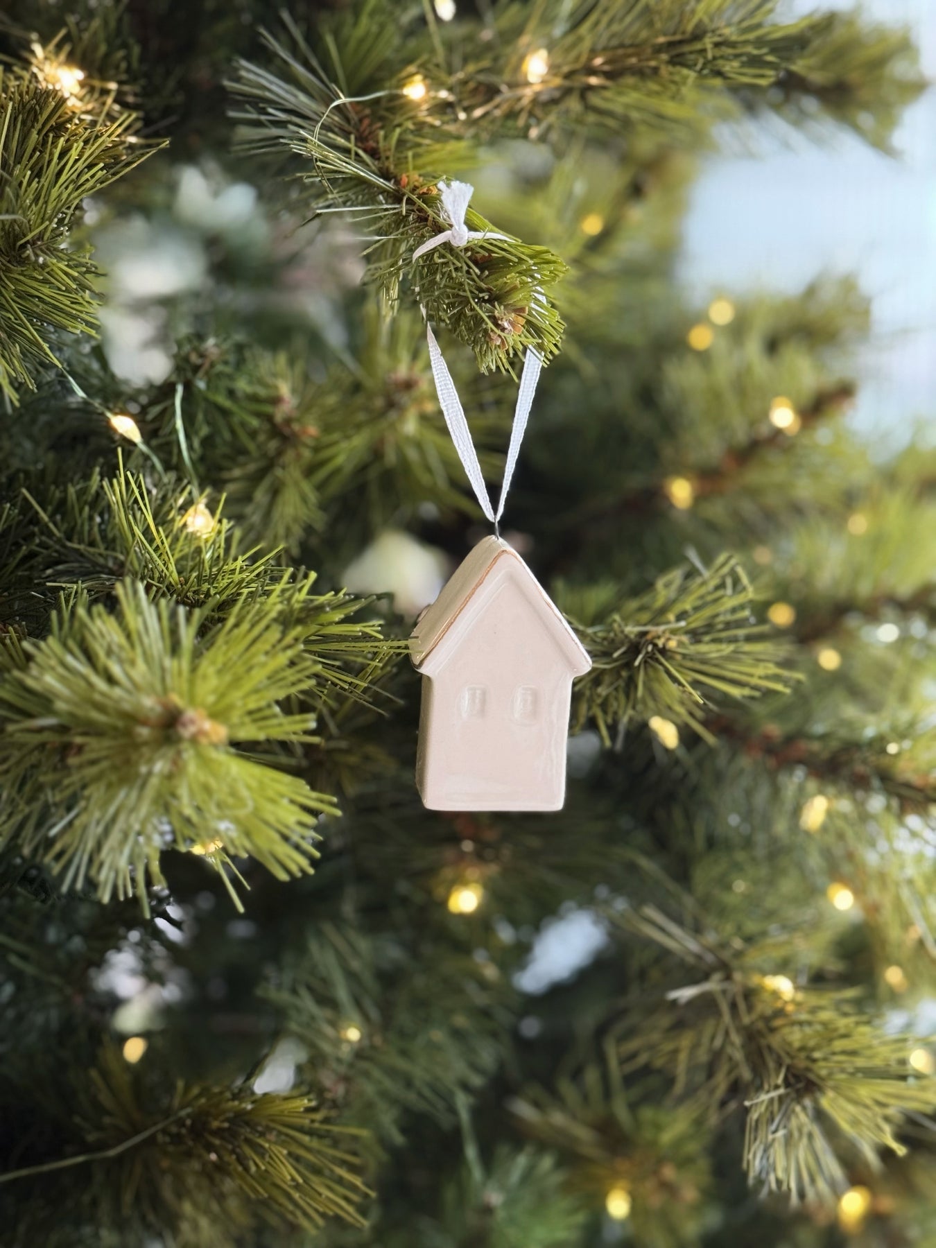 Available in 4 house designs, each comes with a white ribbon for easy hanging on your tree, garland, or festive display.
