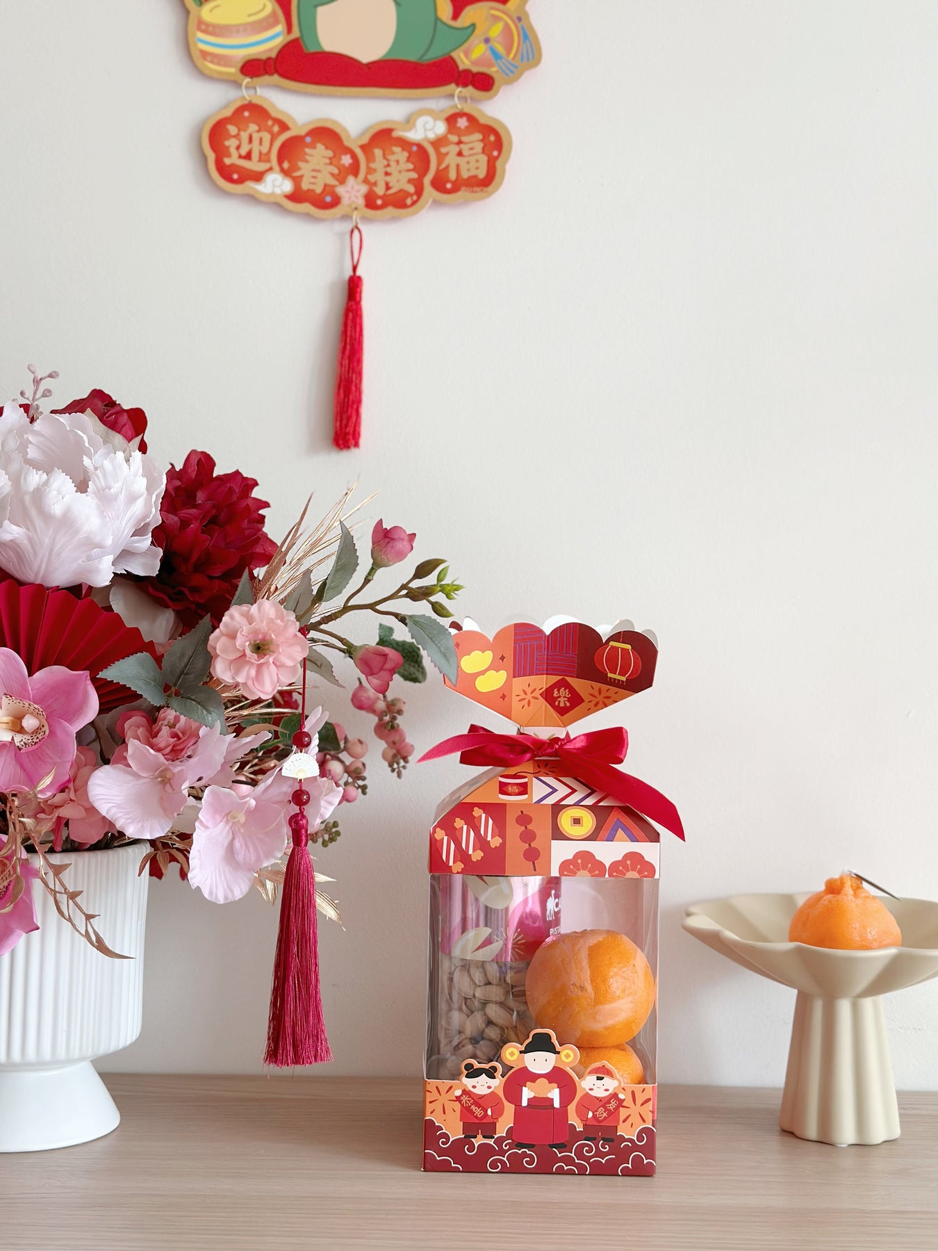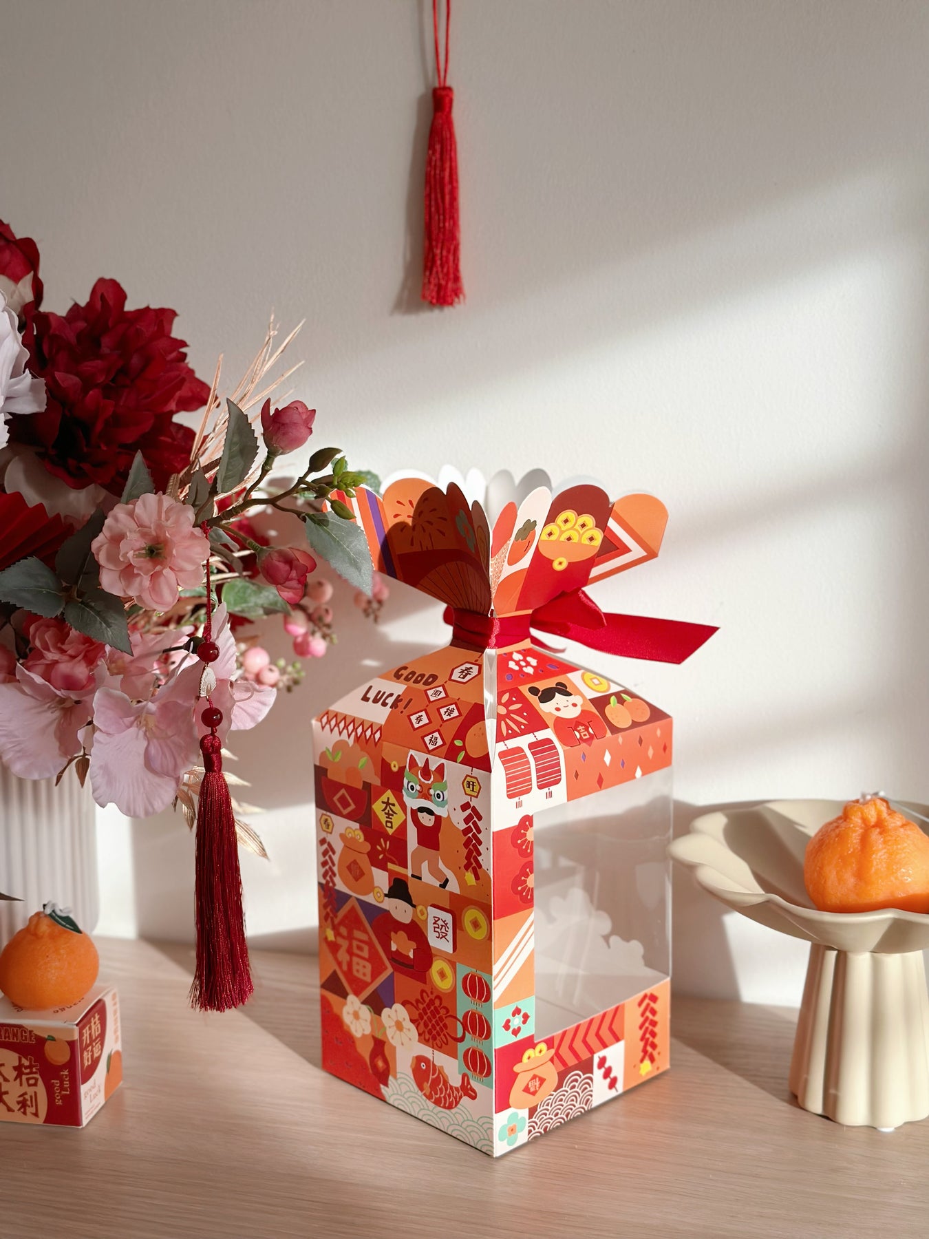 Featuring transparent plastic windows on two sides, the box offers a glimpse of the thoughtful gifts or delicious treats inside, making it as exciting to look at as it is to open. Tied together with an elegant red ribbon, a symbol of good fortune and joy in Chinese culture, this gift box is more than just packaging – it's a part of the celebration.