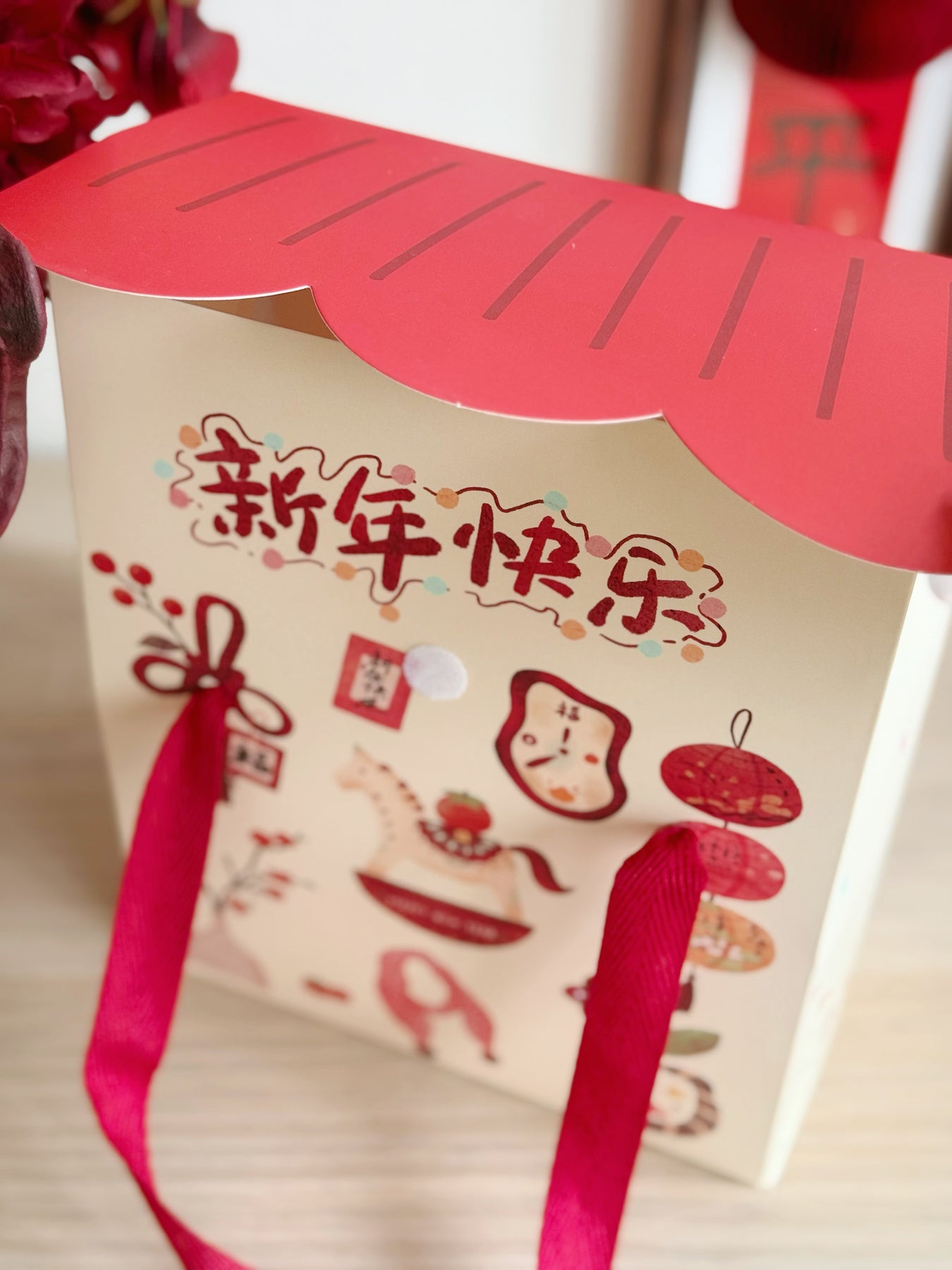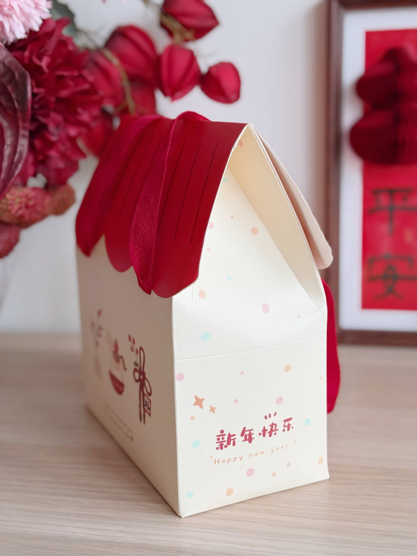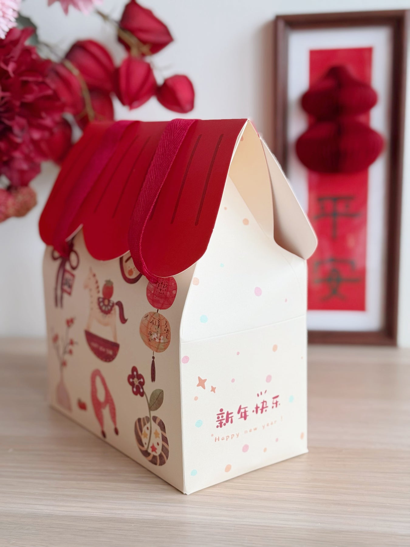 A delightful house-shaped CNY gift bag featuring adorable vintage-style, hand-drawn illustrations inspired by classic storybook charm. Designed to feel warm, nostalgic and joyful, it’s perfect for gifting 2 small bottles of CNY snacks, or 1 bottle with 2 mandarins.