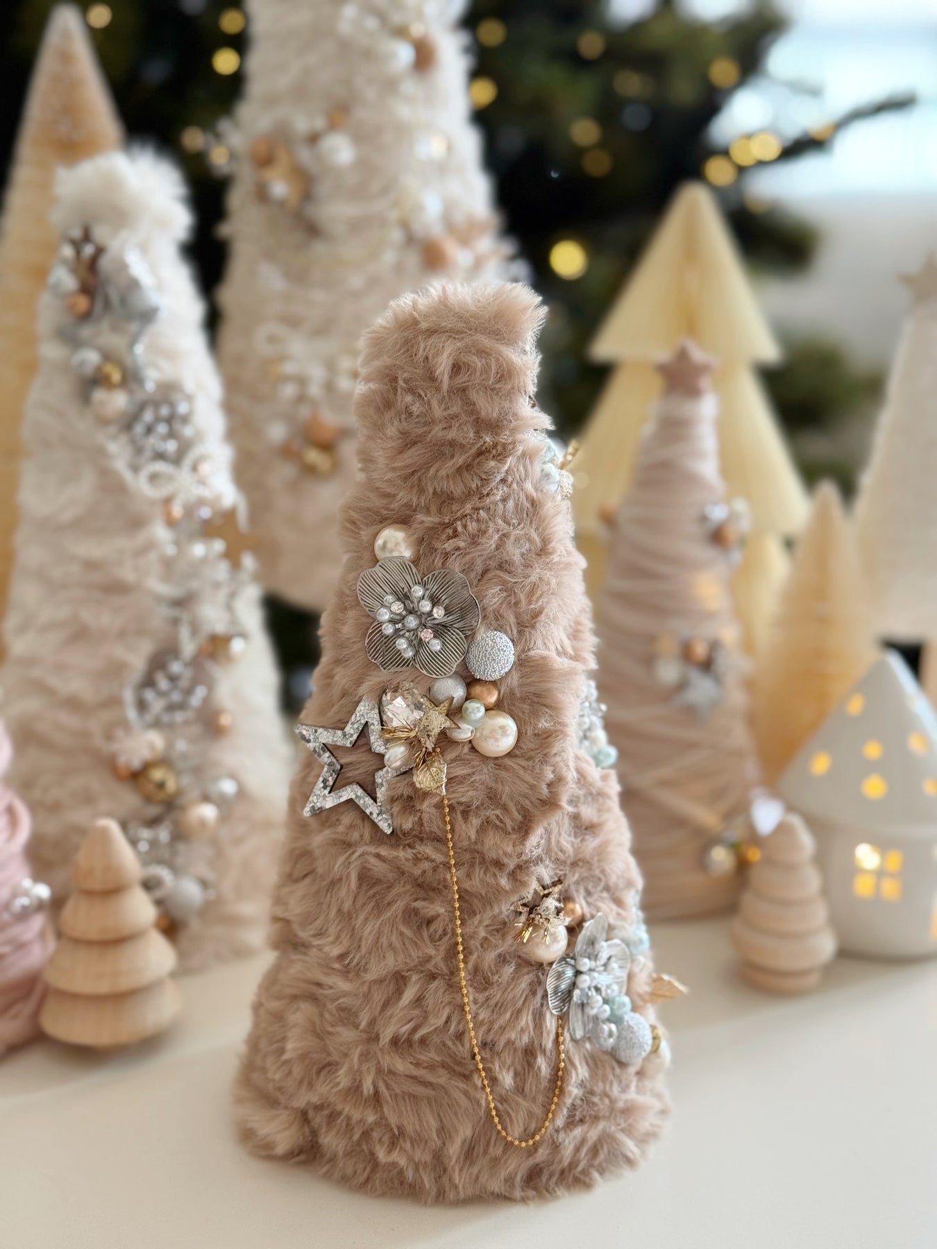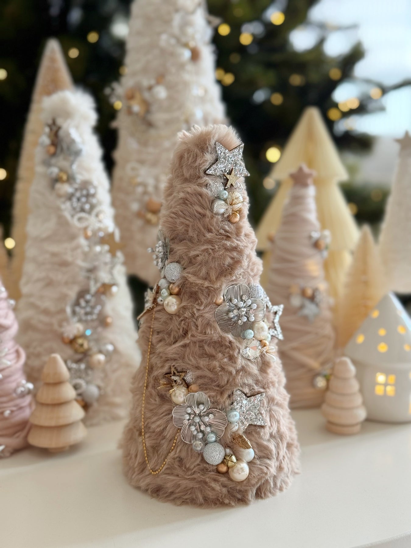 The Enchanted Luxe Tree Collection celebrates the art of handmade elegance — each tree carefully wrapped in soft faux fur or yarn, then adorned with delicate pearls, glittered stars, floral accents, and metallic embellishments. Every detail is thoughtfully placed, bringing a sophisticated shimmer to your festive setup.
