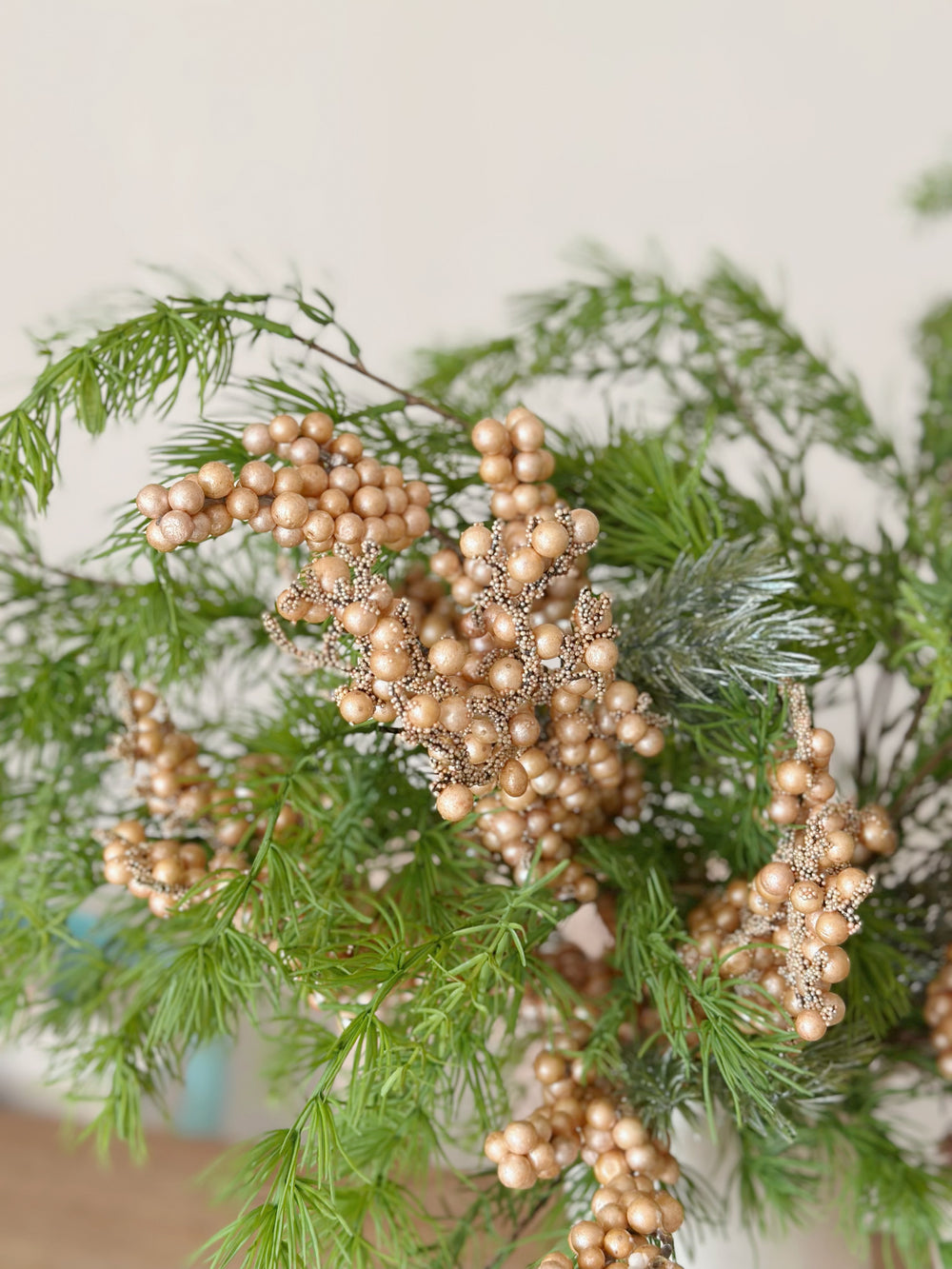 Clusters of champagne-golden berries are delicately dusted with subtle frost for a pearly sheen that catches the light beautifully. A few sprigs of realistic pine peek through, adding texture and a hint of winter greenery.
