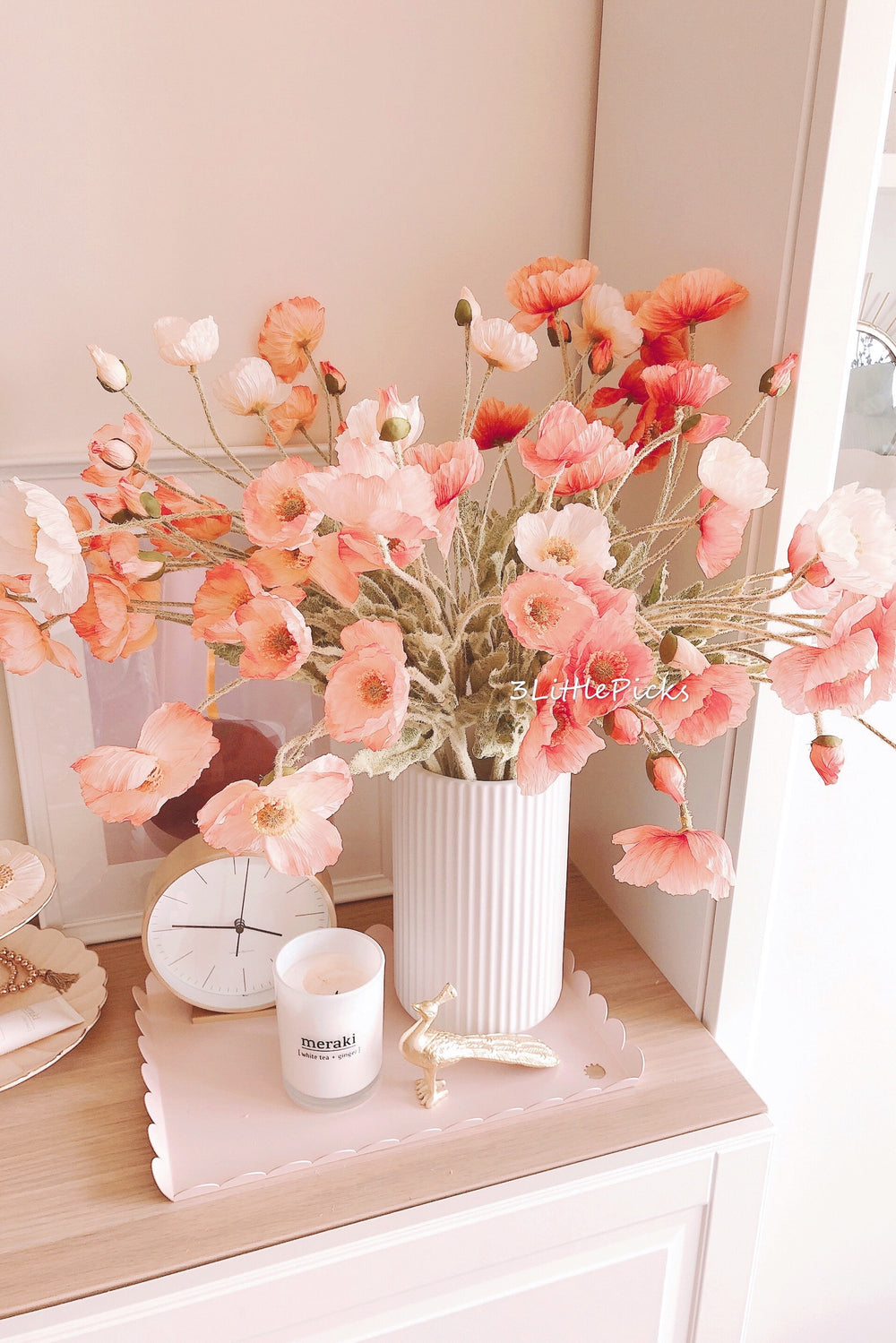 If you want to create a bright and vibrant tall vase display for your home, these pretty faux poppy in the cheerful coral shades would be the perfect accent for your home decor. Perfect for adding to displays, bouquets or looks lovely in its own right. These are quality made and they look so real that you will have to feel it to tell that these are not real. Combine a few to fill up a large vase or use just one stalk for a small neck tall vase. These are with pliable stem which can be shaped to your individual needs.