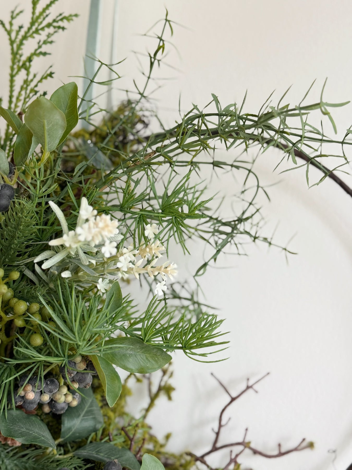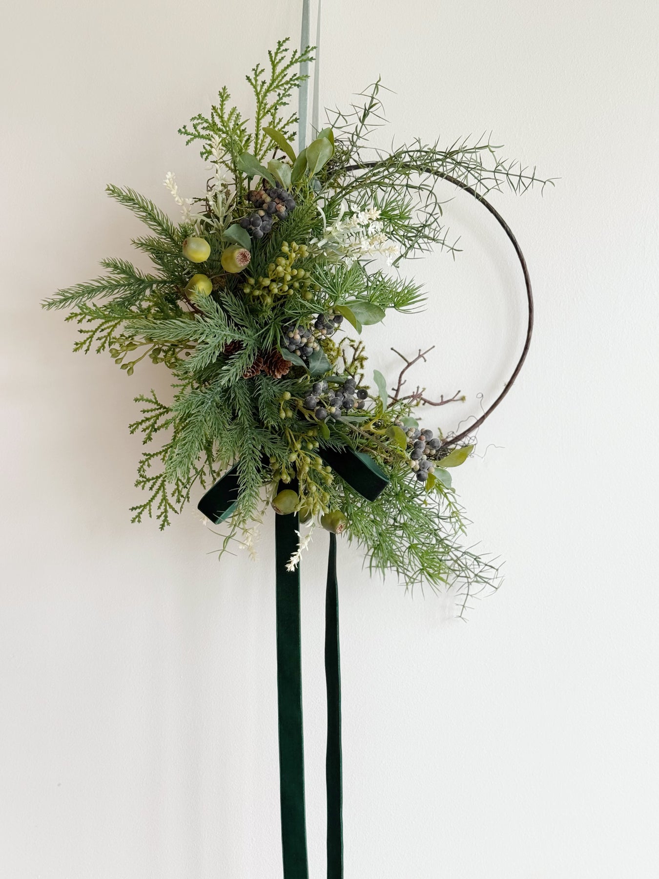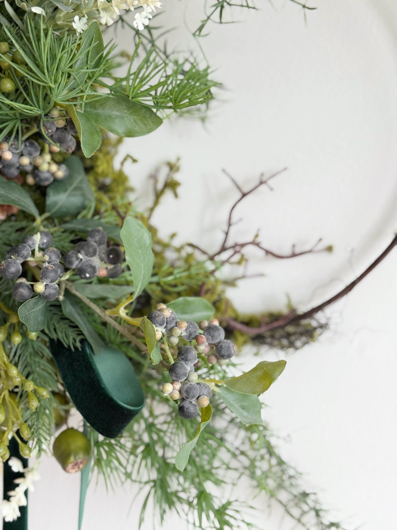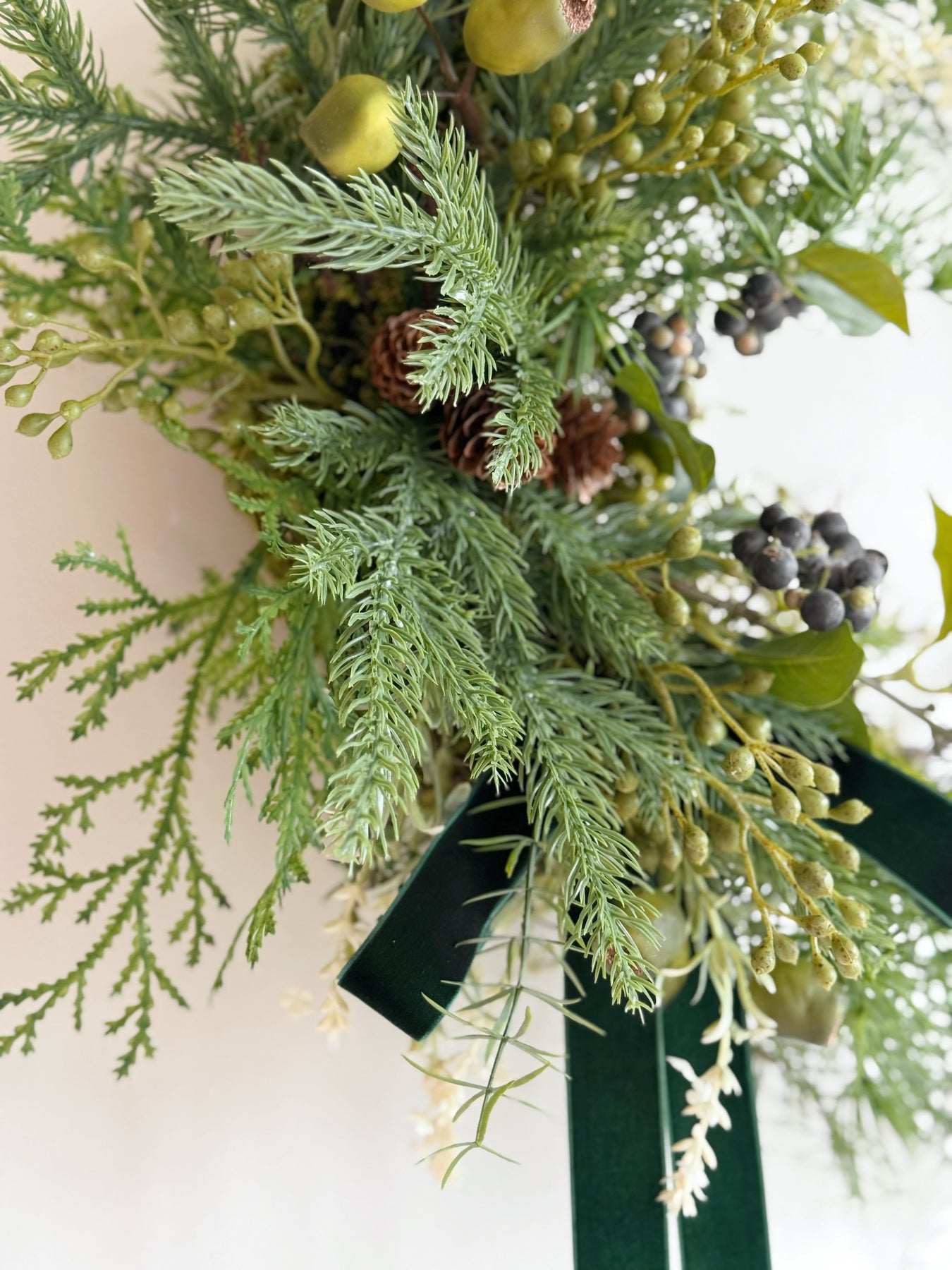 Featuring a lush variety of realistic pine branches layered in natural green tones, it’s accented with clusters of deep red velvety berries and finished with long, flowing velvet ribbons that drape beautifully for a touch of sophistication. Subtle green berries add a hint of texture and depth, balancing the rich hues with natural grace.