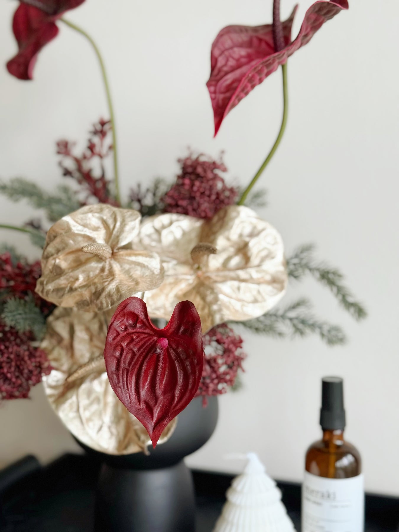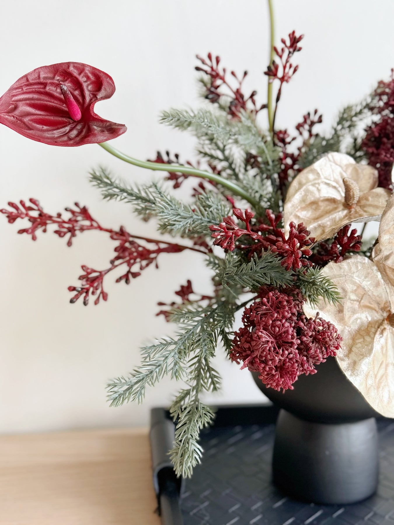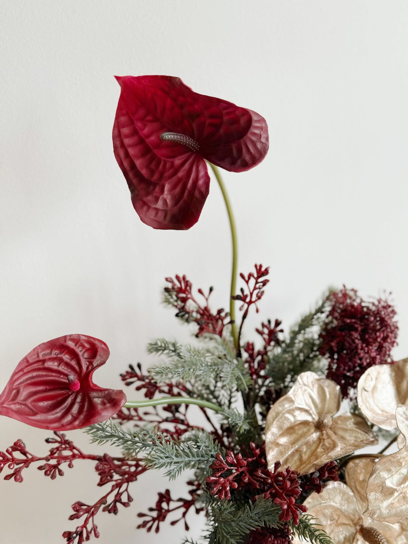 A symphony of deep crimson anthuriums, frosted evergreens, and golden metallic blooms come together in this captivating front-facing arrangement — bold yet graceful, dramatic yet refined.