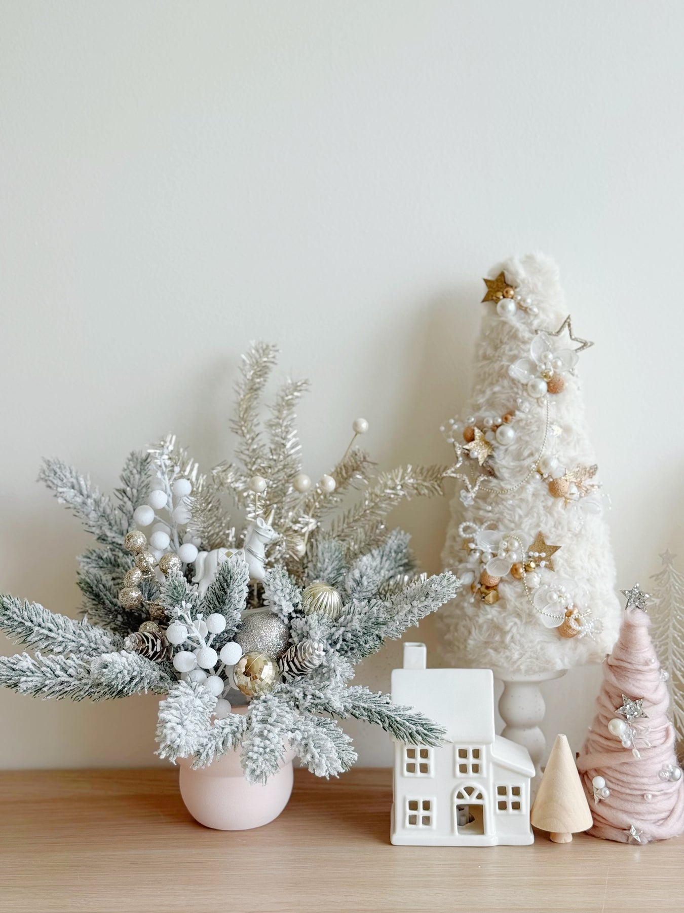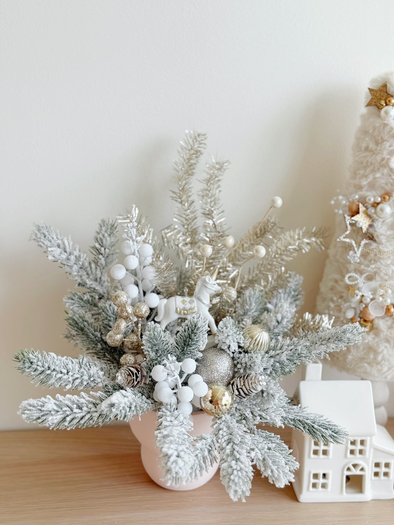Nestled in a matte pinkish-beige porcelain pot, this arrangement balances cozy warmth with frosted elegance — perfect for side tables, entry consoles, or festive corners that deserve a little fairytale glow this Christmas.