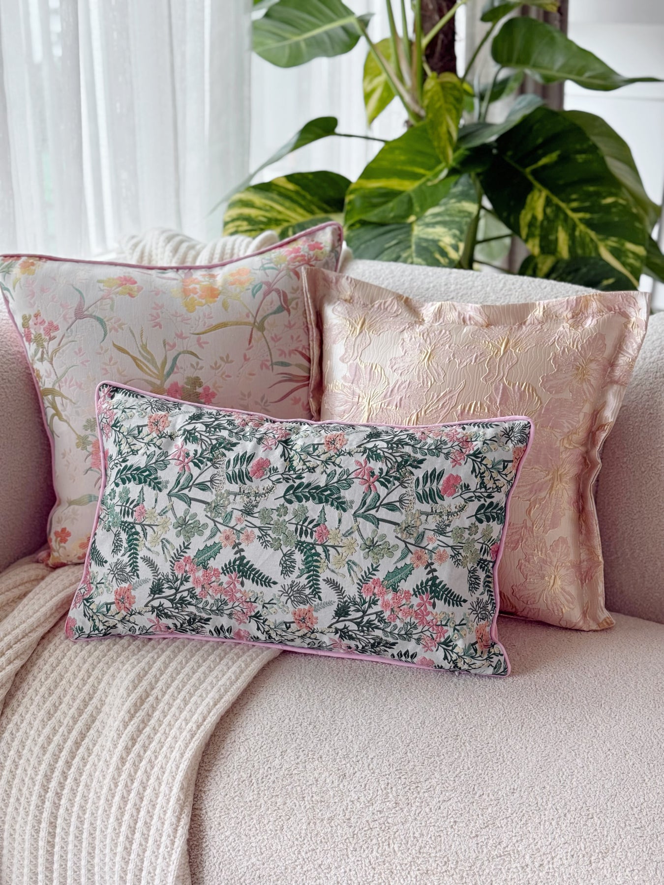 A refined waist cushion designed to add gentle texture and visual interest to your seating space. The front features embossed floral and foliage details that bring depth and dimension, while the pastel pink backing keeps the overall look soft and balanced.
