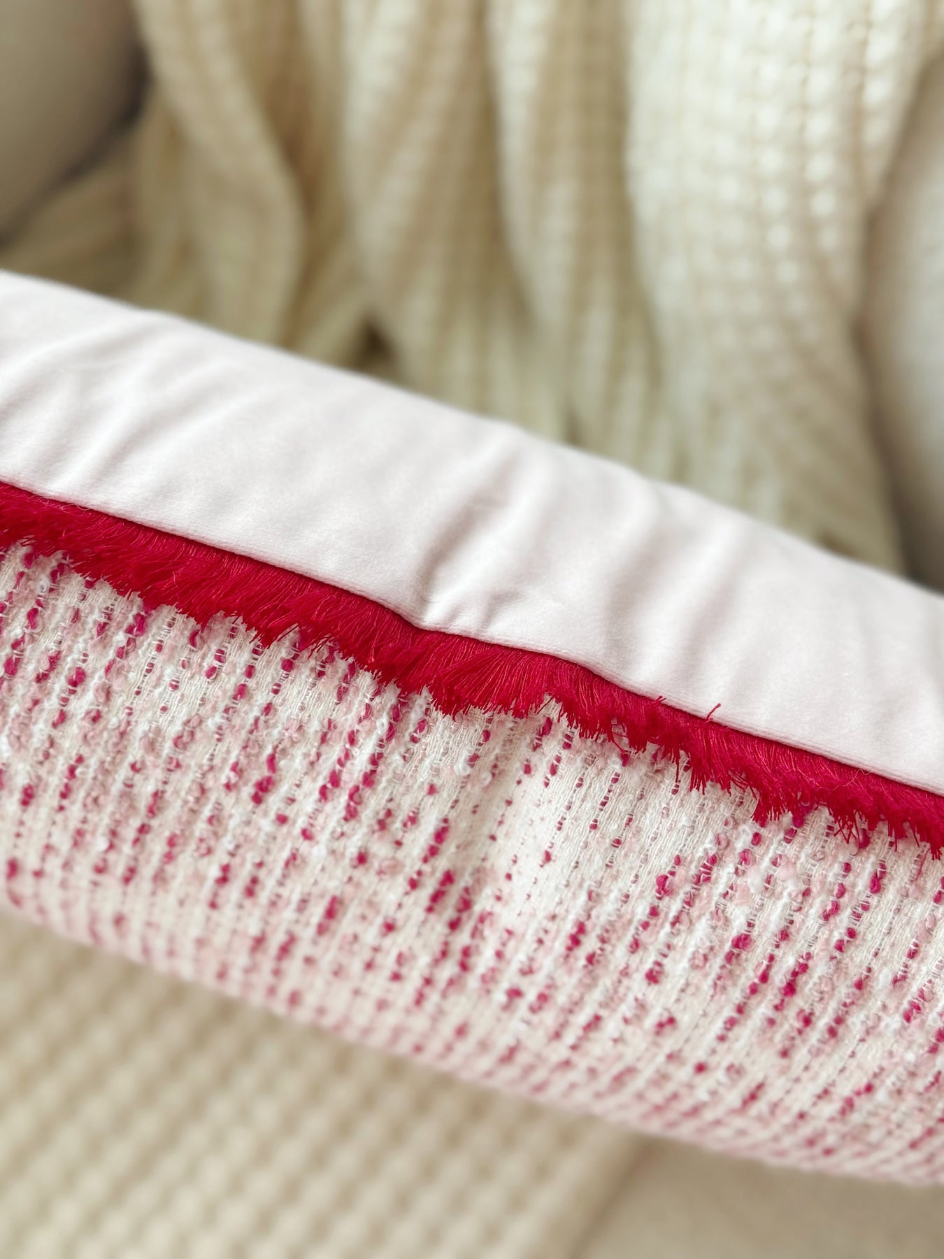 A cosy waist cushion designed to bring character and comfort into your home. The front features the same blush fleck textured fabric, offering soft visual depth and a relaxed charm. Finished with red fringe detailing along the edges, this piece adds a playful yet stylish accent without overpowering the space.
