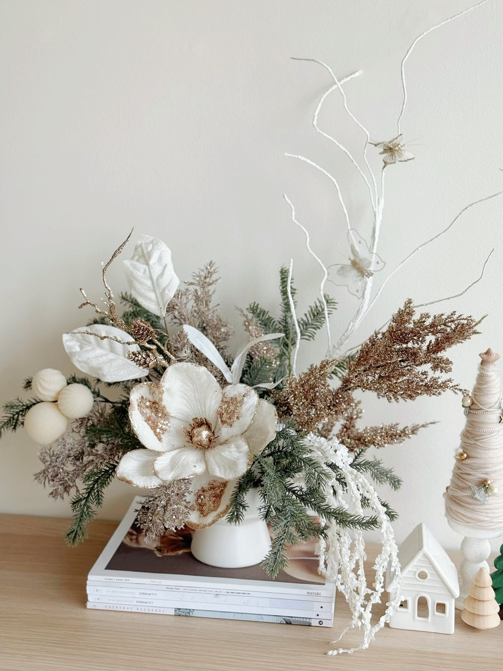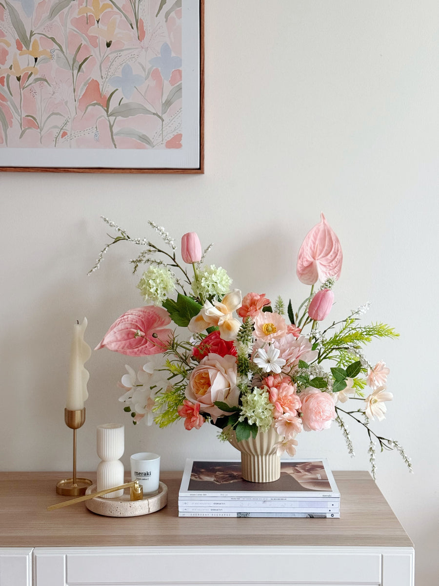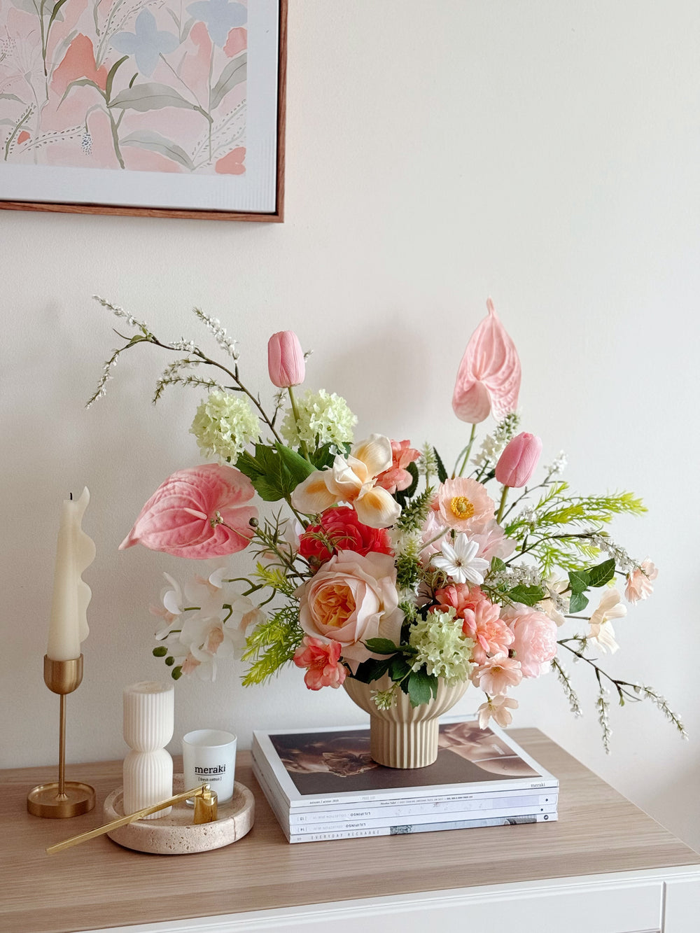 A joyful burst of colour that feels like summer in full swing. Peachy Bloom in the Pot brings together soft peaches, apricots, champagne tones, coral pink pops, fresh greens, and a dash of crisp white — like a scoop of sorbet for your space.
