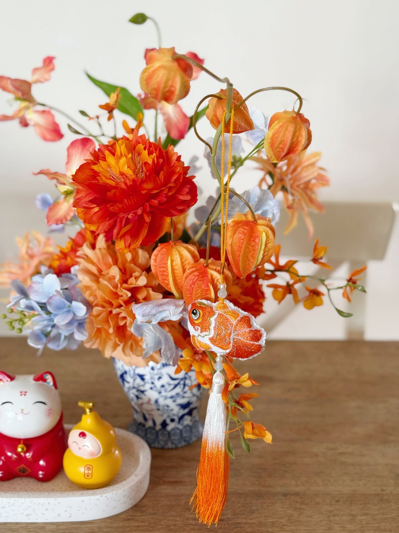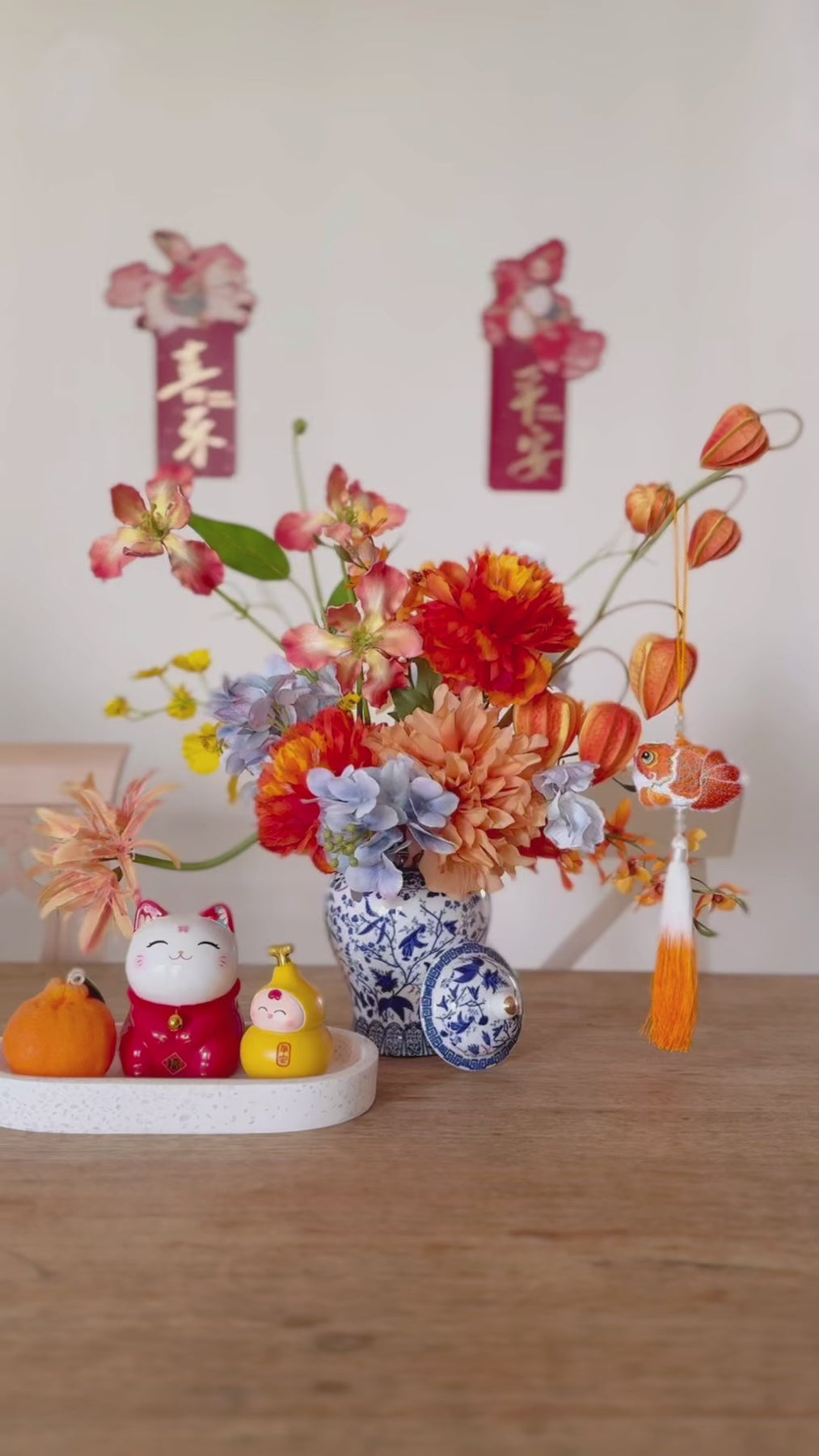 The florals are nestled in a classic blue-and-white porcelain jar, grounding the vibrant blooms with timeless elegance and lending a sense of heritage to the overall look. Bold yet harmonious, festive yet refined — this is a statement piece that celebrates good fortune without overwhelming the space.