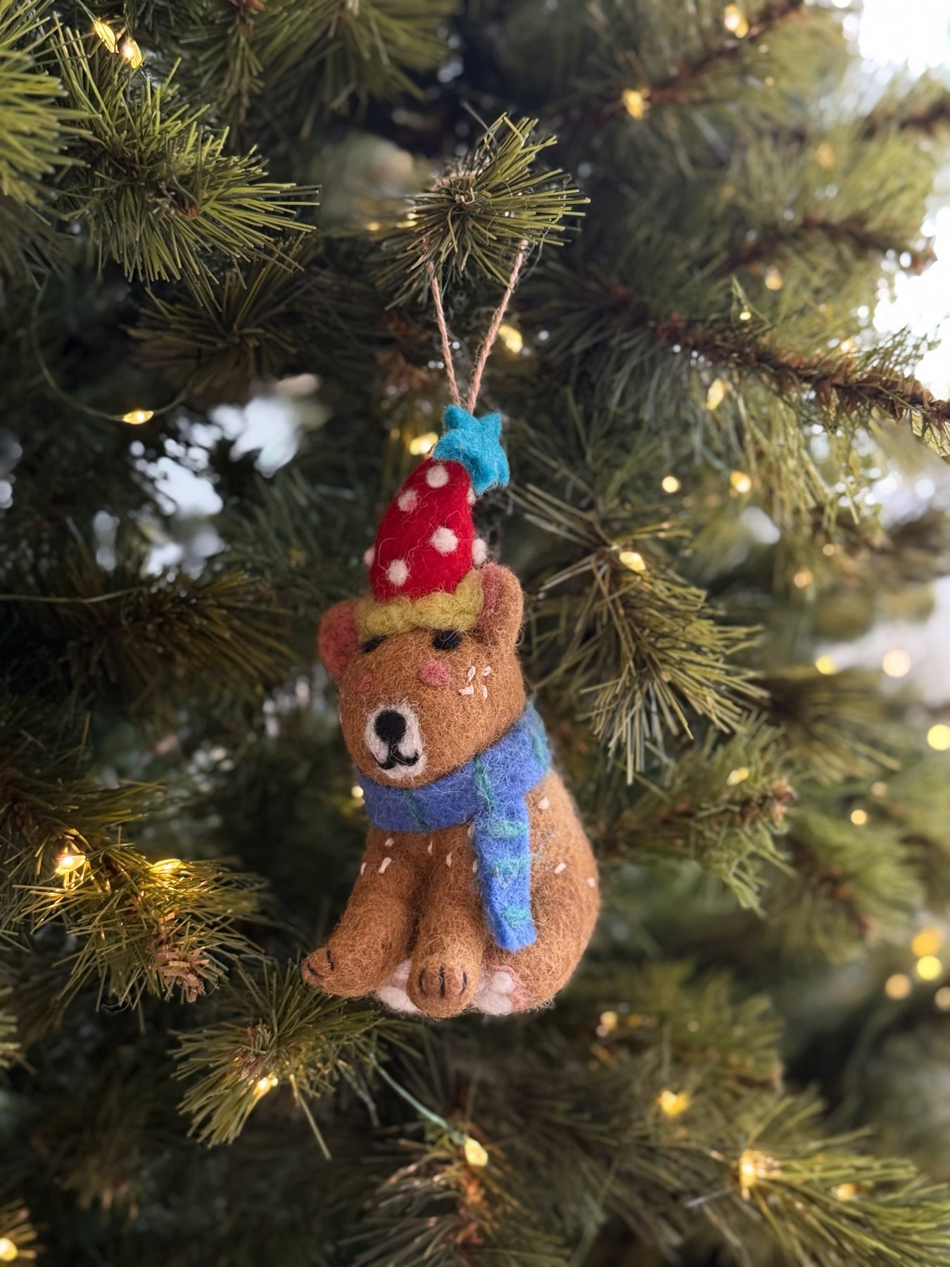 Full of festive cheer, this handmade felt brown bear is all dressed up for the holidays in a bright red polka-dot hat topped with a teal pompom and a cozy blue scarf. With its soft round belly and gentle smile, it brings the sweetest touch of woodland wonder to your Christmas tree.