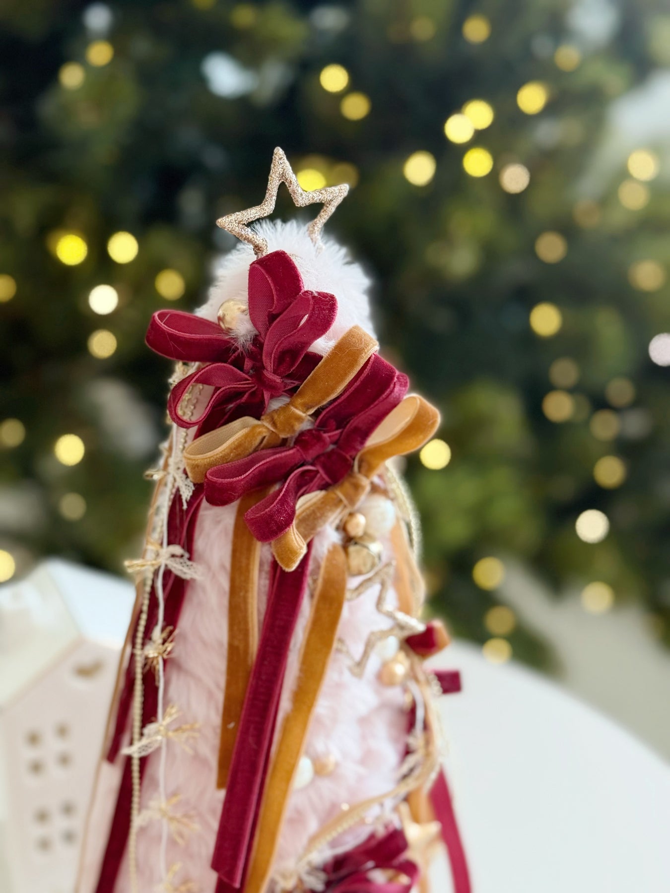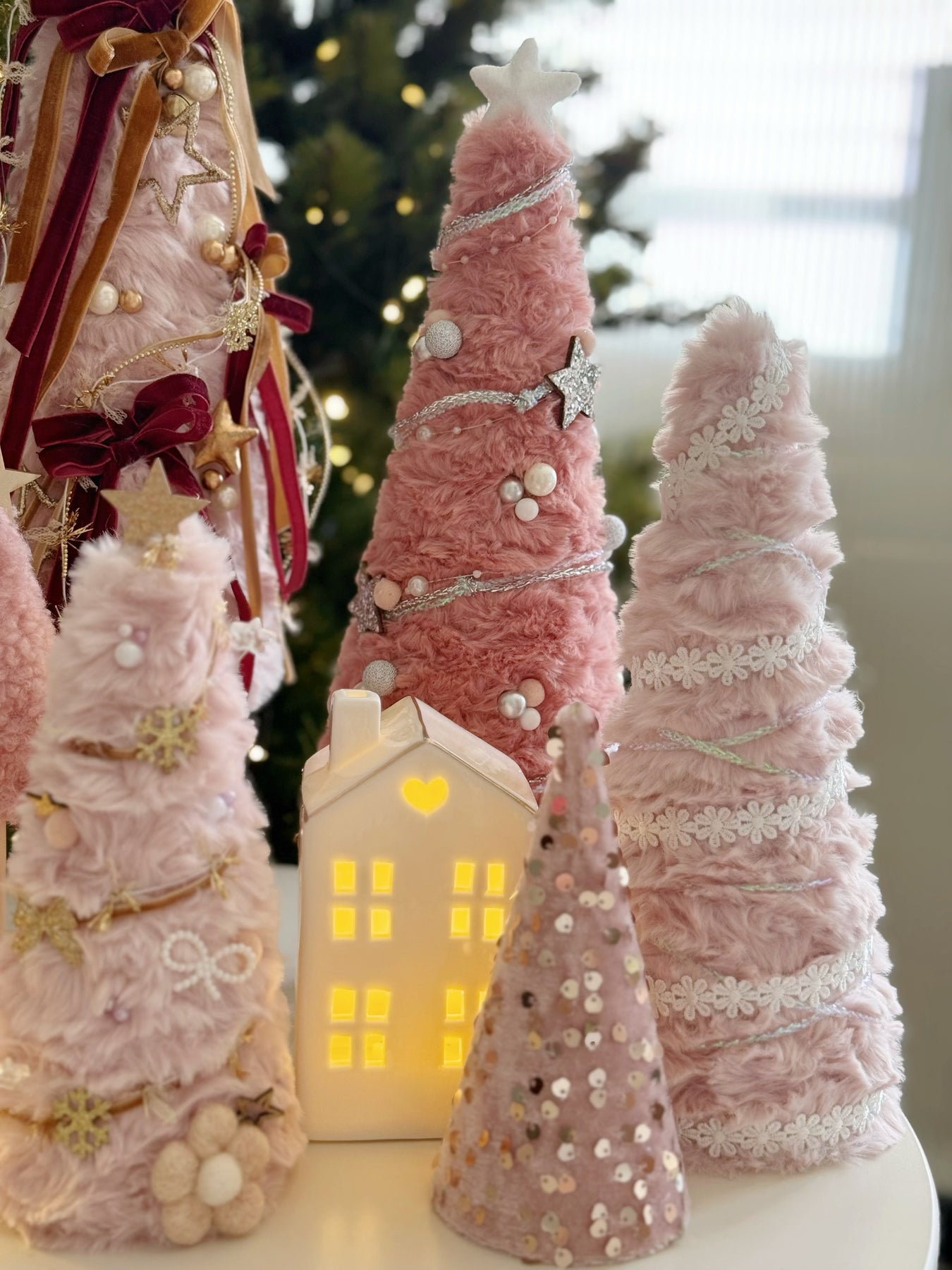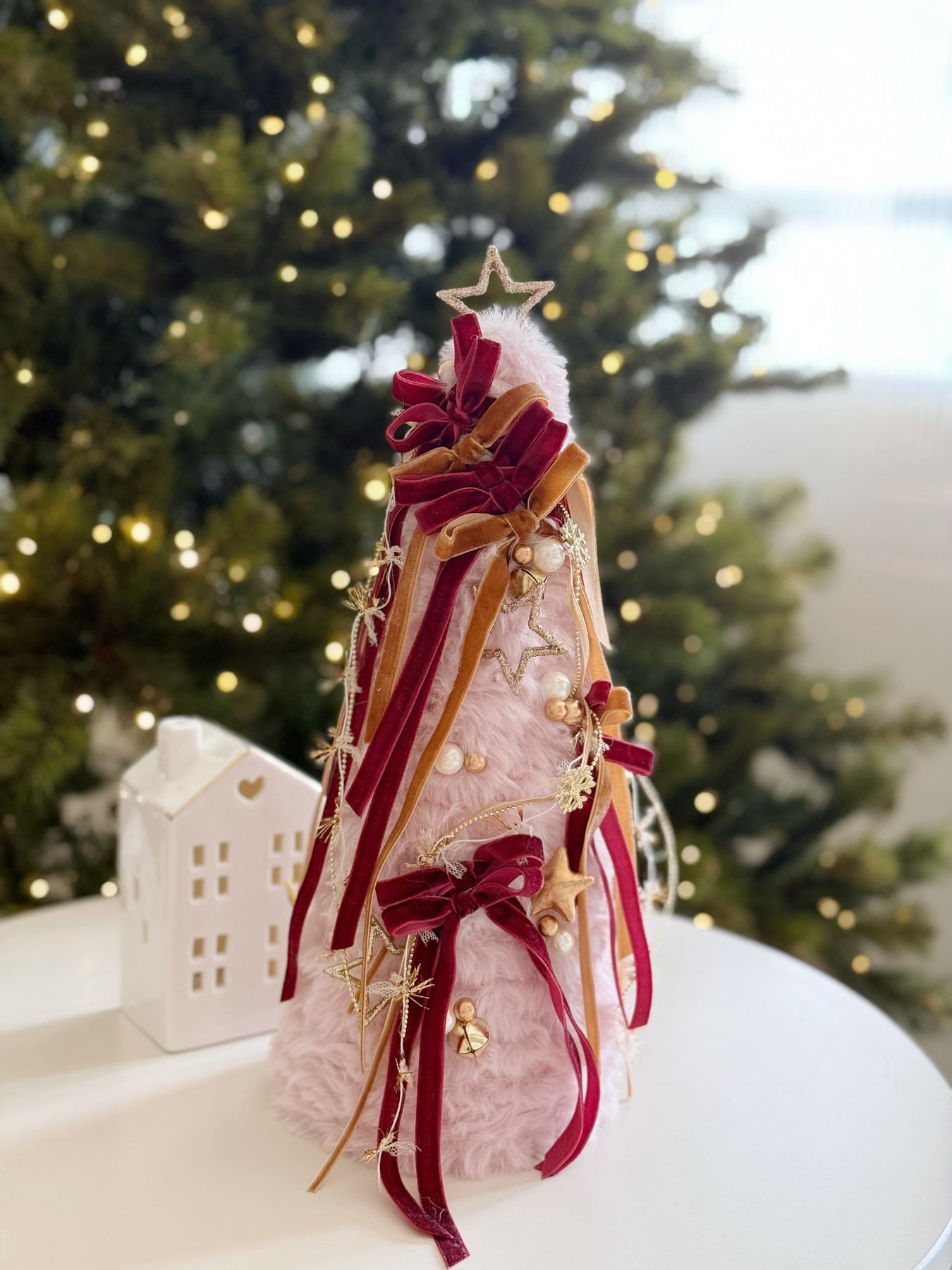 Soft, whimsical, and full of festive charm — the Dreamy Blush Tree Collection brings a touch of pastel magic to your Christmas styling. Each handcrafted tree is lovingly wrapped in shades of light pink, dusty blush, and sweet rose, adorned with dainty embellishments like velvet bows, pearly baubles, and shimmering stars.
