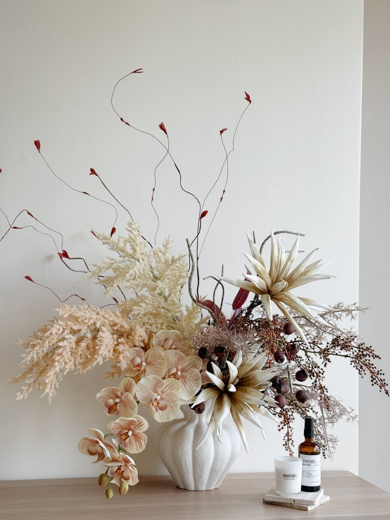 Featuring a thoughtful mix of faux botanicals inspired by dried textures — from feathery plumes and sculptural star-like blooms to delicate orchid accents — this piece brings together earthy tones and organic movement in a way that feels both raw and refined. Each element is carefully placed to mimic the effortless irregularity of wild growth, creating depth, texture, and a sense of stillness.