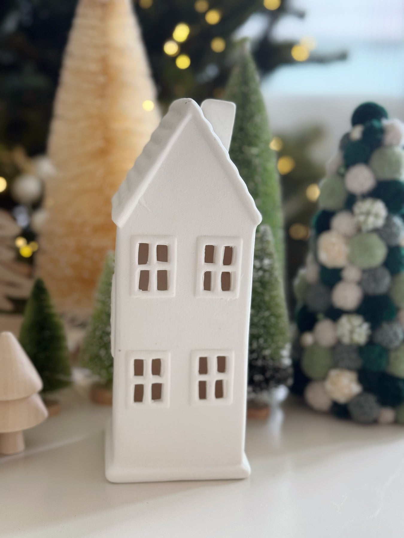 Each Santa is crafted from glossy white porcelain and finished with golden accents on his nose and eyes — a subtle detail that catches the light beautifully. The soft glow from the battery-operated LED shines gently through the star-shaped cutouts, adding a touch of warmth and magic to your festive setup.