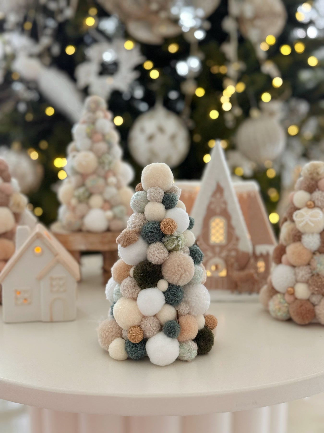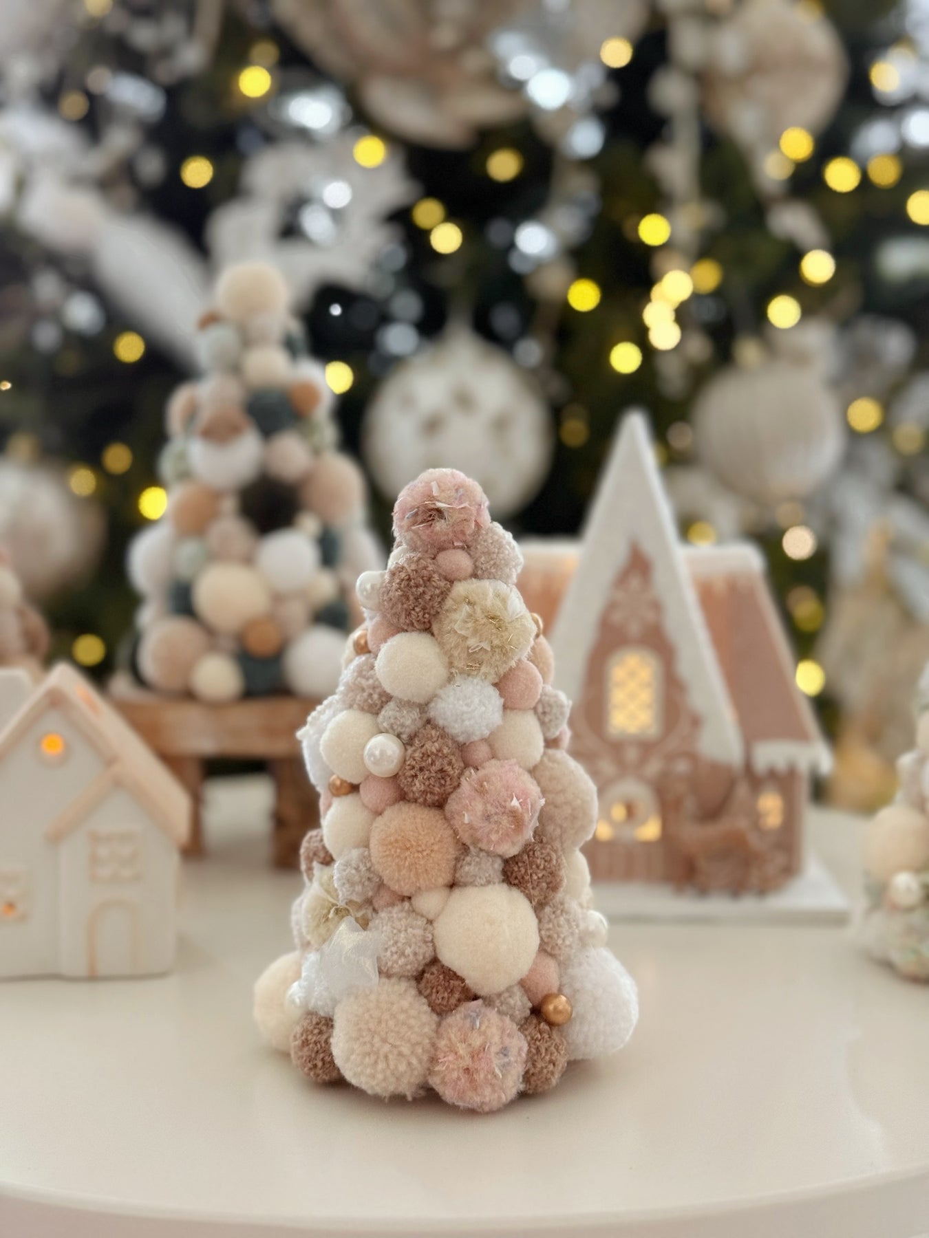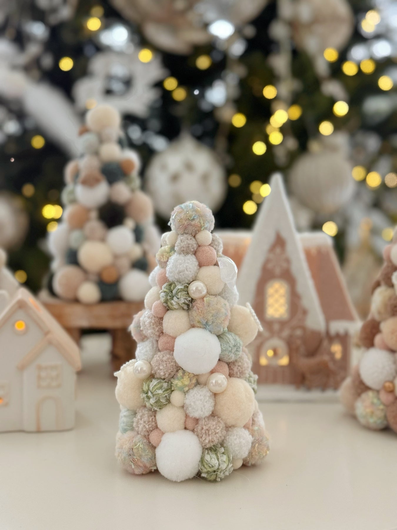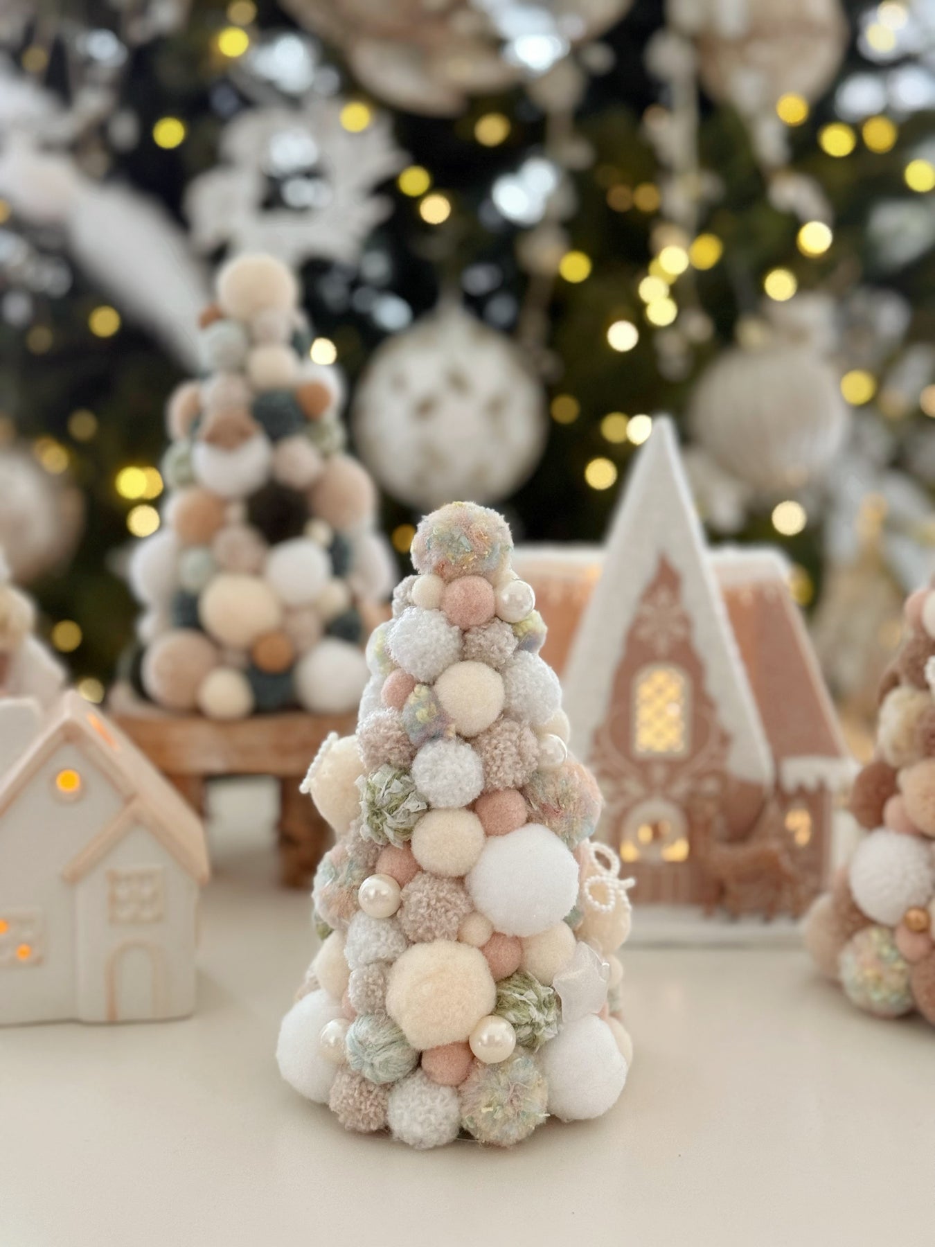 Each piece in our Whimsical Pom Pom Tree Collection is lovingly handmade — layer by layer, with a medley of fluffy pom poms, textured yarns, and pearly accents in soothing pastel tones. The result: a cozy, heartwarming piece that brings festive magic with a modern, soft-touch charm.