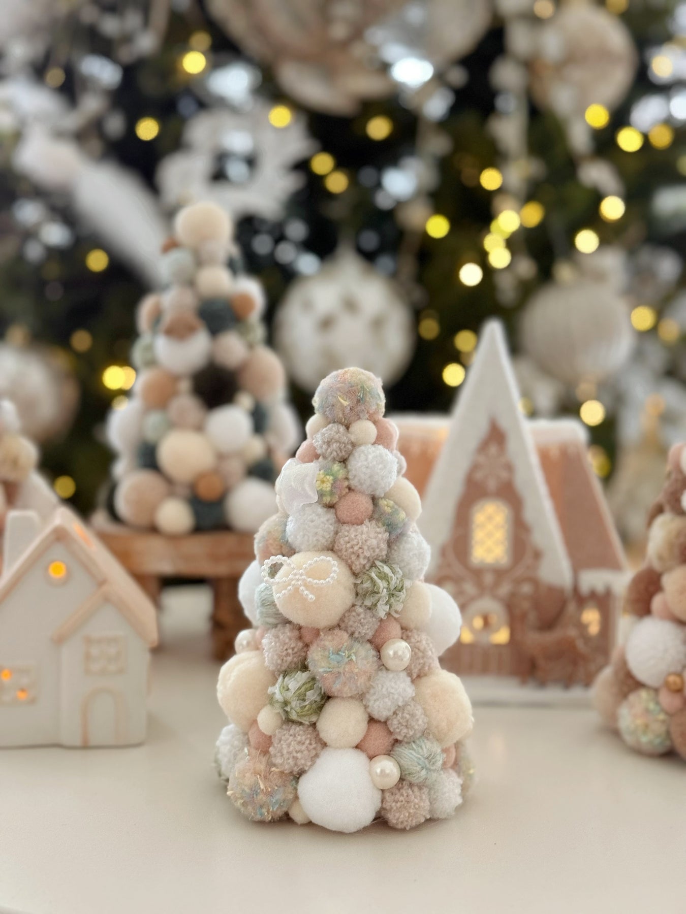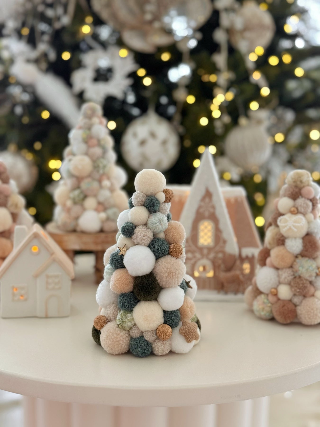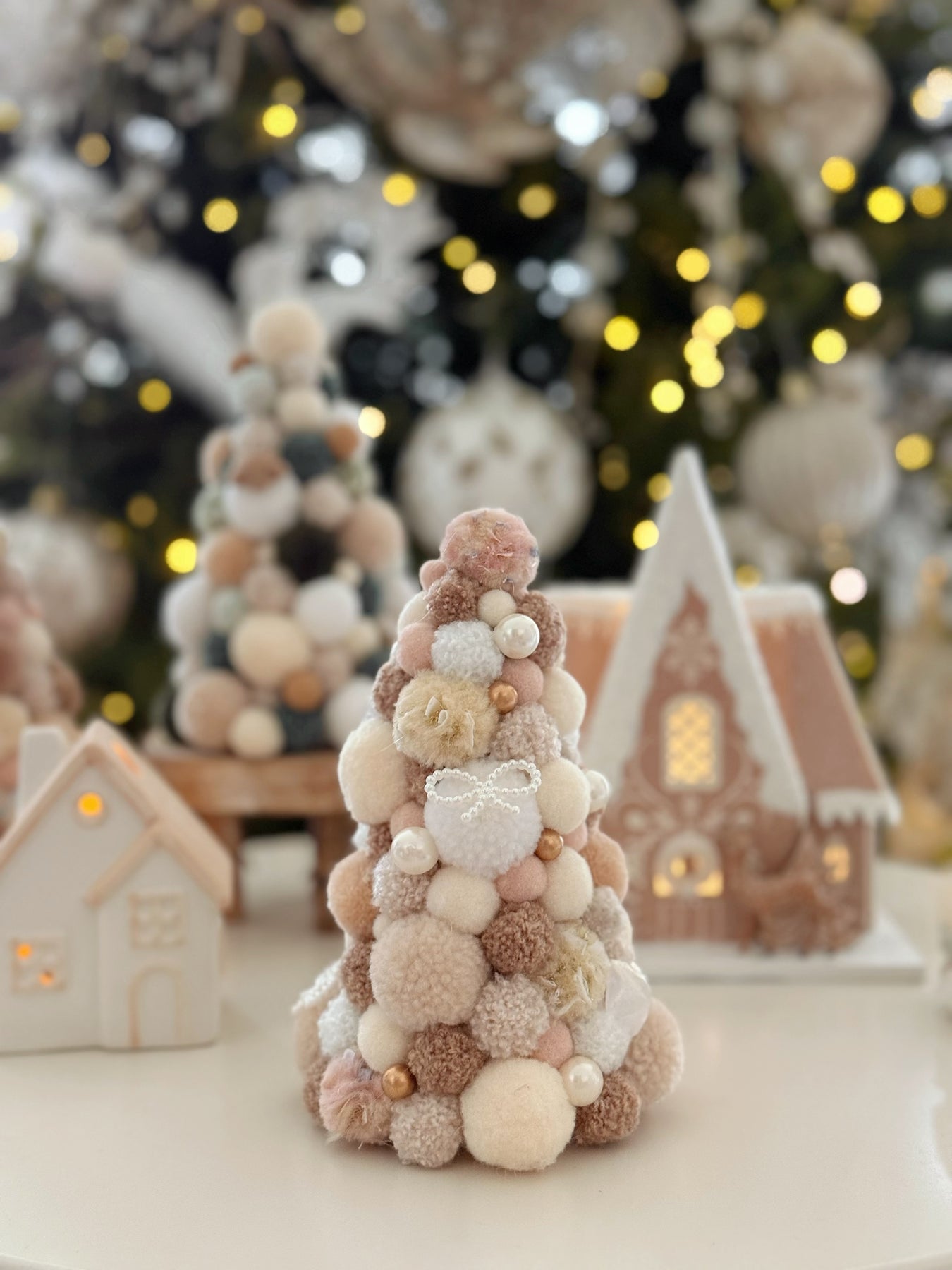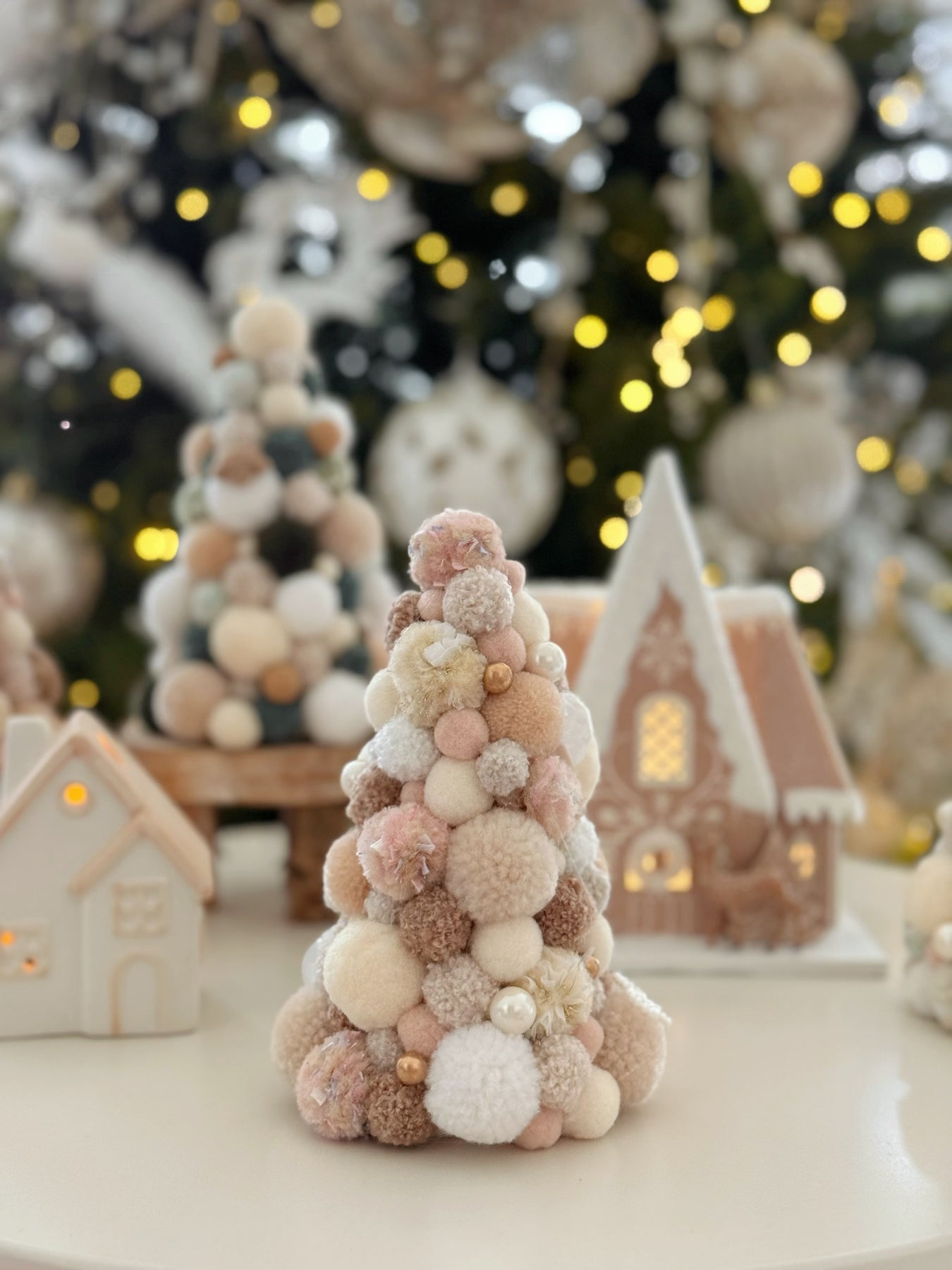 Each piece in our Whimsical Pom Pom Tree Collection is lovingly handmade — layer by layer, with a medley of fluffy pom poms, textured yarns, and pearly accents in soothing pastel tones. The result: a cozy, heartwarming piece that brings festive magic with a modern, soft-touch charm.