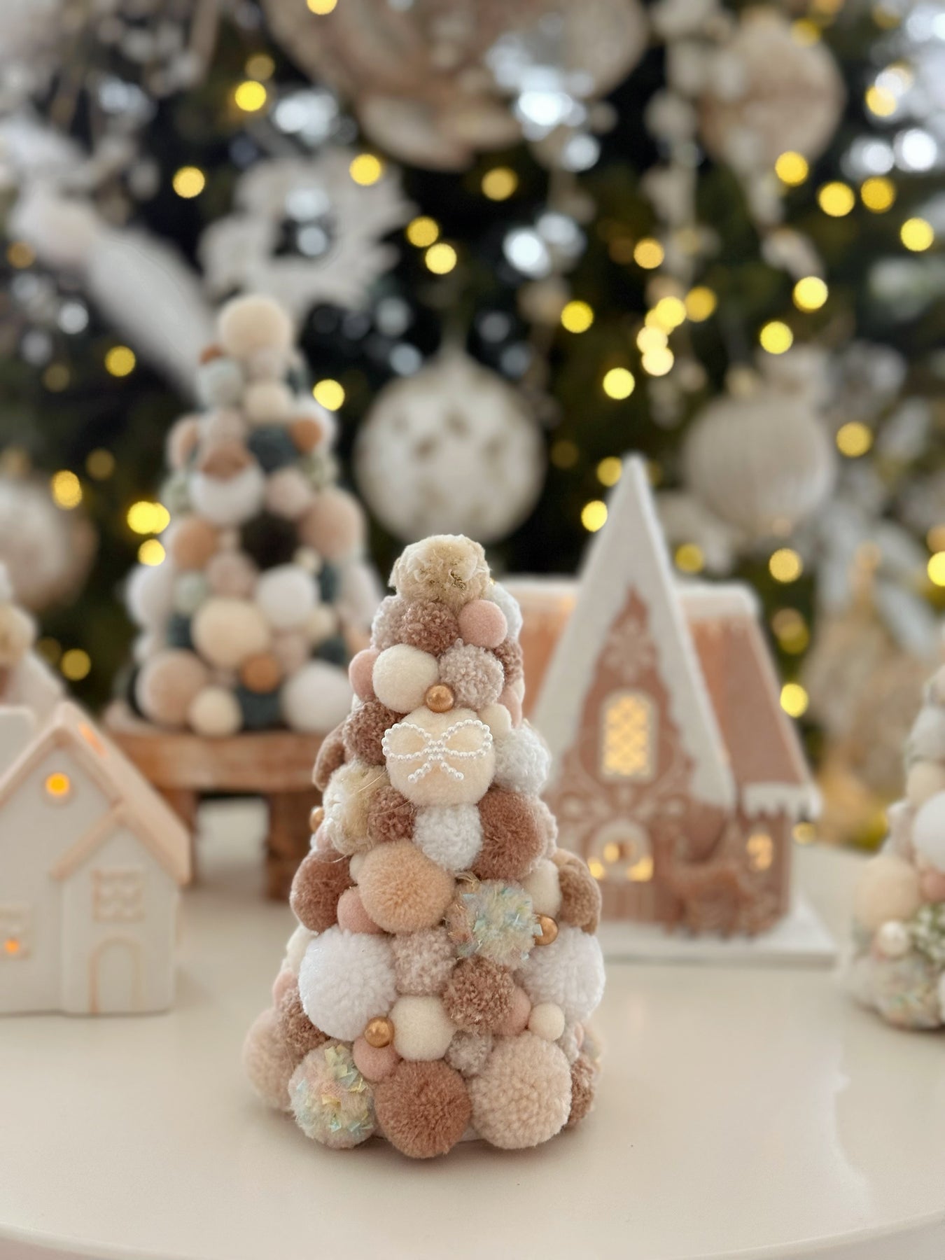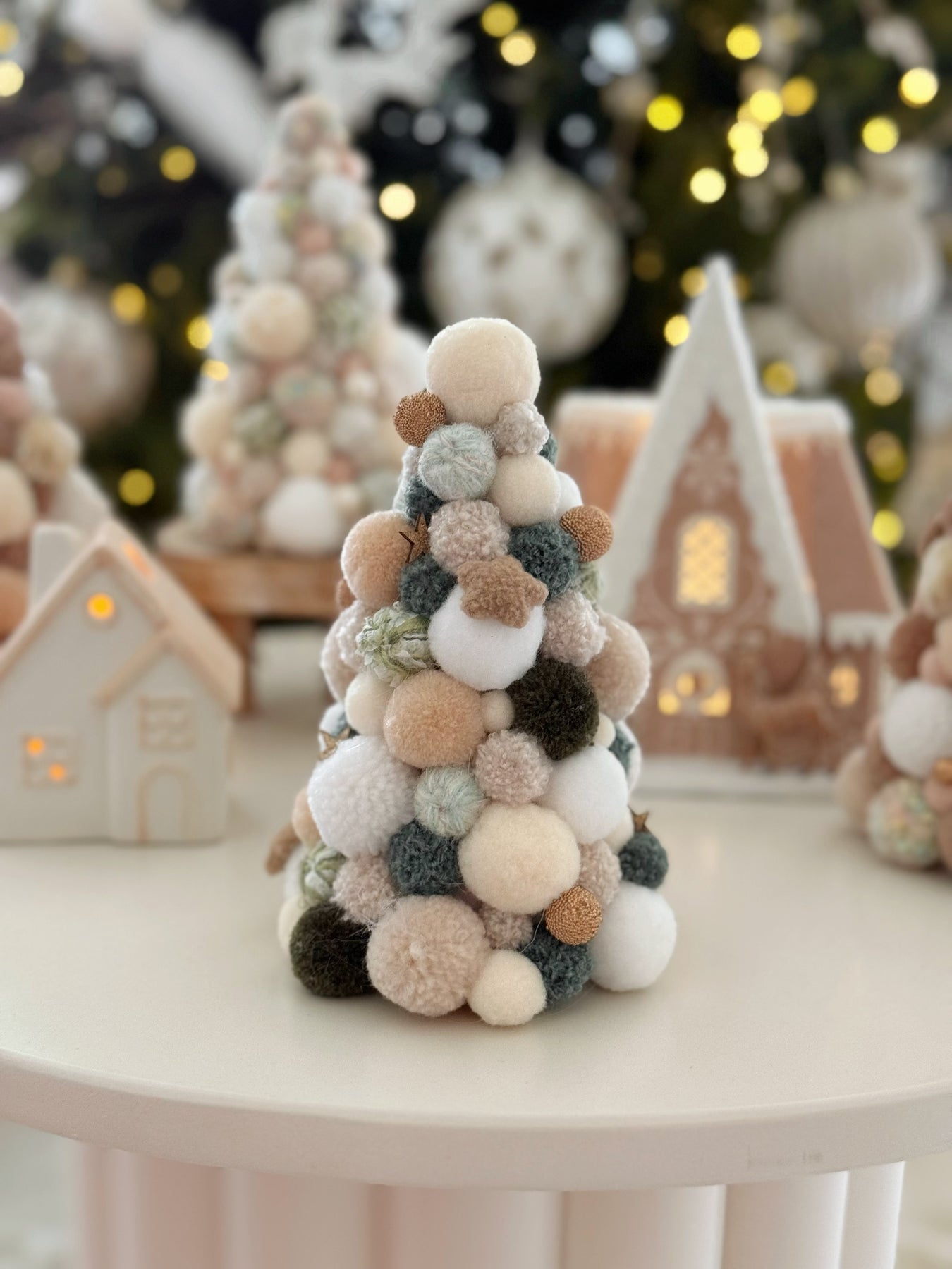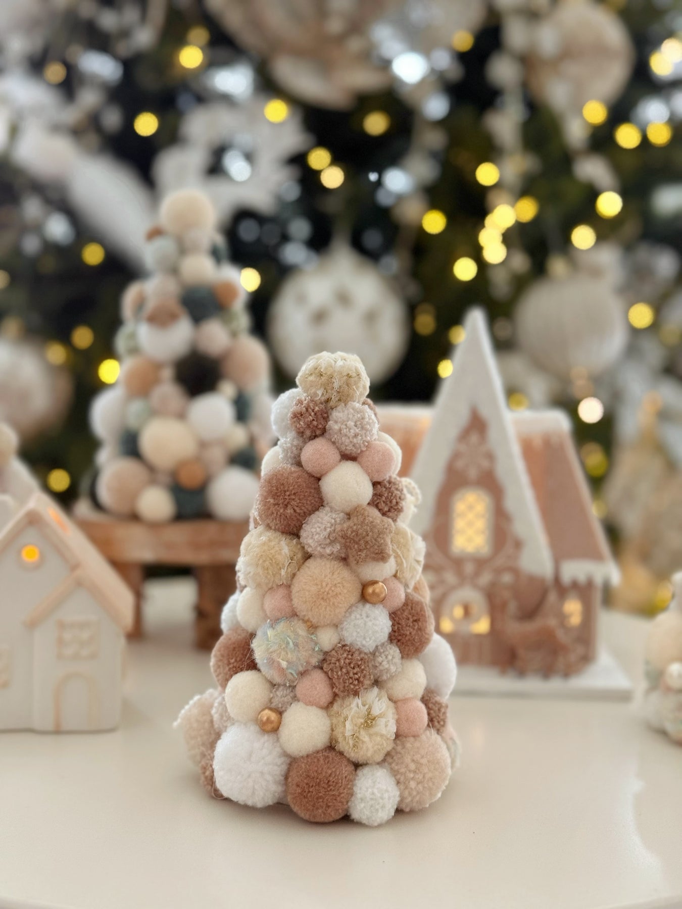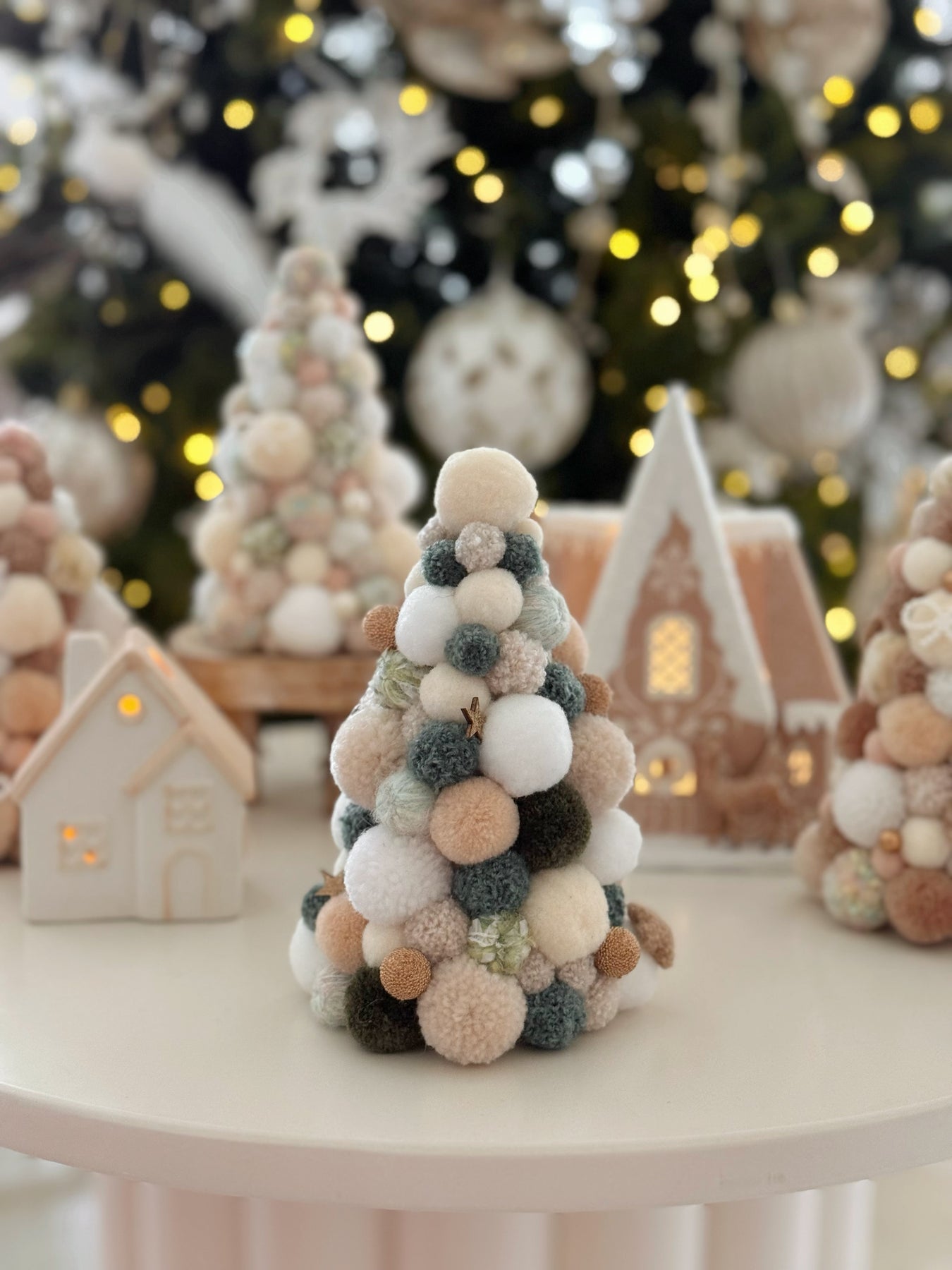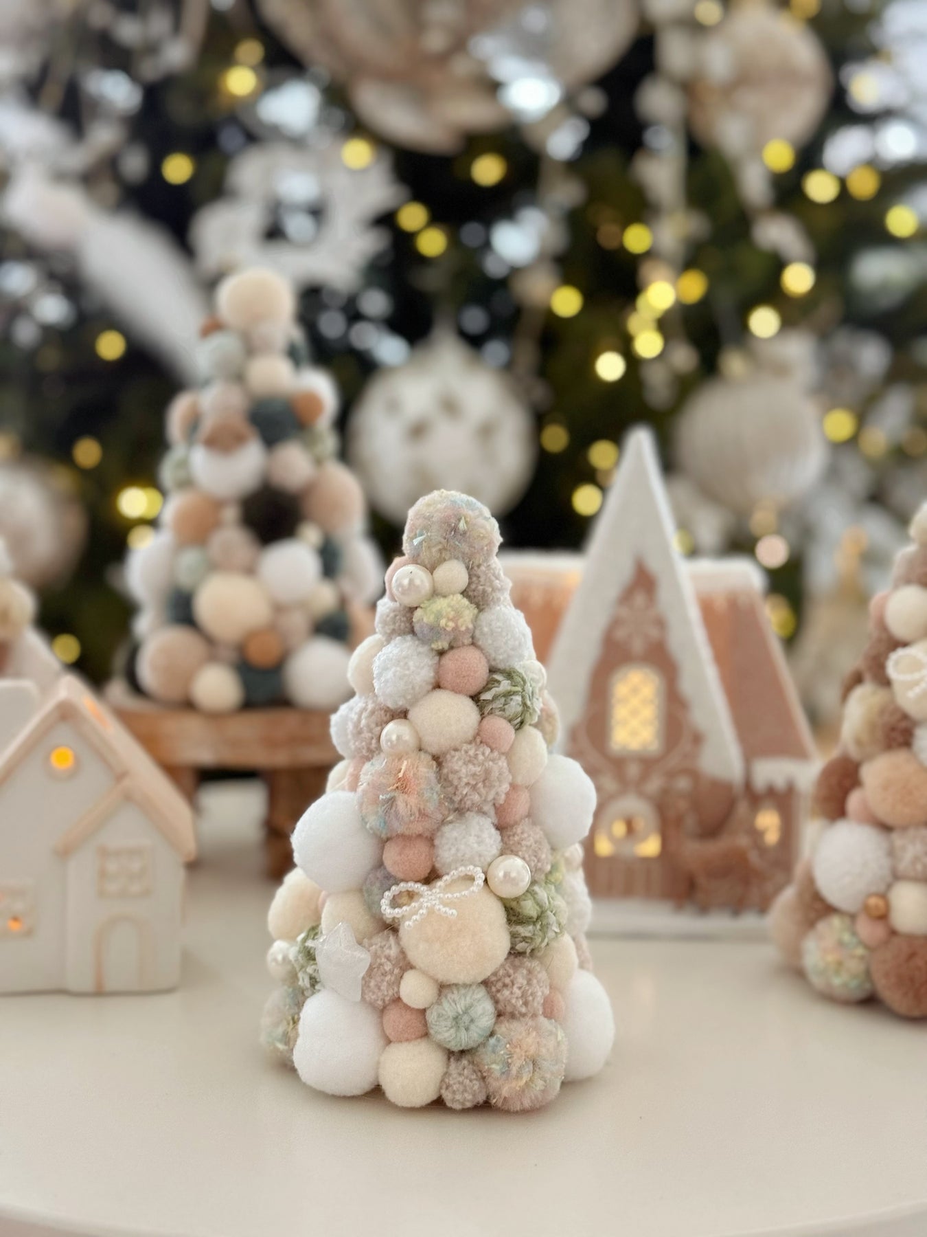Each piece in our Whimsical Pom Pom Tree Collection is lovingly handmade — layer by layer, with a medley of fluffy pom poms, textured yarns, and pearly accents in soothing pastel tones. The result: a cozy, heartwarming piece that brings festive magic with a modern, soft-touch charm.