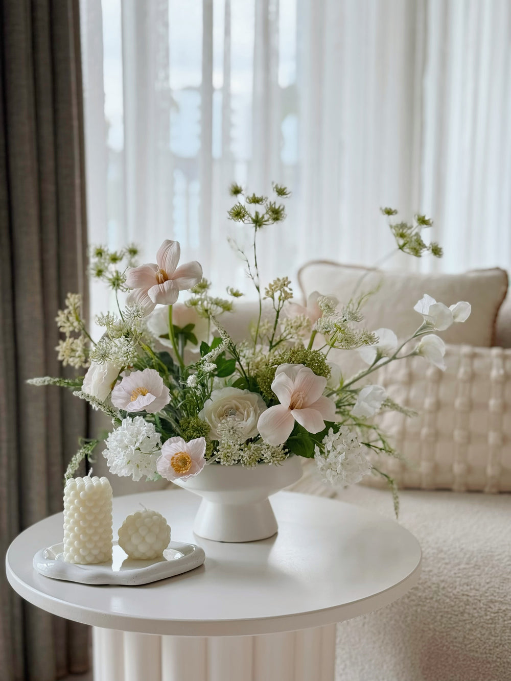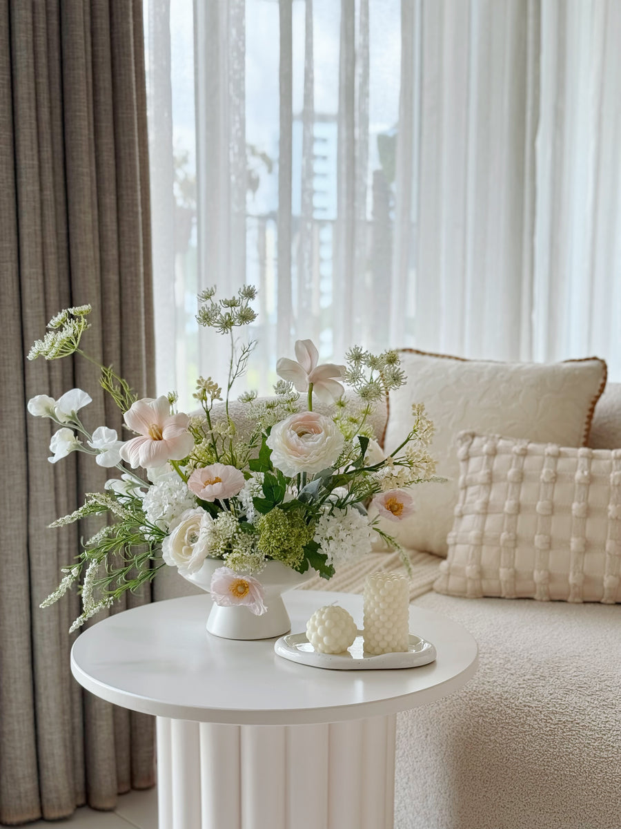 Every stem is thoughtfully placed in a semi-matt white porcelain pot that complements the soft palette while keeping the look timeless and versatile. Whether styled on a side table, console, or shelf, this piece is made to lift your space — no watering, no wilting, just quiet beauty all day, every day.