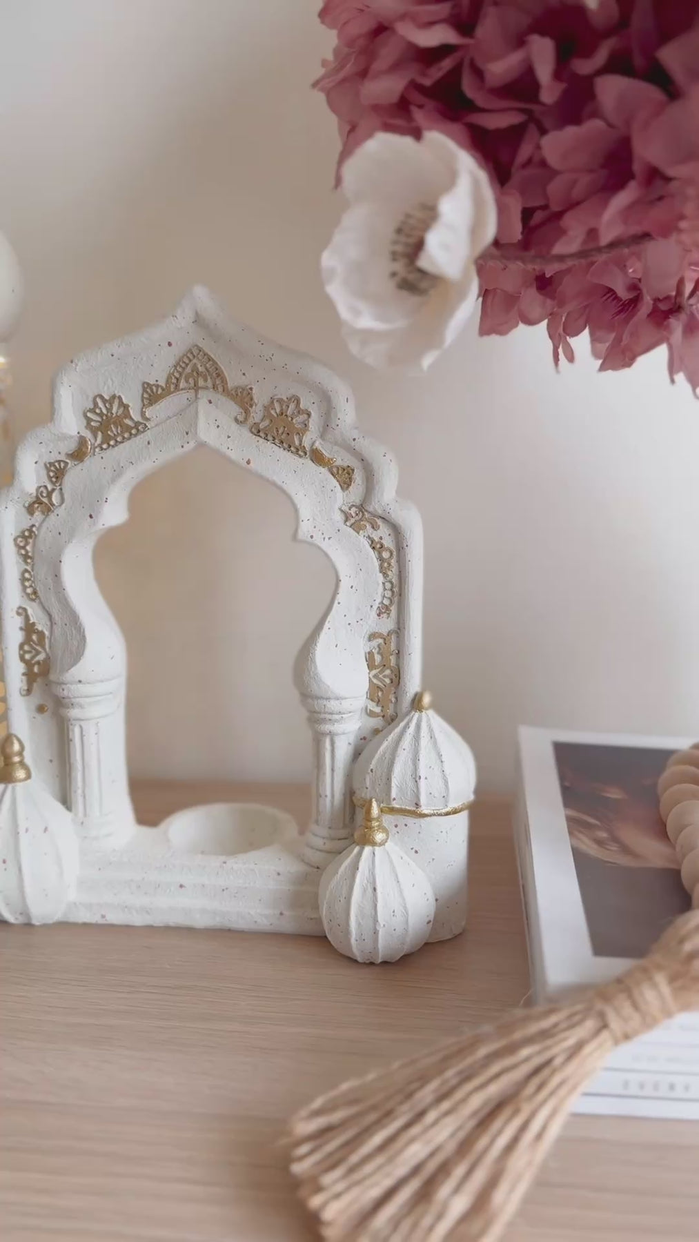 The Noor Arch Tealight Holder is designed with an ornate arch frame, featuring delicate textures and subtle gold highlights that elevate its presence. When paired with a tealight, it casts a warm, gentle glow — yet it remains equally elegant when displayed on its own.