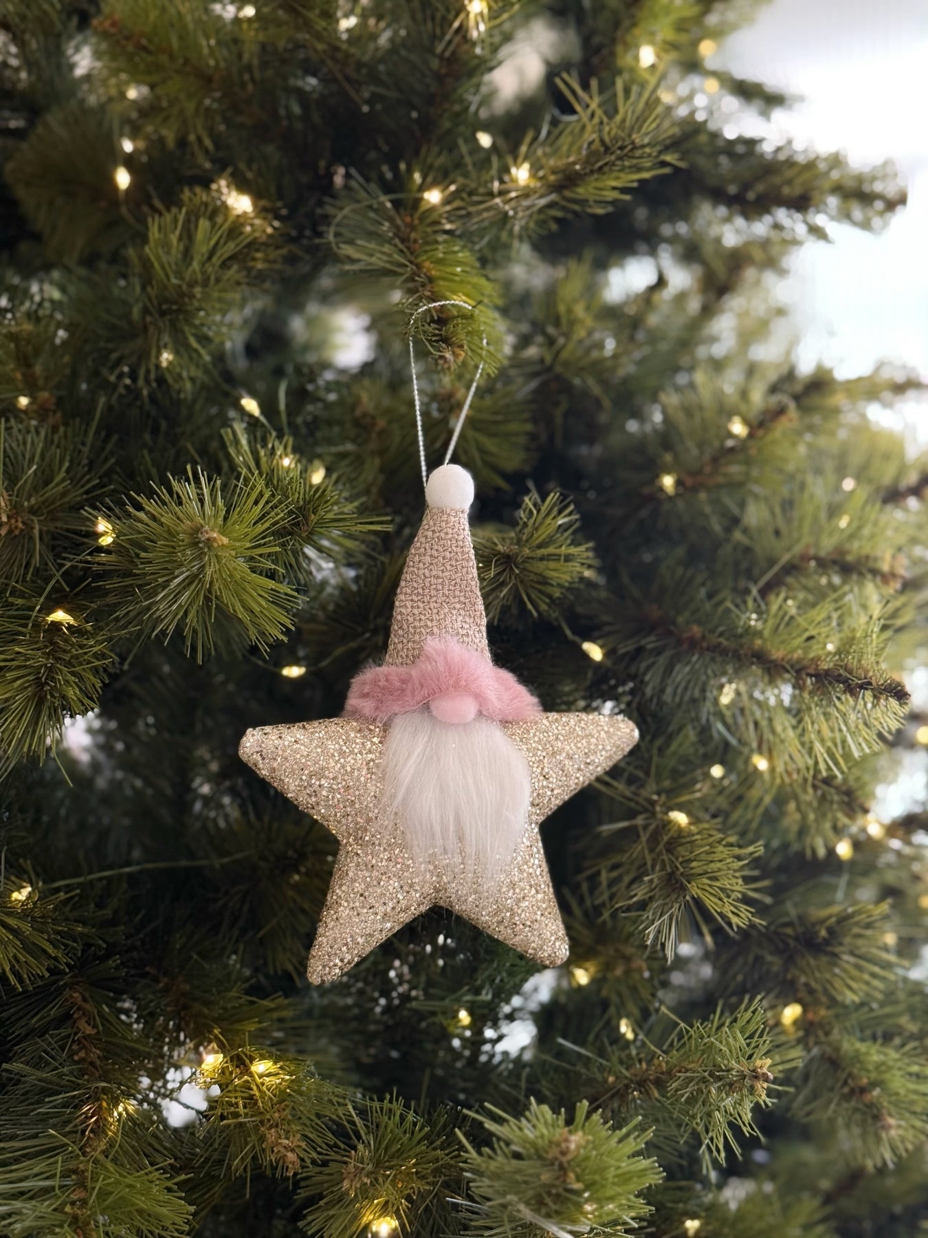 This adorable gnome ornament comes in the shape of a glittering star, complete with a fluffy pink beard, cozy knit hat, and soft white pom pom. Each piece is full of texture and personality, adding a touch of whimsy to your tree or garland.