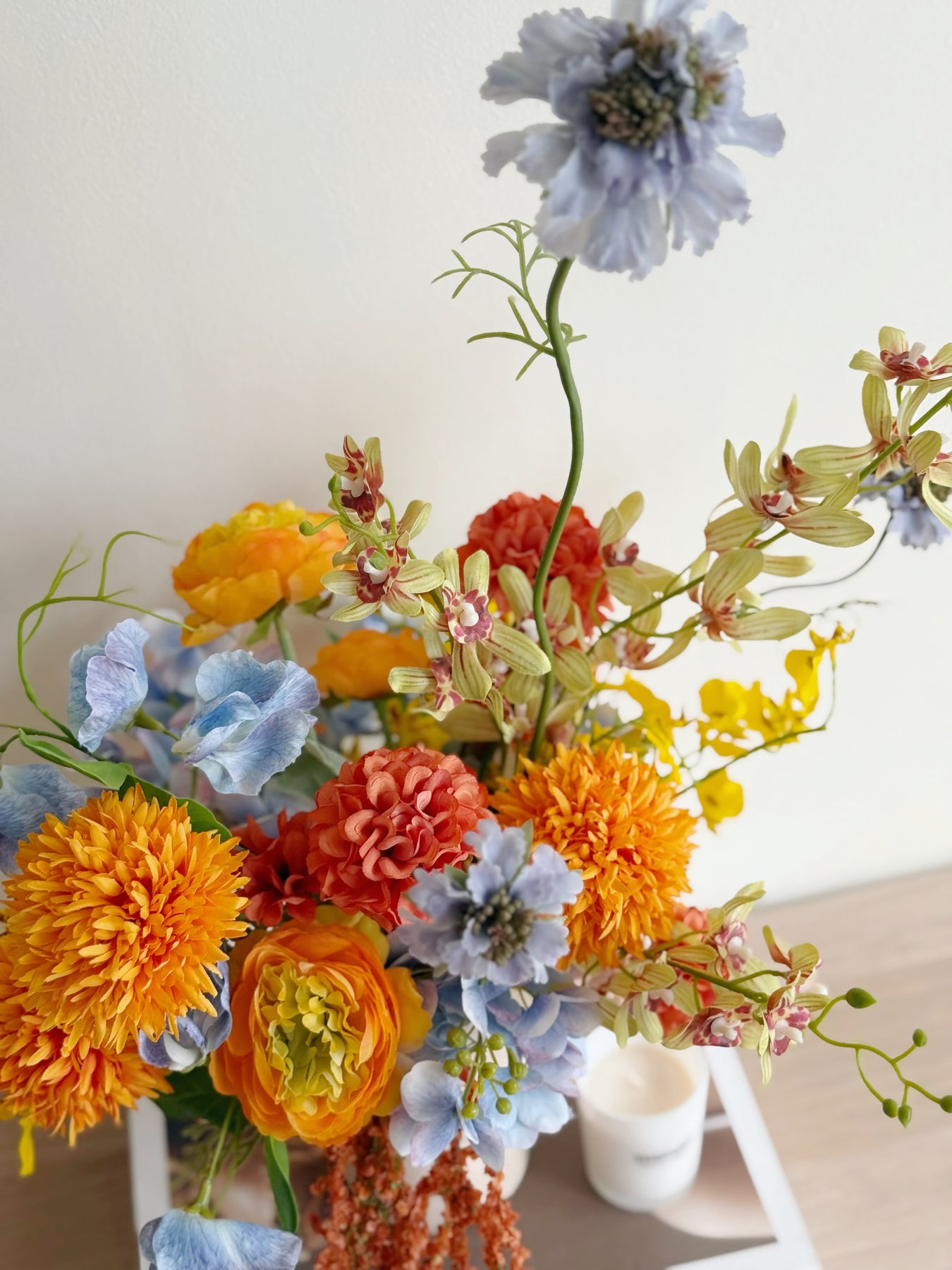 Sunshine Bloom Medley brings together a vibrant mix of warm yellows, glowing oranges, and soft sky blues — a palette that feels bright, lively, and full of positive energy. The colours play off one another beautifully, creating a joyful composition that feels both uplifting and easy on the eyes.